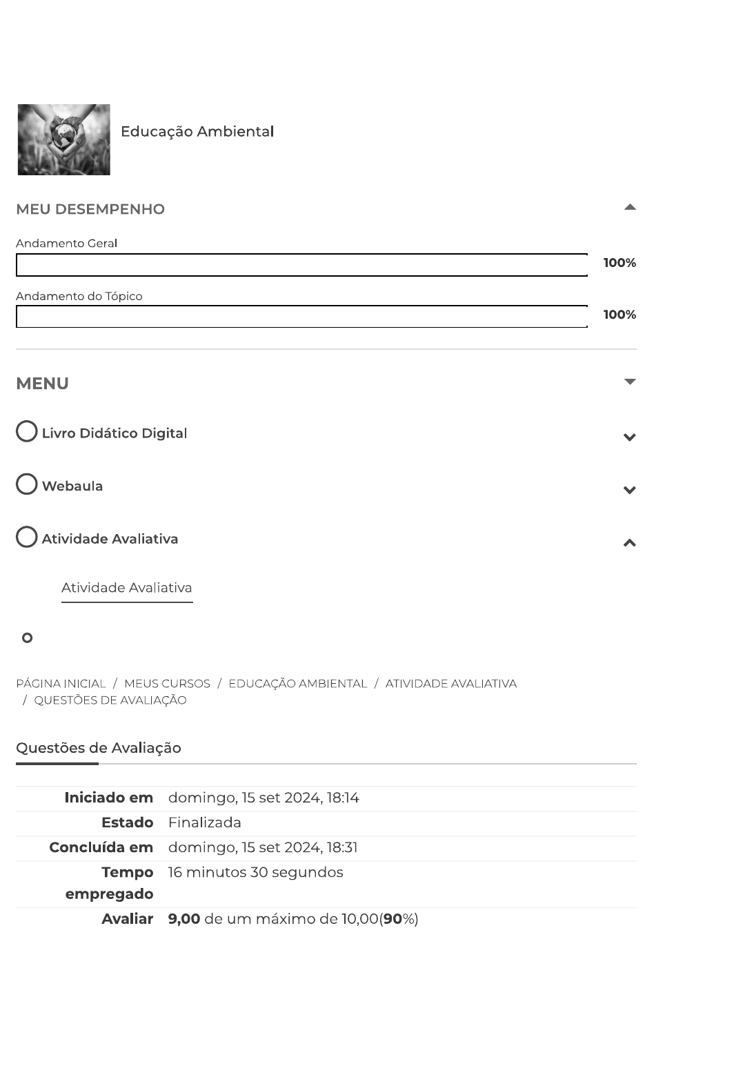 <p>Educação Ambiental MEU DESEMPENHO Andamento Geral 100% Andamento do Tópico 100% MENU Livro Didático Digital Webaula Atividade Avaliativa Atividade Avaliativa PÁGINA INICIAL / MEUS CURSOS / EDUCAÇÃO AMBIENTAL / ATIVIDADE AVALIATIVA / QUESTÕES DE AVALIAÇÃO Questões de Avaliação Iniciado em domingo, 15 set 2024, 18:14 Estado Finalizada Concluída em domingo, 15 set 2024, 18:31 Tempo 16 minutos 30 segundos empregado Avaliar 9,00 de um máximo de 10,00(90%)</p><p>Correto Atingiu 1,00 de 1,00 Todo e qualquer programa de controle da poluição das águas precisa ter um conjunto de diretrizes objetivas e claras, nas quais precisam nortear a política de controle a ser aplicada, sendo que as medidas de controle objetivam reduzir os poluentes presentes em efluentes líquidos. Sobre as diretrizes que podem ser estabelecidas visando redução de poluentes, analise as afirmativas a seguir: I. É preciso estabelecer a aplicação de padrões de qualidade da água. II. Deve-se conhecer os pontos de emissão de poluentes. III. É preciso estabelecer parâmetros e tratamento de efluentes antes de lançar em rios. IV. Deixa de ser necessário a participação da sociedade, sendo responsabilidade de empresas as condições ambientais em fundos de vale. Considerando contexto apresentado, é correto que se afirma em: Escolha uma: a. II e IV, apenas. b. I, e III, apenas. C. e III, apenas. d. III e IV. e. le II, apenas.</p><p>Correto Atingiu 1,00 de 1,00 Questionar atual modelo de produção e consumo e apresentar propostas de mudança foram os objetivos dos Diálogos para Desenvolvimento Sustentável realizado no Rio de Janeiro. Os Diálogos foram uma iniciativa do governo brasileiro e fazem parte da programação oficial da Rio+20. A urgência de colocar em prática um novo modelo de produção e consumo foi reforçada no debate pelos especialistas que compuseram painel "A economia do Desenvolvimento Sustentável, incluindo padrões sustentáveis de produção e consumo". Mediante exposto, assinale a alternativa correta que traz um exemplo de mudança nos padrões de produção e consumo que contribuirá para desenvolvimento sustentável: Escolha uma: a. Reduzir a quantidade de água nos processos produtivos quando possível, e lançar efluente em rios sem tratamento prévio. b. Aumentar a fonte de poluentes atmosféricos, tendo em vista aumento de transportes e crescimento da frota de veículos. C. Reduzir fontes alternativas de energia, tais como usinas eólicas, coletores solares, pois são ineficazes para produção de energia. d. Diminuir a quantidade de resíduos sólidos, que devem ser produzidos na menor quantidade possível, sendo aplicável a prática dos 3Rs. e. Acumular bens desnecessários para contribuir com a economia, aumentando consumo impulsivo de produtos.</p><p>Correto Atingiu 1,00 de 1,00 A degradação é um tema que tem sido bastante discutido, a cada dia homem tem interferido mais no meio ambiente, na maioria das vezes de maneira negativa, e que tem acontecido em relação a essa ação descontrolada do homem sobre meio ambiente é a própria natureza reagindo em torno de si mesma por conta dessas ações. A poluição degrada meio ambiente, afetando as características físicas e/ou químicas de determinado ecossistema, sendo assim, a poluição pode ser de origem natural ou Sendo a poluição tendo origem de atividades humanas. Tomando como referência a poluição analise as afirmativas a seguir: I. Poluição que tem origem a erupção de vulcões. II. Poluição decorrente de derramamento de petróleo no oceano. III. Poluição oriunda de queimadas descontroladas. IV. Poluição proveniente do lançamento de resíduos em lixões. É correto que se afirma em: Escolha uma: a. II e IV, apenas. b. III, apenas. C. II, III e IV, apenas. d. apenas. e. I, e III, apenas.</p><p>Correto Atingiu 1,00 de 1,00 A necessidade e a importância da reciclagem dos resíduos sólidos advêm de um conjunto de fatores, sendo que a obtenção da matéria-prima constitui principal fator de economia. Em seguida tem-se a economia com a redução dos consumos de energia elétrica e de água. Uma das formas de incentivar a reciclagem é por meio das Educação Ambiental. A prática apresentada no texto traz uma situação de reciclagem voltada a prática da Assinale a alternativa que trata desta prática. Escolha uma: a. Reduz os efeitos das chuvas ácidas em cidades. b. Reduz as chances de formação das ilhas de calor nas áreas urbanas. C. Reduz a utilização de matérias-primas nas indústrias de bens de consumo. d. Diminui buraco na camada de ozônio nos distritos industriais. e. Diminui os efeitos da poluição atmosférica das indústrias têxteis.</p><p>Correto Atingiu 1,00 de 1,00 A poluição é modificação prejudicial em um ambiente onde se encontra instalada uma forma de vida qualquer; para outros, essa forma de vida tem de ser homem, e outros mais a entendem como alteração ecológica nociva, direta ou indiretamente, à higidez humana. Sob ponto de vista ecológico se trata de uma modificação das características do meio bem como perturbação aos ecossistemas. Sobre a poluição da água, leia as afirmativas a seguir: I. A poluição natural da água pode ser causada por erosão, folhas, escoamento superficial e despejo de indústria química. II. A poluição hídrica de origem pode ser causada pelo lançamento de despejos industriais sem tratamento prévio. III. Uma das causas da poluição da água é a falta de tratamento de esgoto antes de lançar em rios. IV. Para controlar a poluição das águas, se faz necessário entender a qualidade da água, bem como os parâmetros a serem analisados. É correto que se afirma em: Escolha uma: a. I, II e III, apenas. b. apenas. C. e III, apenas. d. II, III e IV, apenas. e. I, apenas.</p><p>Correto Atingiu 1,00 de 1,00 Um programa de reciclagem é uma boa forma de atuação de educação ambiental nas escolas, na qual pode-se cri