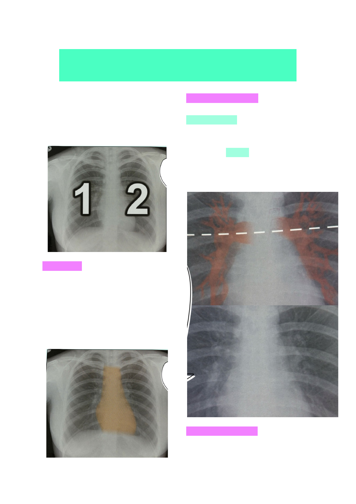 <p>Radiografi� d� Tór�</p><p>Anatomia Normal</p><p>1 – Lado direito do paciente</p><p>2 – Lado esquerdo do paciente</p><p>Imaginar que o paciente está de frente para</p><p>você.</p><p>MEDIASTINO</p><p>O mediastino é o compartimento</p><p>central da cavidade torácica, marcado em</p><p>laranja.</p><p>Ele contém o coração, grandes vasos,</p><p>esôfago, traqueia, nervo frênico, nervo vago,</p><p>cadeia simpática, ducto torácico, timo e</p><p>linfonodos centrais.</p><p>PADRÕES VASCULARES</p><p>Artérias e veias ramificam-se</p><p>VERTICALMENTE para os lobos superiores e</p><p>inferiores.</p><p>Os vasos dos lobos superiores têm</p><p>um diâmetro MENOR que os vasos dos lobos</p><p>inferiores em um em uma radiografia ereta.</p><p>Acontece o contrário no caso de uma</p><p>hipertensão venosa pulmonar.</p><p>MARCAS PULMONARES</p><p>As marcas são os vasos sanguíneos</p><p>nos pulmões.</p><p>ESTRUTURAS ANATÔMICAS NORMAIS</p><p>1 – Traquéia;</p><p>2- Carina (nível de T5);</p><p>3 – Arco/botão aórtico;</p><p>4 – Aorta Torácica descendente;</p><p>5 – VE;</p><p>6 – Hemidiafragma esquerdo;</p><p>7 – Hemidiafragma direito;</p><p>8 – Átrio direito;</p><p>9 – Veia cava Superior</p><p>OUTRAS ESTRUTURAS ANATÔMICAS</p><p>NORMAIS…</p><p>1 – Clavícula;</p><p>2 – Costela posterior;</p><p>3- Costela anterior;</p><p>4- Ângulo costofrênico D;</p><p>5 Ângulo costofrênico E;</p><p>6- Hilo direito;</p><p>7- Hilo esquerdo;</p><p>8- Ápice pulmonar.</p><p>ANATOMIA PULMONAR…</p><p>1 – Traquéia;</p><p>2- Carina;</p><p>3- Brônquio principal esquerdo,</p><p>4- Brônquio principal direito;</p><p>5- Brônquio do do LSE;</p><p>6- Brônquio do LIE;</p><p>7- Brônquio do LSD;</p><p>8- Brônquio do Lobo intermediário;</p><p>9- Brônquio do LM;</p><p>10- Brônquio do LID.</p><p>LOBOS PULMONARES</p><p>1- lobo superior direito;</p><p>2- Lobo Médio;</p><p>3- Lobo inferior direito;</p><p>4- Lobo superior esquerdo;</p><p>5- Lobo inferior esquerdo;</p><p>6- Fissura Horizontal;</p><p>7- Fissura Oblíqua direita;</p><p>8- Fissura Oblíqua esquerda.</p><p>Qualidade da Radiografia -</p><p>Rotação</p><p>Qualidade da Radiografia -</p><p>Inspiração</p><p>Apresentação de um RX de</p><p>Tórax</p><p>“Esta é uma radiografia de tórax em PA da</p><p>sra .... Tirada no dia ...”</p><p>A: Traquéia está centrada/sem desvios;</p><p>B: Os pulmões estão expandidos</p><p>uniformemente e os campos pulmonares são</p><p>claros.</p><p>C: O tamanho do coração é normal, não há</p><p>desvio mediastinal, os contornos</p><p>mediastinais e os hilos aparecem normais.</p><p>D: Não há nenhuma fratura ou anormalidade</p><p>óssea;</p><p>E: Não há nenhuma evidência de ar embaixo</p><p>do diafragma, enfisema cirúrgico ou qualquer</p><p>corpo estranho.</p><p>Em resumo, esta é uma radiografia normal</p><p>de tórax.</p><p>A-B-C-D-E</p><p>A é de AIRWAY (VIA AÉREA);</p><p>B é de BREATHING (RESPIRAÇÃO);</p><p>C é de CIRCULAÇÃO;</p><p>D é de DISABILITY (INCAPACIDADE);</p><p>E é de EVERYTHING ELSE (TODAS AS</p><p>OUTRAS COISAS).</p><p>A - VIA AÉREA</p><p>OQUE PROCURAR EM VIA AÉREA?</p><p>Começar em cima e acompanhar a</p><p>traqueia (1) até o final, ela deve estar na linha</p><p>mediana, ela divide-se na carina (2),</p><p>originando os brônquios principais direito (4)</p><p>e esquerdo (3).</p><p>À esquerda, ocorre a divisão para</p><p>brônquio do LSE (5) e Brônquio do LIE (6).</p><p>À direita origina-se o brônquio do</p><p>LSD (7) e brônquio intermediário (8), e dele</p><p>origina-se o brônquio do LM (9) e brônquio</p><p>do lobo inferior (10).</p><p>DESVIO TRAQUEAL E ÂNGULO DA</p><p>TRAQUEIA.</p><p>B – BREATHING (RESPIRAÇÃO)</p><p>Preto = ar</p><p>branco = ausência de ar.</p><p>1) Os pulmões estão uniformemente</p><p>expandidos?</p><p>2) Comparar os campos pulmonares e</p><p>procurar as áreas brancas (sombras) -</p><p>COMPARAR AS ÁREAS</p><p>3) Olhar em torno das margens de cada</p><p>pulmão</p><p>4) Olhar os ângulos costofrênicos</p><p>5) Procurar as quatro silhuetas</p><p>4 SILHUETAS:</p><p>i) Bordo cardíaco direito;</p><p>ii) Bordo cardíaco esquerdo;</p><p>iii) Hemidiafragma direito;</p><p>iv) Hemidiafragma esquerdo.</p><p>Em caso de borramento das silhuetas pensar</p><p>em atelectasias ou consolidações.</p><p>O QUE PROCURAR?</p><p>● Consolidações;</p><p>● Broncograma aéreo;</p><p>● Atelectasias;</p><p>● Pneumonectomias;</p><p>● Massas solitárias e múltiplas;</p><p>● Lesão pulmonar escavada;</p><p>● Fibrose;</p><p>● Pneumotórax;</p><p>● Derrame pleural;</p><p>● Edema pulmonar.</p><p>CONSOLIDAÇÕES/ OPACIDADE DE ESPAÇO</p><p>AÉREO</p><p>● Substituição do ar alveolar por líquido,</p><p>células, pus ou outro material.</p><p>● Pneumonia</p><p>Características:</p><p>● Opacidades focais: hipotransparências</p><p>não uniformes, sem margem bem</p><p>delimitada.</p><p>● Densidade lobar ou segmentar: a</p><p>densidade deve corresponder</p><p>anatomicamente a um lobo ou</p><p>segmento pulmonar.</p><p>● Broncograma aéreo: confirma que a</p><p>densidade estava nos alvéolos e não nas</p><p>maiores vias aéreas.</p><p>● Nenhuma perda de volume pulmonar –</p><p>podendo inclusive aumentar nas fases</p><p>iniciais de consolidação.</p><p>● Lembrar da importância da história</p><p>clínica e da comparação com imagens</p><p>anteriores, para diferenciar consolidação</p><p>de fibrose.</p><p>Descrição da Radiografia: Há consolidação</p><p>em ambos os pulmões onde é mais poupado</p><p>o segmento apical do lobo superior direito</p><p>(visto como mais escuro que o resto). Há</p><p>opacidade focal dos espaços aéreos,</p><p>nenhuma perda de volume pulmonar e se</p><p>você olhar cuidadosamente, poderá ver</p><p>broncogramas aéreos em ambos os pulmões.</p><p>-----------------------------------------------</p><p>Descrição da Radiografia: Duas radiografias</p><p>de tórax idênticas mostran