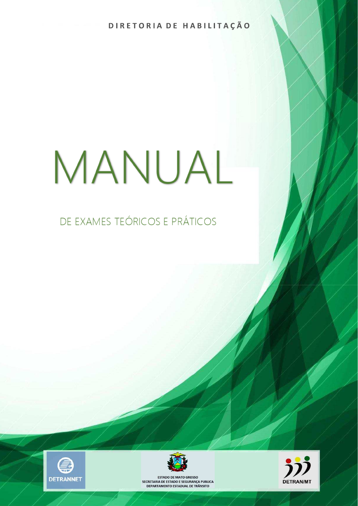 <p>Av. Dr. Hélio Ribeiro Torquato da Silva, n º 1000 - CEP 78.048-910 - Cuiabá/MT Fone: (65) 3615-4700 1</p><p>Sumário</p><p>INTRODUÇÃO ........................................................................................................................................ 2</p><p>CONCEITOS GERAIS SOBRE FORMAÇÃO DO CONDUTOR ................................................ 3</p><p>LICENÇA DE APRENDIZAGEM VEICULAR-LADV ..................................................................... 4</p><p>SOBRE O EXAME TEÓRICO ............................................................................................................. 4</p><p>DA COMISSÃO E REVISÃO DA PROVA TEÓRICA .................................................................... 6</p><p>SOBRE O EXAME DE DIREÇÃO VEICULAR ............................................................................... 6</p><p>CALENDÁRIO SEMESTRAL BANCA EXAMINADORA ............................................................ 9</p><p>SOBRE A ABERTURA E FECHAMENTO DE TURMA EXAME TEÓRICO ......................... 10</p><p>ABERTURA TURMA TEÓRICA DIGITAL OU IMPRESSA ...................................................... 11</p><p>AGENDAMENTO TEÓRICO ............................................................................................................. 13</p><p>.................................................................................................................................................................. 14</p><p>FECHAMENTO DE TURMA TEÓRICO ......................................................................................... 15</p><p>ABERTURA DE TURMA EXAME PRÁTICO ................................................................................ 17</p><p>FECHAMENTO DE TURMA EXAME PRÁTICO .......................................................................... 21</p><p>LIMITE DE CANDIDATOS POR VEÍCULO NA CAPITAL E INTERIOR ............................... 23</p><p>DA APRESENTAÇÃO DO CANDIDATO ....................................................................................... 23</p><p>DO RESULTADO DO EXAME PRÁTICO VEICULAR ................................................................ 24</p><p>LANÇAMENTO DE LAUDOS EXAME PRÁTICO ....................................................................... 24</p><p>.................................................................................................................................................................. 25</p><p>MANUAL DO EXAMINADOR ........................................................................................................... 25</p><p>ANEXOS ................................................................................................................................................ 26</p><p>Av. Dr. Hélio Ribeiro Torquato da Silva, nº 1000 - CEP 78.048-910 - Cuiabá/MT Fone: (65) 3615-4700 2</p><p>INTRODUÇÃO</p><p>O presente Manual Operacional, tem por finalidade estabelecer uma padronização no</p><p>atendimento dos processos de Habilitação, facilitando o trabalho dos servidores envolvidos, bem</p><p>como suprir as demandas diárias em seus variados aspectos, vislumbrando dessa forma a</p><p>celeridade com excelência no atendimento ao cidadão.</p><p>Os servidores reuniram-se nas dependências do órgão para discutirem e acordarem sobre</p><p>o Manual Operacional e seus variados procedimentos, sobretudo, em relação a Avaliação Teórica</p><p>e Prática de Direção Veicular, fazendo uma compilação de todos os procedimentos de avaliação</p><p>utilizados nos exames teóricos e práticos, seguidos por todos os examinadores.</p><p>O manual funciona como uma ferramenta de auxílio, tanto para esses profissionais, quanto</p><p>para os profissionais que se encarregam da formação e capacitação dos novos condutores. A</p><p>atualização deste Manual faz-se necessária, devido às mudanças na legislação.</p><p>Em suma, com uma linguagem de fácil entendimento e objetividade, este Manual, visa</p><p>facilitar a compreensão dos serviços tocantes à Habilitação, contudo, ressaltamos que os servidores</p><p>estarão disponíveis para sanar possíveis dúvidas e esclarecimentos pertinentes ao processo de</p><p>CNH.</p><p>Av. Dr. Hélio Ribeiro Torquato da Silva, nº 1000 - CEP 78.048-910 - Cuiabá/MT Fone: (65) 3615-4700 3</p><p>CONCEITOS GERAIS SOBRE FORMAÇÃO DO CONDUTOR</p><p>Consoante a Resolução nº168/2004/CONTRAN, as normas regulamentares para o processo</p><p>de formação, especialização e habilitação do condutor de veículo automotor e elétrico, os</p><p>procedimentos dos exames, cursos e avaliações para a habilitação, renovação, adição e mudança</p><p>de categoria, emissão de documentos de habilitação, bem como do reconhecimento do documento</p><p>de habilitação obtido em país estrangeiro são estabelecidas nesta Resolução.</p><p>O candidato poderá requerer simultaneamente a categoria ACC e habilitação na categoria</p><p>A, B bem como requerer habilitação em A B, submetendo-se a um único Exames de aptidão Física</p><p>e Mental e Avaliação Psicológica, desde que considerado apto para ambas.</p><p>A formação de condutor de veículo automotor e elétrico compreende a realização de Curso</p><p>Teórico técnico, exame teórico-técnico aulas no Simulador de direção veicular e de Prática de</p><p>Direção Veicular e Exame de direção veicular, cuja estrutura curricular, carga horária e</p><p>especificações já estão definidas.</p><p>Quanto ao Curso e Prova Teórico-Técnico, o candidato deverá se submeter ao curso de</p><p>Formação (carga horária mínima 45 h/aula) composto das seguintes disciplinas, conforme</p><p>Resolução. 168/2004/CONTRAN:</p><p>1.Legislação de Trânsito: 18h/aula;</p><p>2.Direção defensiva: 16h/aula;</p><p>3.Noções de Primeiros Socorros: 4h/aula;</p><p>4.Noções de Proteção e Respeito ao Meio Ambiente e de Convívio S