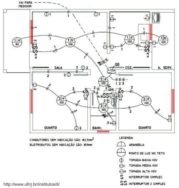 <p>Projeto elétrico Residencial</p><p> Planta Baixa</p><p> Esquemas Unifilar</p><p> Memorial Descritivo</p><p> Memorial de Cálculos</p><p>1. Previsão de carga</p><p>“A previsão de carga deve obedecer às prescrições da NBR 5410:2004, item 9.5.2”</p><p>Lembrando que as situações aqui apresentadas são para atender o mínimo exigido para NBR 5410.</p><p> Condições para se estabelecer a quantidade mínima de pontos de iluminação.</p><p> Prever pelo menos um ponto de luz no teto, comandado por um interruptor de parede.</p><p> Condições para estabelecer a potência mínima de iluminação.</p><p>Regra Área Potencia</p><p> Para área igual ou inferior a 6m²</p><p>o Atribuir um mínimo de 100VA</p><p><= 6m² 100VA</p><p> Para área superior a 6m²</p><p>o Atribuir um mínimo de 100VA para os</p><p>primeiros 6m², acrescido de 60VA para</p><p>cada aumento de 4m² inteiros.</p><p>> 6m² 100VA + 60VA a cada 4m²</p><p>inteiros</p><p>Obs: a NBR 5410:2004 não estabelece critérios para iluminação de áreas externas em residências, ficando a decisão</p><p>por conta do projetista e do cliente.</p><p>2. Prevendo a carga de iluminação de planta residencial.</p><p>Dependência Dimensões</p><p>área (m²)</p><p>Potência de Iluminação</p><p>(VA)</p><p>Sala 3,25 x 3,05 =</p><p>9,91</p><p>9,91m² - 6m²</p><p>= 3,91m²</p><p>100VA</p><p>Cozinha 11,43m² 11,43- 6 =</p><p>5,43</p><p>160VA</p><p>3. Condições para se estabelecer a quantidade mínima de Tomadas de Uso Geral (TUG’s)</p><p>As TUG’s não se destinam a ligação de equipamentos específicos e nelas são sempre ligados aparelhos moveis ou</p><p>portáteis.</p><p>Ex: Batedeira, furadeira, aspirador de pó, secador de cabelo etc.</p><p>Local Área Quantidade mínima de TUG’s</p><p>Cômodos ou dependências < 6m² 1</p><p>Cômodos ou dependências > 6m² 1 a cada 5m de perímetro</p><p>Cozinha, copa - 1 a cada 3,5m de perímetro</p><p>Varandas e garagem - 1</p><p>Banheiro - 1</p><p>Obs: em diversas aplicações, é recomendável prever uma quantidade de tomadas de uso geral maior do que o</p><p>mínimo calculado, evitando-se, assim, o emprego de extensões e benjamins (tês) que além de desperdiçarem</p><p>energia, podem comprometer a segurança da instalação.</p><p>4. Tomadas para Uso Geral</p><p>a. Condições para se estabelecer a potência mínima de tomadas de uso geral (TUG’s)</p><p>Banheiros - Atribuir, no mínimo, 600VA por</p><p>tomada, até 3 tomadas.</p><p>- Atribuir 100VA para as tomadas</p><p>excedentes.</p><p>Cozinhas</p><p>Copas</p><p>Área de Serviço</p><p>Lavanderias</p><p>Demais cômodos ou dependências</p><p>Atribuir, no mínimo, 100VA por</p><p>tomada</p><p>5. Tomada de Uso Específico (TUE’s)</p><p>São destinadas a ligação de equipamentos fixos e estacionários como é o caso de:</p><p> Ar-condicionado</p><p> Torneira elétrica</p><p> Maquina de lavar e secar</p><p>a. A quantidade de TUE’s é estabelecida de acordo com o número de aparelhos de utilização que irão</p><p>estar fixos em uma dada posição no ambiente.</p><p>Obs: Quando usamos o termo “tomada” de uso especifico, não necessariamente queremos dizer que a</p><p>ligação do equipamento a instalação elétrica irá utilizar uma tomada. Em alguns casos, a ligação poderá ser</p><p>feita, por exemplo, por ligação direta (emenda) de fios ou por uso de conectores.</p><p>6.1 Condições para se estabelecer a potência de Tomadas de Uso Específico (TUE’s)</p><p>a. Atribuir a potência nominal do equipamento a ser alimentado.</p><p>Ex. se na cozinha terá uma torneira elétrica, deve atribuir a potência em Watts (W) da torneira.</p><p>6. Estabelecendo a quantidade mínima de TUG’s e TUE’s</p><p>Ver</p><p>item</p><p>Depen-</p><p>dência</p><p>Dimensões Quantidade Mínima</p><p>Área (m²) Perímetro (m) TUG’s TUE’s</p><p>4.b Sala 9,91</p><p>(3,25 x 2) + (3,05 x 2) =</p><p>12,6</p><p>5m + 5m + 2,6m =12,6m</p><p>1 + 1 + 1 = 3</p><p>--</p><p>4.c</p><p>Cozinha 11,43 (3,75 x 2) + (3,05 x 2) =</p><p>13,6</p><p>3,5 + 3,5 + 3,5 + 3,1 = 13,6m</p><p>1 + 1 + 1 + 1 = 4</p><p>1 Torneira elétrica</p><p>1 Geladeira</p><p>7. Prevendo as cargas de tomadas TUE’s e TUG’s</p><p>Dependência</p><p>Dimensões Quantidade Previsão de Carga</p><p>Área (m²) Perímetro (m) TUG’s TUE’s TUG’s TUE’s</p><p>Sala 9,91 12,6 3 - 300VA --</p><p>Cozinha 11,43 13,6 4 2 1900VA</p><p>Torneira = 2500W</p><p>Geladeira = 500W</p><p>Total = 3000W</p><p>8. Tabela com os resultados obtidos</p><p>Dependência</p><p>Potência Iluminação</p><p>(VA)</p><p>TUG’s TUE’s</p><p>Potência</p><p>(VA)</p><p>Potência (W)</p><p>_____VA x 1 =_______W _____VA x 0,8 = ______W _____W</p><p>Total das potências (W)________________</p><p>9. Levantamento da Potência Total</p><p>Calculo da potência ativa de iluminação e tomadas de uso Geral TUG’s e TUE’s</p><p>Calculo da potência ativa de</p><p>iluminação e TUG’s</p><p>Iluminação</p><p>Fator de potência adotado = 1,0</p><p>Ex. Potência de Iluminação 1800VA</p><p>1800 x 1,0 = 1800W</p><p>TUG’s</p><p>Fator de potência adotado = 0,80</p><p>Ex. Potência de tomadas TUG’s 6900VA</p><p>6900 x 0,8 = 5520W</p><p>Em função da potência ativa (W) total prevista para a residência é que se determina:</p><p> O tipo de fornecimento,</p><p> A tensão de alimentação,</p><p> Padrão de entrada</p><p>10.1 Concessão Iguaçu</p><p>Na área de concessão da Iguaçu energia, segundo o Manual de Baixa Tensão 2017, item 6.2, determina os</p><p>seguintes critérios:</p><p>10.2 Concessão CELESC</p><p>Na área de concessão da CELESC, segundo o Manual de Baixa Tensão 2015, item 5.3, determina os seguintes</p><p>critérios:</p><p>15KW</p><p>Monofásico 2 fios</p><p>1 fase</p><p>1 neutro</p><p>25KW</p><p>Bifásico 3 fios</p><p>2 fase</p><p>1 neutro</p><p>75KW</p><p>Trifásico 4 fios</p><p>3 fase</p><p>1 neutro</p><p>11 Divisão de cargas</p><p>Alguns critérios para divisão de cargas são es