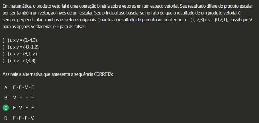 <p>Em matemática, produto vetorial é uma operação binária sobre vetores em um espaço vetorial Seu resultado difere do produto escalar por ser também um vetor, ao invés de um escalar. Seu principal USO baseia-se no fato de que resultado de um produto vetorial é sempre perpendicular a ambos os vetores originais. Quanto ao resultado do produto vetorial entre U = (1,-2,3) classifique V para as opções verdadeiras e F para as falsas: ( )uxv=(0,-4,3). ( Assinale a alternativa que apresenta a sequência CORRETA: A F-F-V-F B V-F-F-F D</p>
