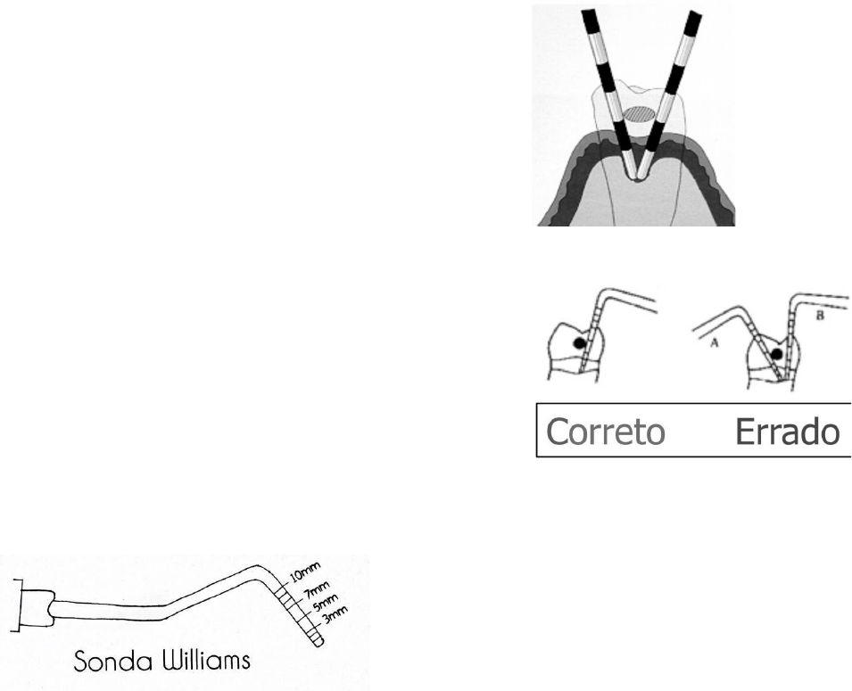 <p>Exame Clínico Periodontal, Diagnóstico, Prognóstico e Plano de Tratamento</p><p>Diagnóstico</p><p>1. Anamnese - avaliação periodontal, fatores sistêmicos, condições metabólicas que podem ter repercussão direta na doença periodontal.</p><p>2. Exame físico - importância de examinar bem o periodonto.</p><p>3. Exame imagiológico - (ou imaginológicos) exames radiográficos.</p><p>4. Exames complementares - leque imenso de exames de sangue, sorológico, fatores considerados de riscos e marcadores de riscos, da taxa de inflamação até mesmo a genética ou predisposição familiar.</p><p>Sonda periodontal</p><p>"...nenhum exame da boca pode ser considerado completo se não incluir a exploração do sulco gengival”</p><p>Sondagem</p><p>Parâmetros Clinìcos</p><p>· Posição da margem gengival (J.E.C.-M.G).</p><p>· Profundidade clínica de sondagem (P.S.) - quanto a sonda penetra da margem gengival até a máxima profundidade que ela alcança. Avaliar o tamanho da recessão ou hiperplasia (valor negativo - bolsa falsa).</p><p>· Sangramento à sondagem (S.S.) - sangramento influenciado pela sondagem. Gengiva inflamada (gengivite), presença de atividade de doença. Sondar percorrendo o longo eixo do dente. Já nas proximais a doença periodontal é mais prevalente.</p><p>Vamos dizer que isso é face mesial de um molar. Ponto preto (ponto de contato). Esse ponto de contato não permite que a sonda entre na vertical (ao longo do eixo). Porém, se deixar reta estaria sondando apenas porção palatina ou vestibular. Deixando assim, porção mais central da face mesial ou distal do dente. Todos posteriores superiores podem ter bifurcação (excluindo 2ª pré-molar), vão ter a presença de furcas, raízes fusionadas ou semi-fusionadas. Essas áreas têm concavidades até chegar na furca. As doenças periodontais tem predileções nessas áreas.</p><p>ATENÇÃO: inclinar a sonda com bom senso.</p><p>· Nível clínico de inserção (N.I.C.).</p><p>· Topografia óssea (sondagem transgengival) .</p><p>Envolvimento de Furca: classificação</p><p>Grau 1: perda horizontal < 3mm</p><p>Grau 2: perda horizontal > a 3 mm, sem ultrapassar toda a largura.</p><p>Grau 3: trespasse lado-a-lado.</p><p>Sonda de Nabers (faixa 3mm) - ⅓ grau 1 de furca. Se passar de 3 mm grau 2 de furca (não importa quanto passar).</p><p>Forma das raízes interferem na sondagem</p><p>Exames radiográficos que auxiliam na anamnese</p><p>Bi ou Trifurcação</p><p>Mobilidade dentária</p><p>Fisiológica (normal):</p><p>· Horizontal - até 2 mm</p><p>· Vertical - até 2 mm</p><p>Patológica (movimentação quando pressionando na mesma direção de um lado para o outro):</p><p>· Grau 1 : horizontal de 0,2 até 1 mm</p><p>· Grau 2: horizontal acima de 1 mm</p><p>· Grau 3: intrusão ou horizontal acima de 1mm</p><p>Como fazer?</p><p>2 instrumentos rígidos (cabo de espelho) coloca no dente e movimenta de um lado para o outro.</p><p>Distância da JEC à margem gengival: recessão ou aumento gengival</p><p>Positiva - JEC-MG = 2mm (recessão)</p><p>Negativa - JEC-MG = -1mm (aumento gengival)</p><p>Se tem uma recessão vai colocar na posição da margem gengival 2 mm de recessão. Mas, se tiver uma hiperplasia é pelo tato que percebe, entra com a sonda e vai tateando. É necessário sentir a lisura e a aspereza do cemento. Analisando quantos milímetros a ponta da sonda sentiu na mudança de textura. Esse é o valor negativo da hiperplasia ( ou posição coronária da margem gengival).</p><p>Lembre-se de verificar a quantidade de mucosa ceratinizada. Menos de 2 mm colocar * é um problema mucogengival.</p><p>Índice de placa corada é importante para conscientização dos pacientes (educação em saúde).</p><p>Classificação das doenças periodontais</p><p>1.1 Saúde Gengival/Periodontal</p><p>1.2 Gengivite induzida pelo biofilme</p><p>1.3 Doenças gengivais não induzidas pelo biofilme</p><p>2. Periodontite, subdivide em:</p><p>2.1 Doenças periodontais necrosantes.</p><p>2.2 Periodontite</p><p>2.3 Periodontite como manifestações de doenças sistêmicas</p><p>3. Outras condições que afetam o periodonto:</p><p>3.1 Manifestações periodontais de doenças ou condições sistêmicas (doenças ou condições sistêmicas que afetam os tecidos periodontais de suporte.</p><p>3.2 Abscessos periodontais e lesões endoperiodontais.</p><p>3.3 Condições e deformidades mucogengivais.</p><p>3.4 Forças oclusais traumáticas</p><p>3.5 Fatores relacionado ao dente e às próteses</p><p>4. Condições peri-implantes</p><p>4.1 Saúde peri-implantar</p><p>4.2 Mucostie peri-implantar</p><p>4.3 Peri-implatite</p><p>4.4 Deficiências nos tecidos peri-implantes moles e duros.</p><p>Extensão</p><p>Gengivite</p><p>· Localizada: 10% - 30% dos sítios têm SS.</p><p>· Generalizada: acima de 30% dos sítios têm SS. Leve, moderada ou severa.</p><p>Periodontite</p><p>· Localizada: até 30% dos sítios têm perda de inserção.</p><p>· Generalizada: acima de 30% dos sítios têm perda de inserção.</p><p>Prognóstico dos dentes</p><p>Prognóstico no inicial do tratamento é provisório (precavido)</p><p>1. Excelente - para dente saudável, que não precisa de nada.</p><p>2. Bom - aquele paciente que pode ter uma gengivite(gengiva inflamada)quando não existe outro fator secundário uma cárie cervical, uma restauração imensa com um sobrecontorno levando a problema gengival. Saúde não está sendo mantida.</p><p>3. Duvidoso - conjunto de fatores. Uma perda de inserção que levou a envolvimentos de bifurcação ou de furca, se for grau 1 pode ser necessário cirurgia na maioria dos casos ou grau 2 cirurgia regenerativa que depende muito da cicatrização e grau 3 comprometimento que contraindica regenerar tecido, utiliza-se outras técnicas cirúrgicas. Duvidoso em longo prazo.</p><p>4. Extração indicada</p><p>5. Ausente</p><p>D.P: fatores ambientais, fatores relativos ao hospedeiro, m.o (espiroquetas, bactérias gram- ana