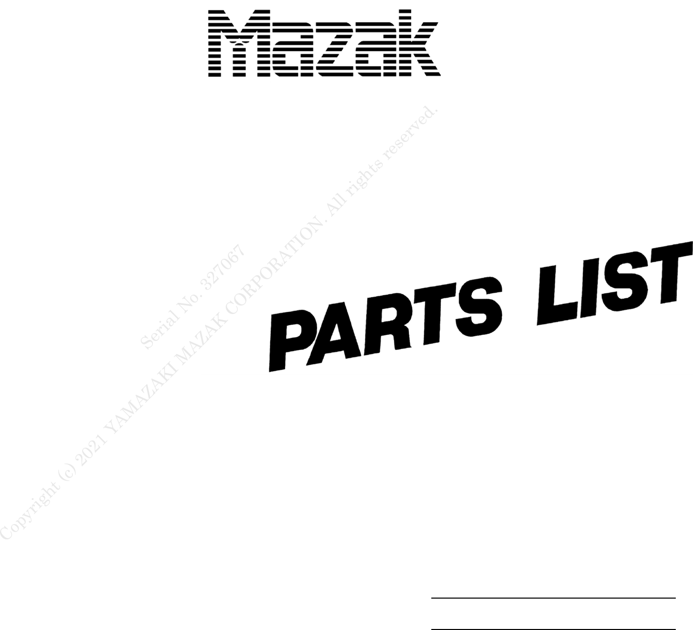 <p>MANUAL No. H398LA0400E</p><p>Printed in japan</p><p>1/2</p><p>SERIAL NUMBER:</p><p>Seri</p><p>al</p><p>No.</p><p>32</p><p>70</p><p>67</p><p>Cop</p><p>yri</p><p>gh</p><p>t (c</p><p>) 2</p><p>02</p><p>1 Y</p><p>AMAZAKI M</p><p>AZAK CORPORATIO</p><p>N. A</p><p>ll r</p><p>igh</p><p>ts</p><p>res</p><p>erv</p><p>ed</p><p>.</p><p>Serial No. 327067</p><p>HGENLA0031E 1</p><p>PREFACE</p><p>CONTENTS</p><p>1 PURPOSE AND IMPORTANT REQUEST ·········································· 1</p><p>2 HOW TO FIND OUT A PART ··························································· 2</p><p>3 ITEMS WRITTEN IN PARTS TABLE ················································· 3</p><p>4 HOW TO PLACE A PART ORDER ··················································· 3</p><p>5 ABBREVIATIONS ·········································································· 3</p><p>6 UNIT STRUCTURE ········································································ 4</p><p>MASTER INDEX is followed hereafter, then CONTENTS, drawings and parts tables are</p><p>compiled principally in one set in the order of the units.</p><p>1 PURPOSE AND IMPORTANT REQUEST</p><p>(1) This parts list is made for the purpose of maintenance of Mazak machine tools.</p><p>Use it for identifying parts for repairs and checks. For electrical parts, refer to</p><p>electric diagrams.</p><p>(2) For maintenance, please observe the following items:</p><p>IMPORTANT REQUEST</p><p>• Before starting a repair or a checkup, understand the full contents of the</p><p>OPERATING MANUAL and the MAINTENANCE MANUAL well.</p><p>Especially, it is dangerous to start working before understanding the SAFETY</p><p>PRECAUTIONS and the explanations written in them well.</p><p>• In order to maintain the machine specifications set at the time of delivery, use</p><p>the replacement parts and expendables recommended by us Mazak without</p><p>fail. We will not be responsible for any physical injury and machine-down</p><p>caused by the failure of observance.</p><p>• There are some cases that special materials are selected as parts,</p><p>even O-rings or coned disc springs, used for the machine.</p><p>Please take account that an assumed performance might not be secured</p><p>by using similar parts sold in the general market as like quality</p><p>products without careful consideration.</p><p>(3) The list is subject to change without notice due to improvements of machines.</p><p>(4) Refer to “4 HOW TO PLACE A PART ORDER” for replacing a part or placing an</p><p>order.</p><p>Seri</p><p>al</p><p>No.</p><p>32</p><p>70</p><p>67</p><p>Cop</p><p>yri</p><p>gh</p><p>t (c</p><p>) 2</p><p>02</p><p>1 Y</p><p>AMAZAKI M</p><p>AZAK CORPORATIO</p><p>N. A</p><p>ll r</p><p>igh</p><p>ts</p><p>res</p><p>erv</p><p>ed</p><p>.</p><p>Serial No. 327067</p><p>HGENLA0031E 2</p><p>2 HOW TO FIND OUT A PART</p><p>(1) Guess what unit the part is assembled in. (Refer to “6 UNIT STRUCTURE”.)</p><p>(2) Open MASTER INDEX, page 4. All units in this book are listed here in the order</p><p>of low number. Grasp the position of the unit.</p><p>(3) Open the page of the unit indicated at the right below.</p><p>Example : The unit is a X DRIVE 1</p><p>(4) Find out the part on the drawings in the pages following the opened one and</p><p>remember the index number.</p><p>The numbers in circles like this are index numbers.</p><p>(5) After the drawing, you will find a parts table in which index numbers are written at</p><p>the left end. From the index numbers, find the desired index number and get the</p><p>necessary information of the part.</p><p>25 : X DRIVE 1</p><p>Index Numbers</p><p>Seri</p><p>al</p><p>No.</p><p>32</p><p>70</p><p>67</p><p>Cop</p><p>yri</p><p>gh</p><p>t (c</p><p>) 2</p><p>02</p><p>1 Y</p><p>AMAZAKI M</p><p>AZAK CORPORATIO</p><p>N. A</p><p>ll r</p><p>igh</p><p>ts</p><p>res</p><p>erv</p><p>ed</p><p>.</p><p>Serial No. 327067</p><p>HGENLA0031E 3</p><p>3 ITEMS WRITTEN IN PARTS TABLE</p><p>1 2 3 4 5 6 7</p><p>NO.</p><p>1</p><p>2</p><p>PARTS-NO.</p><p>A06CB100500</p><p>J2600S02500</p><p>PARTS-NAME</p><p>SKT. HD. CAP SCR.</p><p>O-RING</p><p>MAKER</p><p>XXXXX</p><p>JIS</p><p>Q’TY</p><p>8</p><p>1</p><p>RANK</p><p>A</p><p>REMARKS</p><p>M10X50</p><p>S-025</p><p>1. NO.: Index number</p><p>Index numbers are circled so that you can identify them in drawings.</p><p>2. PARTS-NO.: Part number</p><p>This is an 11-digit code specified by Mazak for part identification.</p><p>3. PARTS-NAME: Part name</p><p>This is a part name specified by Mazak. In addition, it may have ID, where to</p><p>use, purpose of use, etc. depending on parts.</p><p>4. MAKER: Maker’s name</p><p>Here, the part maker’s name or name of standars is written.</p><p>5. Q’TY: Quantity per kind of part</p><p>Here, the number of parts per kind of use is written.</p><p>(For example, “1” means one piece, “1 st” means one set, “1 m” means one</p><p>meter, etc.)</p><p>6. RANK: Classification for identifying the degree of consumption, the unit purchase, etc.</p><p>A-D: They indicate the consuming time and degree of a part ⎯ “A” denotes</p><p>the consuming time is the shortest, “B” denotes it is longer than “A”, …</p><p>and “D” denotes it is the longest.</p><p>U: This indicates a purchased part . The structural parts of a purchased</p><p>part are further issued in other pages. Look at “ MASTER INDEX” and</p><p>find out the approximate page position in this book.</p><p>Remark: A parts list only for a tool hive (a kind of unit purchases) is published</p><p>under the manual number HGMCLB-----E.</p><p>7. REMARKS: Remarks</p><p>Here, concrete information such as dimensions is normally