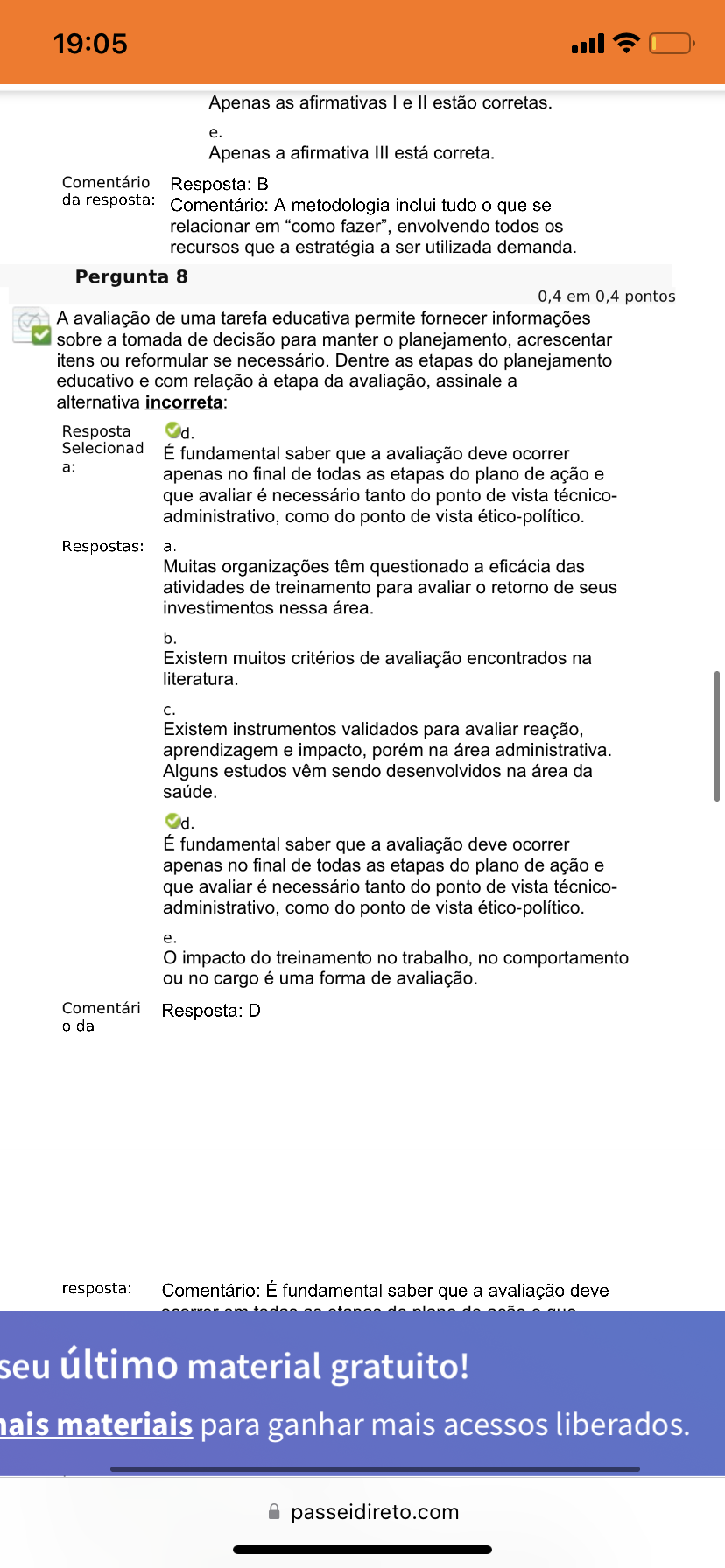 <p>19:05 Apenas as afirmativas e estão corretas. e. Apenas a afirmativa III está correta. Comentário Resposta: B da resposta: Comentário: A metodologia inclui tudo o que se relacionar em "como fazer", envolvendo todos os recursos que a estratégia a ser utilizada demanda Pergunta 8 0,4 em 0,4 pontos A avaliação de uma tarefa educativa permite fornecer informações sobre a tomada de decisão para manter o planejamento, acrescentar itens ou reformular se necessário. Dentre as etapas do planejamento educativo e com relação à etapa da avaliação, assinale a alternativa incorreta: Resposta d. Selecionad É fundamental saber que a avaliação deve ocorrer a: apenas no final de todas as etapas do plano de ação e que avaliar é necessário tanto do ponto de vista técnico- administrativo, como do ponto de vista ético-político. Respostas: a. Muitas organizações têm questionado a eficácia das atividades de treinamento para avaliar o retorno de seus investimentos nessa área. b. Existem muitos critérios de avaliação encontrados na literatura. Existem instrumentos validados para avaliar reação, aprendizagem e impacto, porém na área administrativa. Alguns estudos vêm sendo desenvolvidos na área da saúde. É fundamental saber que a avaliação deve ocorrer apenas no final de todas as etapas do plano de ação e que avaliar é necessário tanto do ponto de vista técnico- administrativo, como do ponto de vista ético-político. e. impacto do treinamento no trabalho, no comportamento ou no cargo é uma forma de avaliação. Comentári Resposta: D o da resposta: Comentário: É fundamental saber que a avaliação deve seu último material gratuito! ais materiais para ganhar mais acessos liberados. passeidireto.com</p>