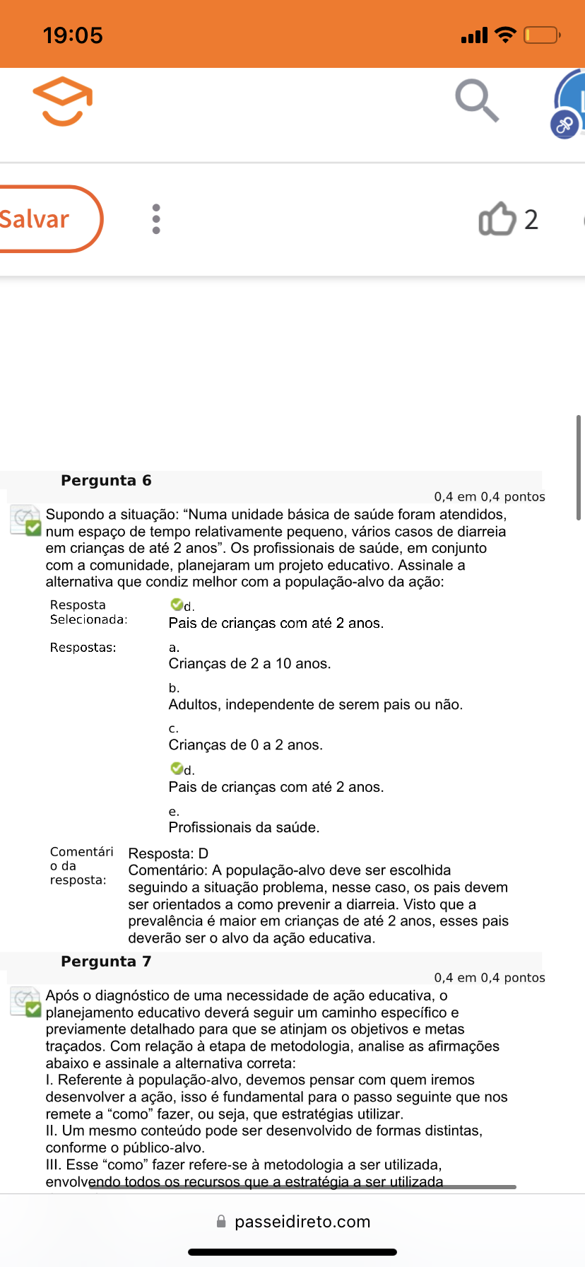 <p>19:05 Salvar 2 Pergunta 6 0,4 em 0,4 pontos Supondo a situação: "Numa unidade básica de saúde foram atendidos, num espaço de tempo relativamente pequeno, vários casos de diarreia em crianças de até 2 anos". Os profissionais de saúde em conjunto com a comunidade, planejaram um projeto educativo. Assinale a alternativa que condiz melhor com a população-alvo da ação: Resposta d. Selecionada: Pais de crianças com até 2 anos. Respostas: a. Crianças de 2 a 10 anos. b. Adultos, independente de serem pais ou não. C. Crianças de 0 a 2 anos. d. Pais de crianças com até 2 anos. e. Profissionais da saúde. Comentári Resposta: D o da Comentário: A população-alvo deve ser escolhida resposta: seguindo a situação problema, nesse caso, os pais devem ser orientados a como prevenir a diarreia. Visto que a prevalência é maior em crianças de até 2 anos, esses pais deverão ser o alvo da ação educativa. Pergunta 7 0,4 em 0,4 pontos Após o diagnóstico de uma necessidade de ação educativa, o planejamento educativo deverá seguir um caminho específico e previamente detalhado para que se atinjam os objetivos e metas traçados. Com relação à etapa de metodologia, analise as afirmações abaixo e assinale a alternativa correta: I. Referente à população-alvo, devemos pensar com quem iremos desenvolver a ação, isso é fundamental para o passo seguinte que nos remete a "como" fazer, ou seja, que estratégias utilizar. II. Um mesmo conteúdo pode ser desenvolvido de formas distintas, conforme o público-alvo. III. Esse "como" fazer refere-se à metodologia a ser utilizada, envolvendo todos os recursos que a estratégia a ser utilizada passeidireto.com</p>