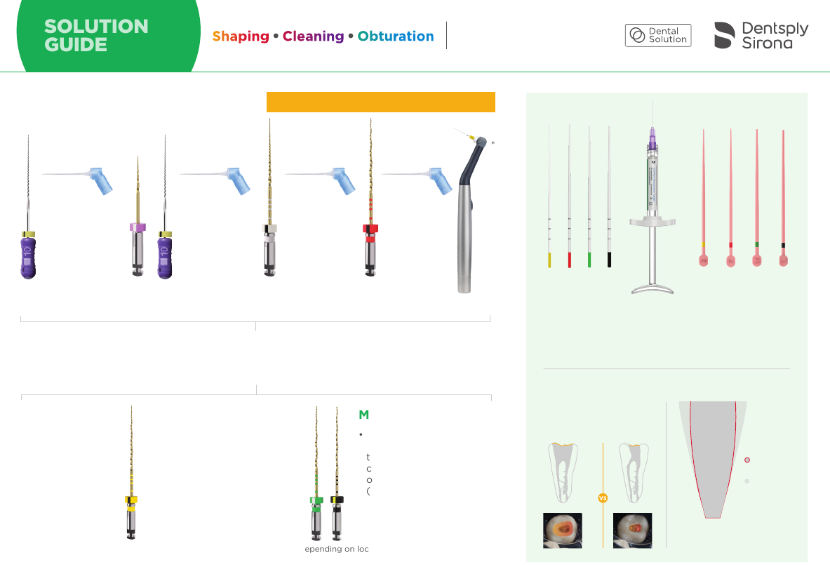 <p>Select dedicated TruNatomy® Absorbent Points to dry the</p><p>root canals, AH Plus® Bioceramic Sealer to seal the canals</p><p>and a dedicated TruNatomy® Conform Fit® Gutta-Percha</p><p>Point corresponding to color code and size of the last</p><p>instrument used during canal preparation.</p><p>Motor settings: 500 rpm / 1.5 Ncm</p><p>Preserving structural strength</p><p>* SmartLite Pro EndoActivator™ and TruNatomy® Large: Availability depending on local registration.</p><p>** The taper indicated is the average of all the tapers and not the taper at the tip. The “v” indicates that the taper is variable.</p><p>Low torque instruments - Never brush, but peck with large amplitudes.</p><p>Advance the TruNatomy® file passively with no more than 2-3 gentle amplitudes approximately 2-5 mm in-and-out</p><p>of the canal until working length has been reached. Use standard irrigation protocol used in your practice (including</p><p>activated irrigation strategies if applicable).</p><p>TruNatomy®</p><p>Shaping</p><p>options to</p><p>treat other</p><p>cases:</p><p>Small</p><p>• Small not needed in most</p><p>cases but can help for</p><p>severe curvatures or</p><p>narrow canals</p><p>• If the Prime does not</p><p>progress easily use the</p><p>Small then finish with Prime</p><p>Medium and Large*</p><p>• After finishing with the</p><p>Prime (if the apex is larger</p><p>than current shaping file),</p><p>continue with the Medium</p><p>or Large if needed</p><p>(straight anatomies)</p><p>TruNatomy® Sequence</p><p>ReadySteel®</p><p>K-File 10</p><p>TruNatomy® Orifice</p><p>Modifier 20.08</p><p>TruNatomy®</p><p>Glider 17.02v</p><p>TruNatomy®</p><p>Prime 26.04v</p><p>TruNatomy®</p><p>Absorbent Points</p><p>TruNatomy® Conform Fit®</p><p>Gutta-Percha Points</p><p>*</p><p>Efficiency with less</p><p>dentin removal</p><p>TruNatomy</p><p>Prime</p><p>Generic</p><p>progressive</p><p>tapered file</p><p>No need for</p><p>conventional</p><p>straight line access</p><p>TruNatomy®</p><p>Irrigation</p><p>Needle</p><p>SOLUTION</p><p>GUIDE TruNatomy®Shaping Cleaning Obturation</p><p>B8112den_3TS_TruNatomy_SolutionGuide_A5.indd 1B8112den_3TS_TruNatomy_SolutionGuide_A5.indd 1 13/02/2023 14:0013/02/2023 14:00</p><p>IN</p><p>L</p><p>/B</p><p>E</p><p>N</p><p>T</p><p>N</p><p>M</p><p>Y</p><p>T</p><p>IP</p><p>0</p><p>0</p><p>1/</p><p>0</p><p>1/</p><p>2</p><p>0</p><p>19</p><p>-</p><p>u</p><p>p</p><p>d</p><p>a</p><p>te</p><p>d</p><p>1</p><p>1/</p><p>2</p><p>0</p><p>2</p><p>2</p><p>Files, Gutta-Percha & Absorbent Points Maillefer Instruments Holding Sàrl, Chemin du Verger 3, CH-1338 Ballaigues, Switzerland 2797</p><p>Irrigation Needle Produits Dentaires SA, Rue des Bosquets 18, CH-1800, Vevey, Switzerland 1639</p><p>SmartLite Pro EndoActivator™ Dentsply LLC, trading as Dentsply professional, 1301 Smile Way, York, PA, 17404, USA 2797</p><p>1. Review different horizontally angulated</p><p>radiographs to diagnostically determine the width,</p><p>length, and curvature of any given root canal.</p><p>2. Estimate the working length using well-angulated</p><p>preoperative radiographs.</p><p>3. Prepare a conservative access cavity sufficient</p><p>enough to reveal all root canal orifices.</p><p>4. Scout the coronal 2/3 of canals with an ISO 010</p><p>K-File in the presence of lubricant such as</p><p>Glyde™ FILE PREP and irrigate.</p><p>5. Followed by a TruNatomy® Orifice Modifier at</p><p>500 rpm and 1.50 Ncm. With irrigant in the canal</p><p>advance TruNatomy® Orifice Modifier in 2-3</p><p>gentle amplitudes approximately 2-5 mm in-and-</p><p>out of the canal. Repeat until the coronal third</p><p>is shaped. The instrument has 7 mm of cutting</p><p>flutes, insertion into the canal should not exceed</p><p>the length of the cutting portion. Irrigate the canal</p><p>and clean cutting flutes routinely.</p><p>6. Scout the whole root canal with an ISO 010</p><p>K-File, determine working length by using an</p><p>electronic apex locator (EAL) in combination with</p><p>radiographs, irrigate and confirm patency.</p><p>7. With irrigant in the canal, create and confirm a</p><p>reproducible glide path using a TruNatomy® Glider</p><p>in 2-3 gentle amplitudes approximately 2-5 mm.</p><p>Irrigate and repeat until previously confirmed</p><p>working length with an EAL has been reached.</p><p>8. ALWAYS begin shaping with TruNatomy® PRIME</p><p>(500 rpm / 1.5 Ncm) file passively in the presence</p><p>of sodium hypochlorite with no more than 2-3</p><p>gentle amplitudes approximately 2-5 mm in-and-</p><p>out of the canal. Irrigate and repeat as necessary</p><p>until full working length is reached. Upon reaching</p><p>length, remove the file to avoid over-enlarging the</p><p>apical canal portion.</p><p>9. Routinely irrigate the canal and clean the</p><p>instruments cutting flutes of debris upon removal.</p><p>10. If TruNatomy® PRIME does not progress easily,</p><p>remove, irrigate, and recapitulate with an ISO 010</p><p>K-File to confirm canal patency and move to the</p><p>TruNatomy® SMALL.</p><p>11. Inspect cutting flutes routinely upon removal</p><p>for presence of unwinding and straightening.</p><p>If deformation is noted, discard and use a new</p><p>TruNatomy® instrument.</p><p>12. Advance TruNatomy® SMALL passively in the</p><p>presence of sodium hypochlorite with no more</p><p>than 2-3 gentle amplitudes approximately 2-5</p><p>mm in-and-out and remove instrument. Irrigate</p><p>and repeat as necessary to working length in a</p><p>gentle/passive in-and-out motion and then use</p><p>TruNatomy® PRIME to working length to optimize</p><p>the shape.</p><p>13. If TruNatomy® PRIME is loose at length with</p><p>no dentinal debris in the apical flutes, continue</p><p>shaping with TruNatomy® MEDIUM and</p><p>subsequently with LARGE if needed. Care should</p><p>be taken to guide each instrument gently to full</p><p>working length to ensure completeness of shape.</p><p>Use TruNatomy® LARGE in larger and straighter</p><p>canals only, 