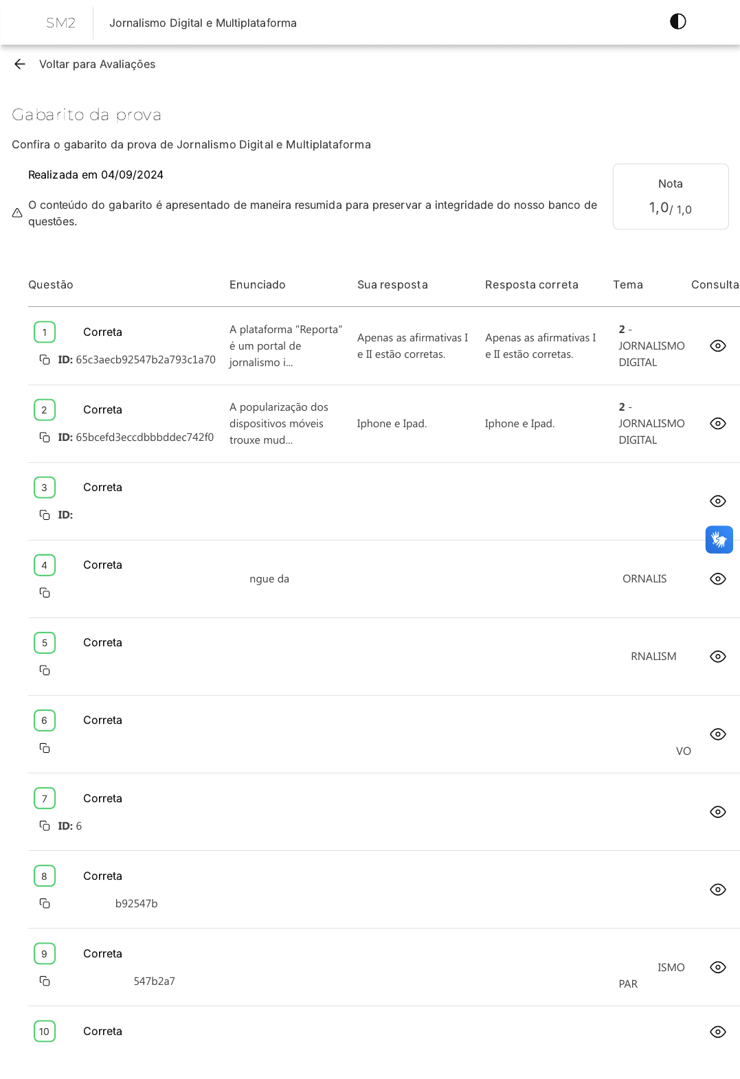 <p>19/09/24, 21:35 https://estacio.saladeavaliacoes.com.br/prova/66d8f75bd471da2aca80fd6d/gabarito/</p><p>https://estacio.saladeavaliacoes.com.br/prova/66d8f75bd471da2aca80fd6d/gabarito/ 1/2</p><p>Voltar para Avaliações</p><p>Gabarito da prova</p><p>Confira o gabarito da prova de Jornalismo Digital e Multiplataforma</p><p>Realizada em 04/09/2024</p><p>O conteúdo do gabarito é apresentado de maneira resumida para preservar a integridade do nosso banco de</p><p>questões.</p><p>Nota</p><p>1,0/ 1,0</p><p>Questão Enunciado Sua resposta Resposta correta Tema Consulta</p><p>Correta</p><p>ID: 65c3aecb92547b2a793c1a70</p><p>A plataforma "Reporta"</p><p>é um portal de</p><p>jornalismo i...</p><p>Apenas as afirmativas I</p><p>e II estão corretas.</p><p>Apenas as afirmativas I</p><p>e II estão corretas.</p><p>2 -</p><p>JORNALISMO</p><p>DIGITAL</p><p>Correta</p><p>ID: 65bcefd3eccdbbbddec742f0</p><p>A popularização dos</p><p>dispositivos móveis</p><p>trouxe mud...</p><p>Iphone e Ipad. Iphone e Ipad.</p><p>2 -</p><p>JORNALISMO</p><p>DIGITAL</p><p>Correta</p><p>ID: 65c3aecb92547b2a793c1a10</p><p>Uma startup de mídia</p><p>deseja se estabelecer</p><p>no merc...</p><p>Mídia independente. Mídia independente.</p><p>2 -</p><p>JORNALISMO</p><p>DIGITAL</p><p>Correta</p><p>ID: 654d3b2a134266c159727d3a</p><p>O Webjornalismo se</p><p>distingue das demais</p><p>mídias tra...</p><p>Hipertextualidade,</p><p>Contextualidade e</p><p>Instantaneida...</p><p>Hipertextualidade,</p><p>Contextualidade e</p><p>Instantaneida...</p><p>2 -</p><p>JORNALISMO</p><p>DIGITAL</p><p>Correta</p><p>ID: 65c3aecb92547b2a793c1a2e</p><p>"StreamLine Media"</p><p>está analisando a</p><p>eficácia dos ...</p><p>Audiência do programa. Audiência do programa.</p><p>2 -</p><p>JORNALISMO</p><p>DIGITAL</p><p>Correta</p><p>ID: 65c3aecb92547b2a793c1b36</p><p>O jornalismo</p><p>contemporâneo tem se</p><p>adaptado às nova...</p><p>participativo;</p><p>descentralização;</p><p>credibilidade.</p><p>participativo;</p><p>descentralização;</p><p>credibilidade.</p><p>3 -</p><p>JORNALISMO</p><p>PARTICIPATIVO</p><p>Correta</p><p>ID: 65c3aecb92547b2a793c1adc</p><p>Lucas, um estudante de</p><p>comunicação, está</p><p>pesquisan...</p><p>Ignacio Ramonet. Ignacio Ramonet.</p><p>3 -</p><p>JORNALISMO</p><p>PARTICIPATIVO</p><p>Correta</p><p>ID: 65c3aecb92547b2a793c1a88</p><p>O cenário midiático</p><p>contemporâneo é</p><p>marcado por um...</p><p>A interação constante</p><p>entre as partes</p><p>envolvidas.</p><p>A interação constante</p><p>entre as partes</p><p>envolvidas.</p><p>3 -</p><p>JORNALISMO</p><p>PARTICIPATIVO</p><p>Correta</p><p>ID: 65c3aecb92547b2a793c1af4</p><p>O programa "Notícias</p><p>do Povo", transmitido</p><p>por uma...</p><p>Somente a afirmativa I</p><p>está correta.</p><p>Somente a afirmativa I</p><p>está correta.</p><p>3 -</p><p>JORNALISMO</p><p>PARTICIPATIVO</p><p>Correta Há tempos um fato não</p><p>repercutia tão</p><p>Jornalismo opensource. Jornalismo opensource. 3 -</p><p>JORNALISMO</p><p>1</p><p>2</p><p>3</p><p>4</p><p>5</p><p>6</p><p>7</p><p>8</p><p>9</p><p>10</p><p>SM2 Jornalismo Digital e Multiplataforma</p><p>https://estacio.saladeavaliacoes.com.br/avaliacoes/</p><p>19/09/24, 21:35 https://estacio.saladeavaliacoes.com.br/prova/66d8f75bd471da2aca80fd6d/gabarito/</p><p>https://estacio.saladeavaliacoes.com.br/prova/66d8f75bd471da2aca80fd6d/gabarito/ 2/2</p><p>ID: 654d3b3c134266c1597284dc polemicamente... PARTICIPATIVO</p><p>Encontrou algum problema?</p><p>Você pode copiar o ID da questão, acessar o Campus Virtual �SIA) e abrir um requerimento.</p>