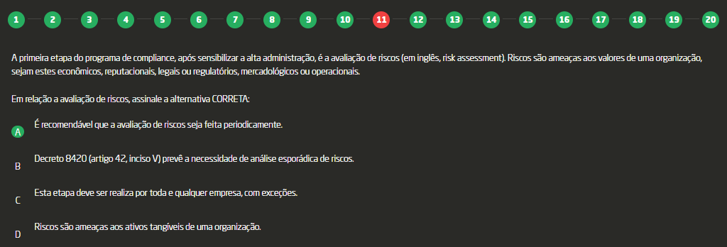 <p>1 3 4 5 6 7 8 10 11 12 13 14 15 16 17 18 19 20 A primeira etapa do programa de compliance, após sensibilizar a alta administração, é a avaliação de riscos (em inglês, risk Riscos são ameaças aos valores de uma sejam estes econômicos, reputacionais, legais ou regulatórios, mercadológicos ou Em relação a avaliação de riscos, assinale a alternativa CORRE TA: É recomendável que a avaliação de riscos seja feita periodicamente. A Decreto 8420 (artigo inciso V) prevê a necessidade de análise esporádica de B Esta etapa deve ser realiza por toda e qualquer empresa, com exceções. C Riscos são ameaças aos ativos tangíveis de uma organização. D</p>