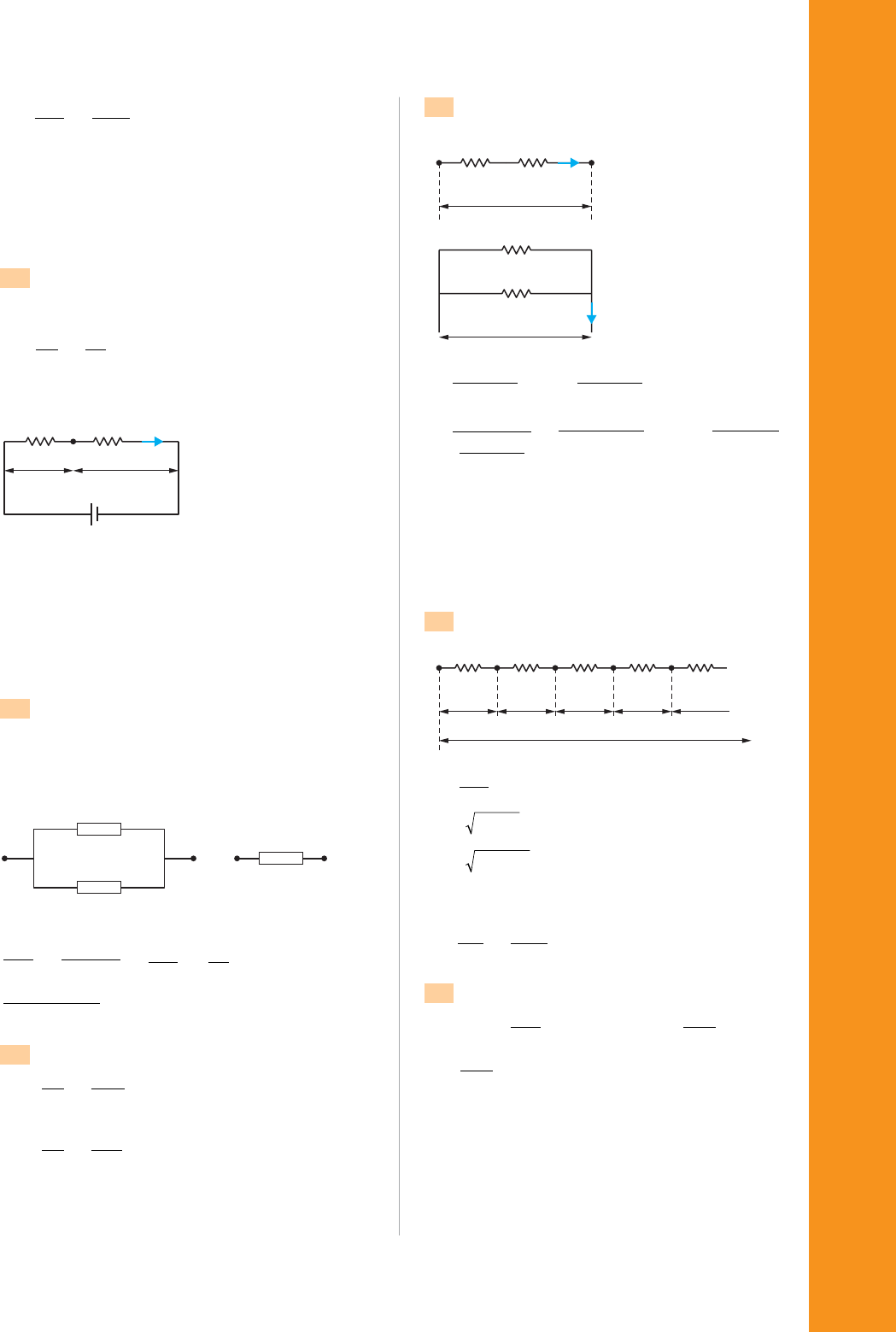 <p>RESOLUÇÃO 251</p><p>SIM</p><p>ULA</p><p>DÃO</p><p>: RE</p><p>SOL</p><p>UÇÃ</p><p>O</p><p>SIM</p><p>ULA</p><p>DÃO</p><p>: RE</p><p>SOL</p><p>UÇÃ</p><p>O</p><p>i3 �</p><p>U</p><p>R3</p><p>�</p><p>12</p><p>120</p><p>� 0,1 A</p><p>“A corrente é menor em R3, maior resistência.” (V)</p><p>Pd1</p><p>� Re � i1</p><p>2 � 40 � (0,3)2 � 3,6 W</p><p>Pd2</p><p>� Re � i2</p><p>2 � 60 � (0,2)2 � 2,4 W</p><p>Pd3</p><p>� R3 � i3</p><p>2 � 120 � (0,1)2 � 1,2 W</p><p>“A potência elétrica dissipada é maior no resistor de</p><p>menor resistência.” (F)</p><p>773 a) Lei de Ohm: U � R � i</p><p>Sendo uma função do 1º grau, o gráfico deve ser uma</p><p>reta. Portanto, o condutor I obedece a 1ª lei de Ohm.</p><p>R �</p><p>U</p><p>i</p><p>�</p><p>7</p><p>1</p><p>� 7 Ω � R � 7 Ω</p><p>b) Como os dois condutores estão associados em</p><p>série, a corrente no condutor I é igual à corrente II.</p><p>UI UII</p><p>i</p><p>ε</p><p>I II</p><p>No condutor II a ddp deve ser UII � 5 V; logo, do gráfi-</p><p>co temos i � 1,0 A. Como a corrente deve ser a mes-</p><p>ma nos dois condutores, para i � 1,0 A no condutor I.</p><p>A ddp correspondente é UI � 7,0 V.</p><p>Como E � UI � UII � 5 � 7 � 12 V</p><p>E � 12 V</p><p>774 a) A resistência equivalente entre X e Y é</p><p>igual a:</p><p>UXY � RXY � i → 20 � RXY � 2 → RXY � 10 Ω</p><p>A resistência equivalente dos resistores R2, R3 e RX é:</p><p>R � RXY � R1 → R � 10 � 2 → R � 8 Ω</p><p>24</p><p>Req � 8</p><p>7 � Rx</p><p>⇒�</p><p>b) Cálculo de RX :</p><p>1</p><p>Re</p><p>�</p><p>1</p><p>7 � RX</p><p>�</p><p>1</p><p>24</p><p>→</p><p>1</p><p>8</p><p>�</p><p>24 7</p><p>24 7</p><p>� �</p><p>�</p><p>R</p><p>R</p><p>X</p><p>X( ) → Rx � 5 Ω</p><p>775 Alternativa c.</p><p>R1 �</p><p>U</p><p>i1</p><p>�</p><p>40</p><p>0 2,</p><p>→ R1 � 200 W</p><p>Pd1</p><p>� R1 � i1</p><p>2 � 200 � 0,04 → Pd1</p><p>� 8 W</p><p>R2 �</p><p>U</p><p>i2</p><p>�</p><p>40</p><p>0 1,</p><p>→ R2 � 400 Ω</p><p>Pd2</p><p>� R2 � i2</p><p>2 � 400 � 0,01 → Pd2</p><p>� 4 Ω</p><p>Logo, Pdtotal</p><p>é 12 W.</p><p>776 UAB � 120 V</p><p>R1</p><p>R1 R2</p><p>R2</p><p>120 V</p><p>120 V</p><p>i</p><p>i</p><p>A B</p><p>i �</p><p>U</p><p>R R1 2�</p><p>→ 3 �</p><p>120</p><p>1 2R R�</p><p>→ R1 � R2 � 40</p><p>i �</p><p>U</p><p>R R</p><p>R R</p><p>1 2</p><p>1 2</p><p>�</p><p>�</p><p>�</p><p>U R R</p><p>R R</p><p>( )1 2</p><p>1 2</p><p>�</p><p>�</p><p>→ 16 �</p><p>120 40</p><p>1 2</p><p>�</p><p>�R R</p><p>R1 � R2 � 300</p><p>Resolvendo o sistema:</p><p>R1 � R2 � 40</p><p>R1 � R2 � 300</p><p>obtemos R1 � 10 Ω e R2 � 30 Ω ou R1 � 30 Ω e R2 �</p><p>10 Ω</p><p>777 Alternativa b.</p><p>L1</p><p>U�</p><p>U</p><p>L2</p><p>U�</p><p>L3</p><p>U�</p><p>L4</p><p>U�</p><p>L5</p><p>U�</p><p>A . . .</p><p>P �</p><p>U</p><p>R</p><p>2</p><p>U� � P R�</p><p>U� � 8 0 5� ,</p><p>U� � 2 V</p><p>U � n � U�</p><p>n �</p><p>U</p><p>U�</p><p>�</p><p>110</p><p>2</p><p>� 55 lâmpadas</p><p>778</p><p>01 → RA �</p><p>RB</p><p>2</p><p>→ RB � 2RA → S �</p><p>�</p><p>SA</p><p>�</p><p>2S �</p><p>�</p><p>SB</p><p>→ SA � 2SB (Falsa)</p><p>02 → P � R � i2 → PB � RBi2 → PB � 2RAi2 PB �</p><p>PA</p><p>PA � RAi2</p><p>(Verdadeira)</p>
