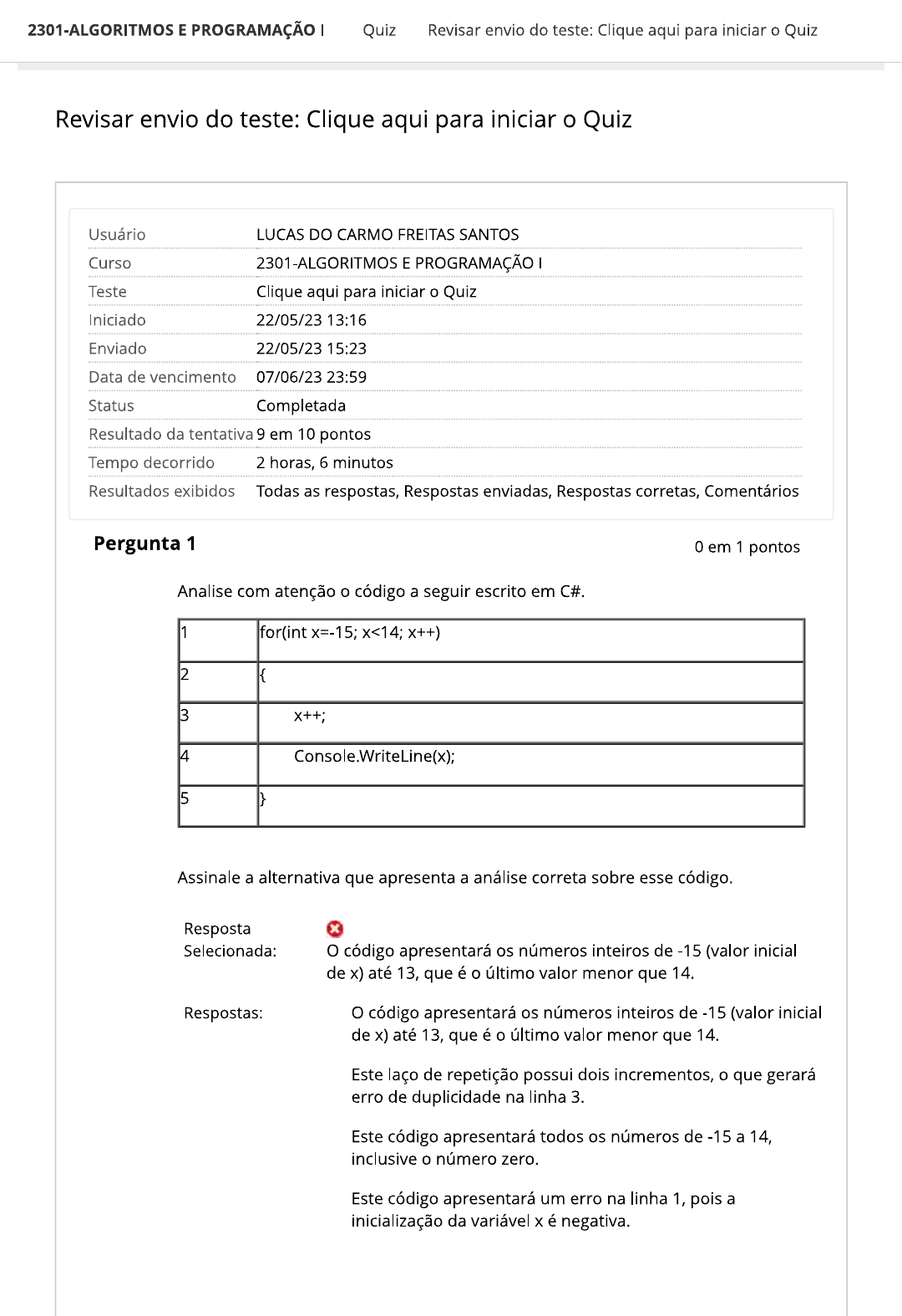 <p>2301-ALGORITMOS E PROGRAMAÇÃO Quiz Revisar envio do teste: Clique aqui para iniciar o Quiz Revisar envio do teste: Clique aqui para iniciar o Quiz Usuário LUCAS DO CARMO FREITAS SANTOS Curso 2301-ALGORITMOS E PROGRAMAÇÃO Teste Clique aqui para iniciar o Quiz Iniciado 22/05/23 13:16 Enviado 22/05/23 15:23 Data de vencimento 07/06/23 23:59 Status Completada Resultado da tentativa 9 em 10 pontos Tempo decorrido 2 horas, 6 minutos Resultados exibidos Todas as respostas, Respostas enviadas, Respostas corretas, Comentários Pergunta 1 0 em 1 pontos Analise com atenção o código a seguir escrito em C#. 1 for(int x=-15; x<14; 2 { 3 X++; 4 5 } Assinale a alternativa que apresenta a análise correta sobre esse código. Resposta Selecionada: O código apresentará os números inteiros de -15 (valor inicial de até 13, que é o último valor menor que 14. Respostas: O código apresentará os números inteiros de -15 (valor inicial de até 13, que é o último valor menor que 14. Este laço de repetição possui dois incrementos, o que gerará erro de duplicidade na linha 3. Este código apresentará todos os números de -15 a 14, inclusive o número zero. Este código apresentará um erro na linha 1, pois a inicialização da variável X é negativa.</p><p>Esta estrutura de repetição apresentará todos os números pares de -14 a 14. Comentário O laço for é inicializado com o valor Observe que o da resposta: laço é incrementado uma vez na definição do for, bem como tem o incremento internamente, dentro do escopo do for. Então, na primeira iteração, a variável -15 é incrementada para -14 e o valor é apresentado na tela. Em seguida, a variável X é incrementada com o X++ do laço for e também pelo X++ da linha 3. Logo, são apresentados todos os números pares, afinal, há dois incrementos. Pergunta 2 1 em 1 pontos Observe com atenção os blocos da figura a seguir: Quando alguém clicar em altera soma para numA + numB anda numA + numB passos diz Analisando os blocos, é correto afirmar que: Resposta Selecionada: a operação aritmética realizada nos blocos laranja (altera) e azul claro (anda) terá o mesmo resultado, porém com comportamentos diferentes. Respostas: ao clicar na bandeira verde, o usuário informa dois números, os quais serão somados e armazenados na variável soma. se o valor das variáveis numA e numB receberem os valores 8 e 10, o resultado será apresentado na tela pelo gato e ele andará 18 passos. existe uma operação de soma que será executada assim que alguém pressionar a bandeira verde, mostrando o resultado da operação na tela.</p><p>a operação aritmética realizada nos blocos laranja (altera) e azul claro (anda) terá o mesmo resultado, porém com comportamentos diferentes. a instrução realizada no bloco azul (anda) resultará em erro, uma vez que operações aritméticas devem ser atribuídas a uma variável. Comentário Nos blocos laranja e azul temos a mesma operação de soma, da resposta: com a diferença de que, enquanto o bloco laranja atribui o valor da operação de soma para uma variável, o bloco azul atribui para o bloco anda uma quantidade de passos para o gato caminhar. Logo, se o valor da variável numA for 8 e a variável numB for 10, então a variável soma recebe 18 e o gato caminha 18 passos. Pergunta 3 1 em 1 pontos A linguagem C#, assim como outras, permite que criemos funções para organizar o nosso código. Dentro destas funções, podemos adicionar estruturas de repetição, estruturas condicionais e também invocar outras funções nativas da linguagem. Observe com atenção o código a seguir escrito em C#, o qual utiliza funções. 1 public string print(string str){ 2 Console.WriteLine(str); 3 } 4 5 public static void Main (string[] { 6 Program X = new Program(); 7 8 string cont = "0"; 9 10 while(cont < 10){ 11 x.print(cont); 12 cont = Console.ReadLine(); 13 } 14 } Considerando as informações apresentadas, assinale a alternativa correta.</p><p>Resposta Selecionada: Este código executará uma vez e apresentará uma mensagem informando que cont não é uma variável do tipo numérica, dando erro na linha 10. Respostas: Este código executará uma vez e apresentará uma mensagem informando que cont não é uma variável do tipo numérica, dando erro na linha 10. Neste código, enquanto o usuário digitar um número menor do que 10, todo o conteúdo interno (linhas 6 a 12) será repetido ou iterado. Ao digitar um número maior ou igual a 10, o loop encerra. Haverá um erro na linha 11, pois a função print está enviando um contador que é inteiro, porém na linha 1 recebe uma string como parâmetro. O while da linha 10, bem como todo o seu conteúdo, entrará em loop infinito, pois o valor de cont é zero e não existe um incremento para esta variável. O erro que ocorrerá em tempo de execução na linha 11 pode ser resolvido se substituirmos a função print pela função nativa do C#, WriteLine. Comentário Na primeira execução, quando chega na linha 8, a variável cont é da resposta: declarada do tipo string, logo, mesmo que receba um número, o tipo da variável é texto (string). Logo, quando encontra o loop do while na linha 10, estamos comparando um tipo texto (cont) com um numérico (10). Deste modo, ocorrerá um erro, pois não é possível realizar este tipo de comparação. Pergunta 4 1 em 1 pontos Sobre algoritmos, podemos afirmar que: I. Cada instrução de um algoritmo deve ser executada em uma ordem específica para resolver um problema computacional ou não. II. algoritmo é uma sequência com quantidade indeterminada de instruções com o objetivo de resolver um problema. III. Fluxograma ou diagramas de sequência são exemplos de representações de um algoritmo. IV. Nas embalagens de produtos diversos, o item modo de usar é um exemplo de algoritmo com descrição narrativa. V. Fluxograma e diagramas de sequência são exemplos de representações gráficas visuais de um algoritmo. As a