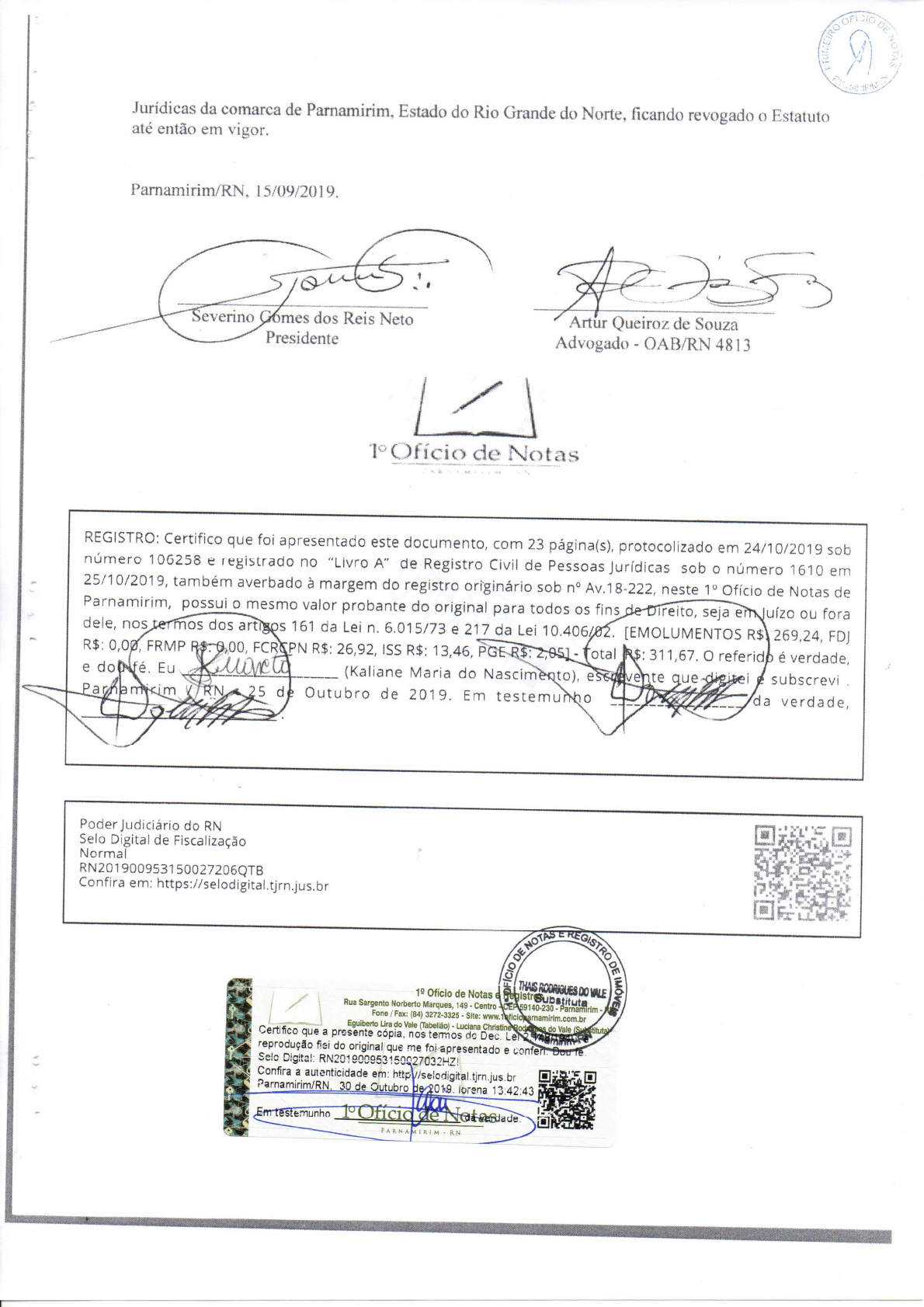 <p>Jurídicas da comarca de Parnamirim, Estado do Rio Grande do Norte, ficando revogado o Estatuto até então em vigor. Severino Gomes dos Reis Neto Artur Queiroz de Souza Presidente Advogado OAB/RN 4813 Ofício de Notas REGISTRO: Certifico que foi apresentado este documento, com 23 página(s), protocolizado em 24/10/2019 sob número 106258 e registrado no "Livro A" de Registro Civil de Pessoas Jurídicas sob número 1610 em 25/10/2019, também averbado à margem do registro originário sob n° neste 1° Ofício de Notas de Parnamirim, possui o mesmo valor probante do original para todos os fins de Direito, seja em luízo ou fora dele, nos termos dos artigos 161 da Lei n. 6.015/73 e 217 da Lei 10.406/02. [EMOLUMENTOS 269,24, FDJ e Eu R$: FRMP FCRCPN R$: 26,92, ISS R$: 13,46, 2,051 Total R$: 311,67. referido é verdade, (Kaliane Maria do Nascimento), escrevente que subscrevi Parnamirim 25 de Outubro de 2019. Em da verdade, Poder Judiciário do RN Selo Digital de Fiscalização Normal Confira em: https://selodigital.tjrn.jus.br NOTAS E Rua Sargento Norberto Marques, 149 Centro 59140-230 Parnamirim Ofício de Notas 6 Substitute Fone Fax: (84) 3272-3325 Site: www. Certifico que a presente cópia, nos Eguiberto Lira do Vale Luciana do Vale reprodução fiai do original que me apresentado e Sele Digital: Confira a autenticidade em: 30 de Outubro de 2019. 13:42:43 PARNAMIRIM RN</p><p>OFICIO E REGISTRO DE Estatuto Social do Jiqui Country Club Parnamirim, Rio Grande do Norte 1° Ofício de No Rua Sargento Norberto Marques, 149 CEP 59140-230 Parnamirim RN Fone Fax: (84) 3272-3325 Site: Eguiberto Lira do Vale Luciana Christine Certifico que a presente cópia, nos do Dec e Título I reprodução do original que me e Dou fé Selo Digital: RN201900953150027032HZ Do Clube. seus fins e quadro social Confira a autenticidade em: 30 de de 2019. Capítulo I Ofícib de Da denominação, duração e fins Em testemunho Art. O JIQUI COUNTRY CLUB, anteriormente denominado JIQUI CIDADE é uma associação sem fins fundada em 23 de setembro de 1963, nos termos da Lei Estadual n° 2.906, de 14 de agosto de 1963, com as alterações da Lei Estadual n° 5.540, de 16 dezembro de 1986, com sede e foro na cidade e município de Parnamirim, Estado do Rio Grande do Norte, na Rua Teotônio Rodrigues da Silva, Bairro Parque do Jiqui, CEP: 59153-330, de tempo de duração indeterminado. Parágrafo único. Jiqui Country Club, neste Estatuto também denominado abreviadamente CLUBE, tem personalidade jurídica distinta da de seus associados, os quais não respondem solidária ou subsidiariamente pelas obrigações por ele contraídas. Art. 2°. Jiqui Country Club tem por finalidade desenvolver entre seus associados e convidados I a atividade física e a prática dos desportos amadorísticos em todas as suas II - atividades sociais. culturais, educacionais, comunitárias. ecológicas e assistenciais. Art. Clube tem como símbolo um polígono em forma irregular na verde, com a inscrição: JIQUI COUNTRY CLUB, em letras de branca, entre duas séries horizontais de três estrelas de quatro pontas ("natalinas"), na cor encimada por um pergaminho como a protegê-lo, na cor azul com contornos na cor ladeado pela pontaria de dois e sobre uma faixa na cor azul, com contornos na cor amarela, na qual consta a inscrição em cor branca: "FUNDADO EM 23.09.1963". cujo desenho fica fazendo parte em anexo ao presente Estatuto. § A bandeira do Clube tem forma retangular, na cor branca, com o símbolo ao centro, em dimensões universais, cujo desenho fica fazendo parte em anexo ao presente Estatuto. § O uniforme do Clube tem as cores branca, verde, amarelo e azul, com o símbolo à altura do peito esquerdo. Capítulo II Do quadro social Art. O quadro social do Jiqui Country Club constitui-se de número ilimitado de associados, sem distinção de naturalidade, cor, sexo e credo religioso ou política partidária, dividindo-se nas seguintes categorias: I sócios proprietários, podendo ser divididos nas seguintes subcategorias:</p><p>OFICIO a) sócios proprietários granjeiros; b) sócios proprietários condominiais; II sócios patrimoniais; E REGISTRO III - sócios usuários; Ofício de Notas Registros Rua Sargento Norberto Marques, 149 IV sócios Fone Fax: (84) 3272-3325 Site: Certifico que a presente cópia, nos termos Dec 148/1940 do Vale Eguiberto Lira do Vale (Tabelião) Luciana reprodução fiai do original que me foi apresentado V sócios homenageados; Selo Digital: Confira a autenticidade em: Parnamirim/RN 30 de Outubro de 2019 13:42:43 VI sócios eméritos; Ofício de VII- sócios correspondentes; VIII sócios atletas. Art. 5°. Sócio proprietário, granjeiro ou condominial, é a pessoa física ou jurídica que adquiriu ou venha adquirir um título de propriedade de uma granja no âmbito do Clube, com direito ao uso e gozo desta, ou fração desta, pagar às taxas de manutenção e quaisquer outros encargos criadas pelo Conselho Diretor, com aprovação do Conselho Deliberativo, observadas as seguintes condições: I - as granjas poderão ser fracionadas ou remembradas, objetivando empreendimentos imobiliários, conforme permissão do plano diretor, urbanístico e código de obras do município de Parnamirim; II - os títulos de propriedade somente poderão ser alienados depois da respectiva integralização; III a alienação do título de propriedade dependerá de notificação prévia e expressa à Associação, a qual poderá, dentro de 30 (trinta) dias, conceder a outrem a preferência para compra, pelo mesmo preço e condições de pagamento que lhe tenham sido comunicados pelo proprietário; IV caso o prazo estipulado no item III, acima, tenha se esgotado sem a manifestação expressa do Clube, o proprietário poderá concluir a transação de alienação diretamente no cartório de imóveis e na secrataria de tributação do município de Parnamirim-RN: V - no caso do item anterior, se a Associação não encontrar outro inte