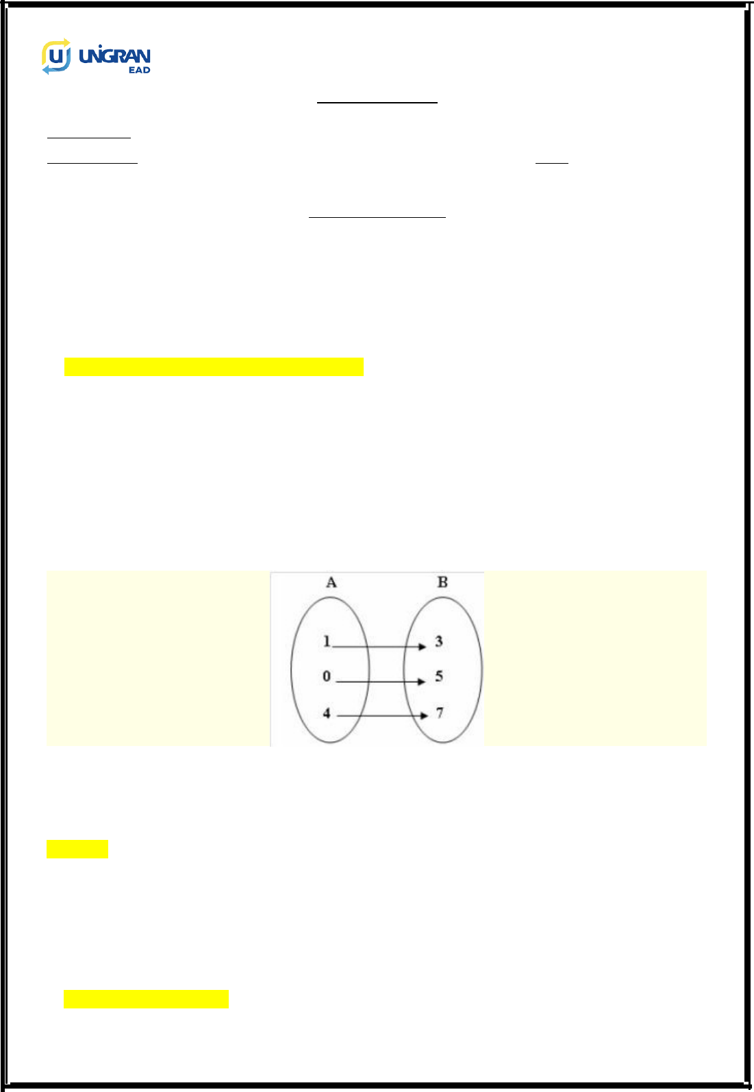 <p>CENTRO UNIVERSITÁRIO DA GRANDE DOURADOS FACULDADE DE CIÊNCIAS EXATAS E DA TERRA</p><p>ENGENHARIA DE PRODUÇÃO</p><p>#ATIVIDADE - 1</p><p>DISCIPLINA: CÁLCULO DIFERENCIAL E INTEGRAL I</p><p>PROFESSOR: Wilson Espindola Passos ANO: 2024</p><p>Resolva as questões</p><p>1- Analisando a função , podemos concluir que:</p><p>a) O gráfico da função é crescente.</p><p>b) O ponto onde a função corta o eixo y é (0, 5).</p><p>c) x = - 5/2é zero da função.</p><p>d) O gráfico da função é decrescente</p><p>2- Relembrando os conceitos de domínio e imagem da função e considerando o diagrama abaixo, que representa uma função de A em B, podemos afirmar que a imagem da função é igual a:</p><p>a){1,0,1}</p><p>b){2,4}</p><p>c){3,5,7}</p><p>d){3,7,8}</p><p>3- Uma função do 1º Grau e uma função do 2º Grau tem como gráfico, respectivamente:</p><p>a) Uma reta e uma parábola</p><p>b) Uma reta e uma elipse</p><p>c) Uma curva e uma reta</p><p>d) Uma reta e uma hipérbole</p><p>4- Dados os conjuntos A={0, 5, 15} e B={0, 5, 10, 15, 20, 25}, seja a relação de A em B expressa pela fórmula y = x + 5. Podemos afirmar que os elementos do conjunto B, que participam da relação, são:</p><p>a) 0, 10 e 20</p><p>b) 0, 20 e 25</p><p>c) 0, 5 e 10</p><p>d) 5, 10 e 20</p><p>5- Sabendo que a função admite 3 como raiz e f(1) = -8, calcule os valores de m e n:</p><p>a)</p><p>b)</p><p>c)</p><p>d)</p><p>6- O gráfico a seguir representa a posição de um carro em movimento numa estrada.</p><p>Determine a posição do carro no instante 7h.</p><p>a) 90 km</p><p>b) 105 km</p><p>c) 110 km</p><p>d) 120 km</p><p>7- Dada a função f : RR definida por , determine</p><p>a)</p><p>b)</p><p>c)</p><p>d)</p><p>8- Através de um estudo sobre o consumo de energia elétrica de uma fábrica, chegou-se à equação C = 400t, em que C é o consumo em KWh e t é o tempo em dias. Quantos dias são necessários para que o consumo atinja 4800 KWh?</p><p>a) 12</p><p>b) 14</p><p>c) 13</p><p>d) 15</p><p>9- Das alternativas abaixo, assinale a única que é correta a respeito da função f(x) = – 2(x + 1)(2 – x).</p><p>a) A função é do primeiro grau e é decrescente, pois a = – 2.</p><p>b) A função é do segundo grau e possui concavidade voltada para baixo, pois a = – 2.</p><p>c) A função é do segundo grau e possui concavidade voltada para cima, pois a = 2.</p><p>d) A função é do primeiro grau e é crescente, pois a = 2.</p><p>e) A função não é do primeiro nem do segundo grau.</p><p>10- A respeito da função f(x) = – 4x2 + 100, assinale a alternativa que seja o resultado da soma entre as coordenadas x e y do vértice.</p><p>a) 50</p><p>b) 100</p><p>c) 150</p><p>d) 200</p><p>e) 250</p><p>11- Qual é a soma das raízes da função f(x) = x2 + 8x – 9?</p><p>a) – 8</p><p>b) 8</p><p>c) 1</p><p>d) – 9</p><p>e) 9</p><p>A- 11</p><p>B- 4</p><p>C- 7</p><p>D-</p><p>E- 7</p><p>F- -7</p><p>G- 3</p><p>H- 100</p><p>I- π</p><p>J- -1</p><p>A- 7/2</p><p>B- 4</p><p>C- 4</p><p>D-</p><p>E- Não tem</p><p>F- 19</p><p>G- 1/3</p><p>H- -4</p><p>I- 12</p><p>J- 12</p><p>image2.jpeg</p><p>image3.png</p><p>image4.png</p><p>image1.jpeg</p><p>image5.png</p><p>image50.png</p>