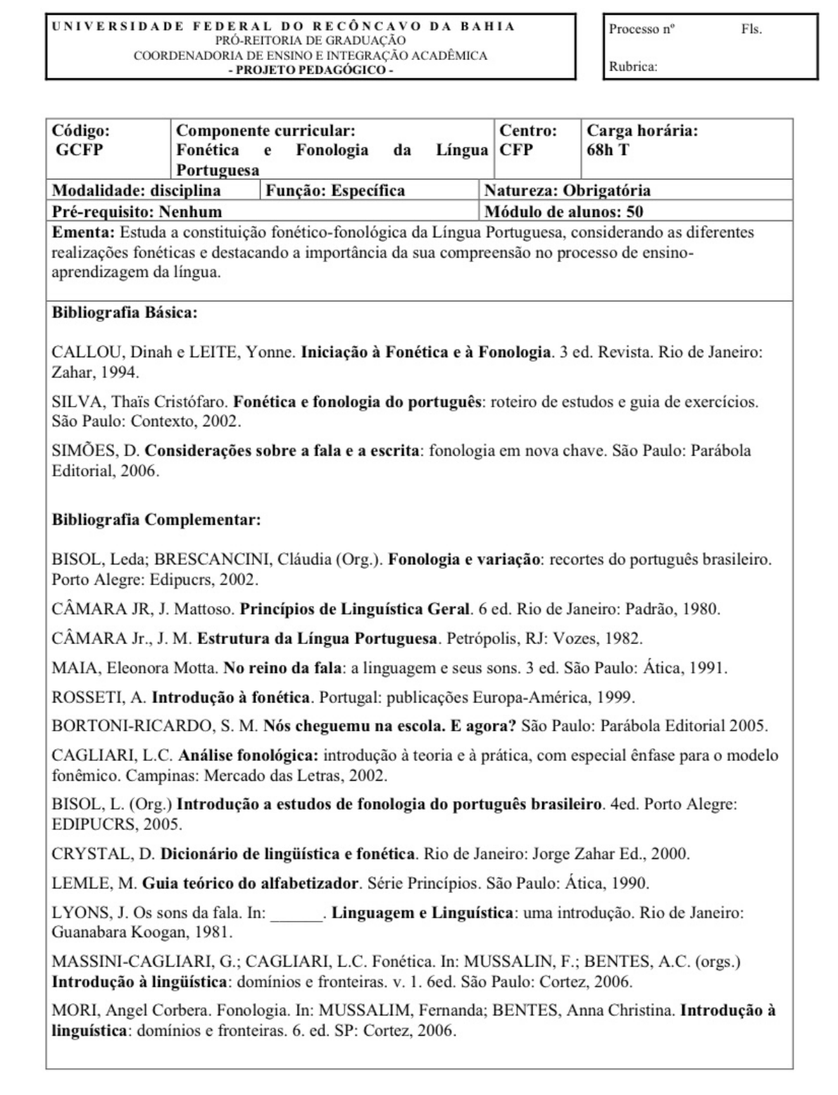 <p>UNIVERSIDADE FEDERAL DO DA BAHIA Processo Fls. PRÓ-REITORIA DE GRADUAÇÃO COORDENADORIA DE ENSINO E INTEGRAÇÃO ACADÊMICA PROJETO PEDAGÓGICO Rubrica: Código: Componente curricular: Centro: Carga horária: GCFP Fonética e Fonologia da Língua CFP 68h T Portuguesa Modalidade: disciplina Função: Específica Natureza: Obrigatória Pré-requisito: Nenhum Módulo de alunos: 50 Ementa: Estuda a constituição fonético-fonológica da Língua Portuguesa, considerando as diferentes realizações fonéticas e destacando a importância da sua compreensão no processo de ensino- aprendizagem da língua. Bibliografia Básica: CALLOU, Dinah e LEITE, Yonne. Iniciação à Fonética e à Fonologia. 3 ed. Revista. Rio de Janeiro: Zahar, 1994. SILVA, Thais Cristófaro. Fonética e fonologia do português: roteiro de estudos e guia de exercícios. São Paulo: Contexto, 2002. D. Considerações sobre a fala e a escrita: fonologia em nova chave. São Paulo: Parábola Editorial, 2006. Bibliografia Complementar: BISOL, Leda; BRESCANCINI, Cláudia (Org.). Fonologia e variação: recortes do português brasileiro. Porto Alegre: Edipucrs, 2002. CÂMARA JR, J. Mattoso. Princípios de Linguística Geral. 6 ed. Rio de Janeiro: Padrão, 1980. CÂMARA Jr., J. M. Estrutura da Língua Portuguesa. Petrópolis, RJ: Vozes, 1982. MAIA, Eleonora Motta. No reino da fala: a linguagem e seus sons. 3 ed. São Paulo: Ática, 1991. ROSSETI, A. Introdução à fonética. Portugal: publicações Europa-América, 1999. BORTONI-RICARDO, S. M. Nós cheguemu na escola. E agora? São Paulo: Parábola Editorial 2005. CAGLIARI, L.C. Análise fonológica: introdução à teoria e à prática, com especial ênfase para o modelo fonêmico. Campinas: Mercado das Letras, 2002. BISOL, L. (Org.) Introdução a estudos de fonologia do português brasileiro. 4ed. Porto Alegre: EDIPUCRS, 2005. CRYSTAL, D. Dicionário de e fonética. Rio de Janeiro: Jorge Zahar Ed., 2000. LEMLE, M. Guia teórico do alfabetizador. Série Princípios. São Paulo: Ática, 1990. LYONS, J. Os sons da fala. In: Linguagem e Linguística: uma introdução. Rio de Janeiro: Guanabara Koogan, 1981. MASSINI-CAGLIARI, G.; CAGLIARI, L.C. Fonética. In: MUSSALIN, F.; BENTES, A.C. (orgs.) Introdução à lingüística: domínios e fronteiras. V. 1. 6ed. São Paulo: Cortez, 2006. MORI, Angel Corbera. Fonologia. In: MUSSALIM, Fernanda; BENTES, Anna Christina. Introdução à linguística: domínios e fronteiras. 6. ed. SP: Cortez, 2006.</p>