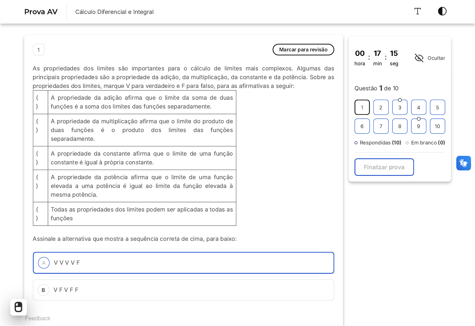 <p>A</p><p>B</p><p>1 Marcar para revisão</p><p>As propriedades dos limites são importantes para o cálculo de limites mais complexos. Algumas das</p><p>principais propriedades são a propriedade da adição, da multiplicação, da constante e da potência. Sobre as</p><p>propriedades dos limites, marque V para verdadeiro e F para falso, para as afirmativas a seguir:</p><p>(</p><p>)</p><p>A propriedade da adição afirma que o limite da soma de duas</p><p>funções é a soma dos limites das funções separadamente.</p><p>(</p><p>)</p><p>A propriedade da multiplicação afirma que o limite do produto de</p><p>duas funções é o produto dos limites das funções</p><p>separadamente.</p><p>(</p><p>)</p><p>A propriedade da constante afirma que o limite de uma função</p><p>constante é igual à própria constante.</p><p>(</p><p>)</p><p>A propriedade da potência afirma que o limite de uma função</p><p>elevada a uma potência é igual ao limite da função elevada à</p><p>mesma potência.</p><p>(</p><p>)</p><p>Todas as propriedades dos limites podem ser aplicadas a todas as</p><p>funções</p><p>Assinale a alternativa que mostra a sequência correta de cima, para baixo:</p><p>V V V V F</p><p>V F V F F</p><p>00</p><p>hora</p><p>: 17</p><p>min</p><p>: 15</p><p>seg</p><p>Ocultar</p><p>Questão 1 de 10</p><p>Respondidas �10� Em branco �0�</p><p>Finalizar prova</p><p>1 2 3 4 5</p><p>6 7 8 9 10</p><p>Feedback</p><p>Prova AV Cálculo Diferencial e Integral</p><p>C</p><p>D</p><p>E</p><p>A</p><p>B</p><p>C</p><p>D</p><p>E</p><p>F V V F F</p><p>F F V V F</p><p>F F F F V</p><p>2 Marcar para revisão</p><p>O limite é a base para o cálculo diferencial e integral. Calcule o valor de .limx→−3 ( + )4x</p><p>x+3</p><p>12</p><p>x+3</p><p>1</p><p>2</p><p>3</p><p>4</p><p>5</p><p>3 Desmarcar para revisão</p><p>BETABETABETABETA</p><p>A</p><p>B</p><p>C</p><p>D</p><p>E</p><p>O gráfico apresenta a função g(x). Marque a alternativa que apresenta um intervalo onde a função é</p><p>derivável.</p><p>�5, 8�</p><p>�4,5�</p><p>�3,5�</p><p>�2,4�</p><p>�4,6�</p><p>4 Marcar para revisão</p><p>Determine a derivada de terceira ordem da função h(x) = x + 3(x �4�  + 8x + 46 2 2</p><p>BETABETABETABETA</p><p>A</p><p>B</p><p>C</p><p>D</p><p>E</p><p>A</p><p>B</p><p>C</p><p>120x �72x3</p><p>30x �36x4 2</p><p>30x �72x3</p><p>30x �72x4</p><p>120x �123</p><p>5 Marcar para revisão</p><p>Marque a alternativa que apresenta uma afirmativa correta em relação aos pontos críticos da função</p><p>g(x) = {</p><p>10 − x, −6 ≤ x ≤ 0</p><p>2x2 − 64√x, 0 < x ≤ 6</p><p>Apresenta pontos críticos em x = 0 e x = 4 , com um ponto de mínimo local em x = 4.</p><p>Apresenta pontos críticos em x = 0 e x = 4 , com um ponto de máximo local em x = 0.</p><p>Apresenta pontos críticos em x = 0 e x = 4 , com um ponto de inflexão em x = 4.</p><p>BETABETABETABETA</p><p>D</p><p>E</p><p>A</p><p>B</p><p>C</p><p>D</p><p>E</p><p>Apresenta apenas um ponto crítico em x = 4, com um ponto de mínimo local em x = 4.</p><p>Apresenta apenas um ponto crítico em x = 0, com um ponto de máximo local em x = 0.</p><p>6 Marcar para revisão</p><p>Determine o valor da integral  .∫0 du</p><p>√2</p><p>2 10x</p><p>1+4x4</p><p>5π</p><p>3</p><p>5π</p><p>7</p><p>3π</p><p>8</p><p>π</p><p>8</p><p>5π</p><p>8</p><p>7 Marcar para revisão</p><p>Determine a família de funções representada por ∫ e2xcos(2x)dx</p><p>BETABETABETABETA</p><p>A</p><p>B</p><p>C</p><p>D</p><p>E</p><p>A</p><p>B</p><p>C</p><p>, k reale2x(cos(2x) − sen(2x)) + k</p><p>, k reale2x(cos(2x) + sen(2x)) + k1</p><p>4</p><p>, k reale2x(sen(2x) − cos(2x)) + k1</p><p>4</p><p>, k reale2x(2cos(2x) + 3sen(2x)) + k</p><p>, k reale2x(−cos(2x) − sen(2x)) + k1</p><p>2</p><p>8 Marcar para revisão</p><p>Ao calcular o comprimento de uma curva usando integrais, estamos essencialmente dividindo a curva em</p><p>pequenos segmentos retos e adicionando suas medidas para obter a medida total. Calcule o comprimento do</p><p>arco da curva   entre os pontos  e  .8y = x4 + 2x−2 x = 1 x = 2</p><p>33</p><p>18</p><p>33</p><p>11</p><p>33</p><p>19</p><p>BETABETABETABETA</p><p>D</p><p>E</p><p>A</p><p>B</p><p>C</p><p>D</p><p>E</p><p>33</p><p>17</p><p>33</p><p>16</p><p>9 Desmarcar para revisão</p><p>A aplicabilidade das derivadas de funções é imensurável, podendo ser aplicadas em diversas áreas de</p><p>estudo e em inúmeros contextos. Sabendo disso, determine a equação da reta tangente a  e</p><p>o ponto ��1,2�.</p><p>y = (5 − 3x)1/3</p><p>y = 3x+ 6.</p><p>y = 4x+ 6.</p><p>y = 5x+ 6.</p><p>y = 6x+ 6.</p><p>y = 7x+ 6.</p><p>10 Marcar para revisão</p><p>BETABETABETABETA</p><p>A</p><p>B</p><p>C</p><p>D</p><p>E</p><p>Determine o volume do sólido gerado pela rotação, em torno do eixo x, do conjunto de pontos formados pela</p><p>função  e o eixo x, para  .f(x) = √x− 3 4 ≤ x ≤ 7</p><p>14π</p><p>3</p><p>7π</p><p>3</p><p>14π</p><p>5</p><p>7π</p><p>5</p><p>3π</p><p>2</p><p>BETABETABETABETA</p>