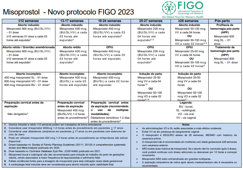 <p>FIGO Misoprostol - Novo protocolo FIGO 2023 International Federation of Gynecology and Obstetrics the Global Voice for Women's Health semanas 13-17 semanas 18-24 semanas 25-27 semanas semanas Pós parto Aborto induzido Aborto induzido Aborto induzido Aborto induzido Aborto induzido Profilaxia de Misoprostol 800 mcg (BU/SL/VV) Misoprostol 400 mcg Misoprostol 400 mcg Misoprostol 200 mcg Misoprostol 50-100 mcg hemorragia pós parto 01 dose (BU/SL/VV) a cada (BU/SL/VV) a cada 03 (BU/SL/VV) a cada VV a cada 04 horas (HPP) semanas 01 dose a cada 03 03 horas até horas até 04 horas até Misoprostol 600 horas até Misoprostol 50-100 mcg mcg SL 01 a cada 02 dose Aborto retido / Gravidez anembrionada Aborto retido OFIU OFIU OFIU Tratamento de Misoprostol 800 mcg (BU/SL/VV) Misoprostol 400 mcg Misoprostol 400 mcg Misoprostol 200 mcg Misoprostol 25-50 mcg hemorragia pós parto 01 dose (BU/SL/VV) a cada (BU/SL/VV) a cada 03 (BU/SL/VV) a cada VV a cada 04 horas (HPP) semanas 01 dose a cada 03 03 horas até horas até expulsão 04 horas até Misoprostol 800 horas até Misoprostol 50-100 mcg mcg SL 01 dose a cada 02 Aborto incompleto Aborto incompleto Aborto incompleto Indução do parto Indução do parto 400 mcg misoprostol SL 01 dose Misoprostol 400 mcg Misoprostol 400 mcg Misoprostol 25-50 Misoprostol 25-50 600 mcg misoprostol 01 dose (BU/SL) a cada 03 (BU/SL) a cada 03 horas W a cada 04 mcg W a cada 04 800 mcg misoprostol BU 01 dose4 horas até expulsão até expulsão horas OU Misoprostol 50-100 Misoprostol 50-100 mcg a cada 02 mcg a cada 02 Preparação cervical antes da Preparação cervical Preparação cervical antes Legenda: aspiração antes da aspiração da aspiração (recomendado BU Misoprostol 400 mcg o uso de SL Não 1-3 horas modalidades) via oral; antes do Dilatadores osmóticos 1-2 dias via vaginal antes do 1. Abortos induzido e retido <12 semanas podem ser manejados de forma Notas: 2. Considerar usar misoprostol 400mcg 1-2 horas antes do procedimento em pacientes 17 anos. As administrações e SL estão associadas a mais efeitos 3. Considerar usar dilatadores osm[oticos em pacientes 17 anos ou em pacientes com estenose de Evitar VV se em presença de sangramento vaginal. colo de útero misoprostol é SEGURO abaixo de 28 semanas, MESMO com histórico de 4. Pode ser utilizado misoprostol 400 mcg 1-2 horas antes do procedimento se mifepristone não estiver cesariana prévia. não é recomendado em mulheres com idade gestacional 228 semanas 5. Doses baseadas no Society of Family Planning Guidelines 20133) A comprehensive systematic com cesariana review and Meta-Analysis publicado em 2020. NÃO existe dose máxima de Se aborto não for concluído após 5 doses, 6. Dose baseada no Cochrane Database Syst Rev. (CD014484) publicado em 2021. você poderá continuar com doses adicionais ou descansar por 12 horas e começar 7. Misoprostol bucal e sublingual não são recomendados para indução do trabalho de parto de gestações sendo associados a maior frequência de taquissistolias e sofrimento Misoprostol NÃO está contraindicado em grandes 8. Faltam evidências fortes para a dosagem de misoprostol para esta indicação nesta idade gestacional A aspiração intrauterina de rotina após aborto medicamentoso não é necessária ou 9. A cardioplegia fetal induzida deve ser considerada para aborto induzido após viabilidade recomendada</p>