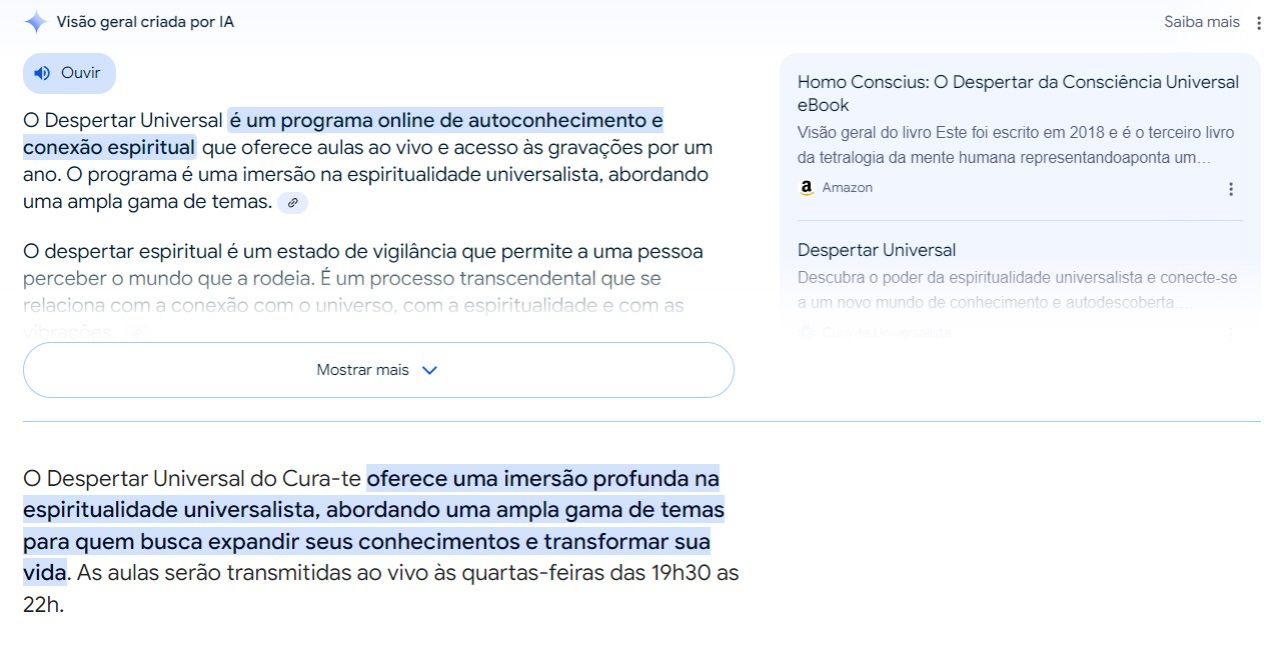 <p>Visão geral criada por IA Saiba mais Ouvir Homo Conscius: Despertar da Consciência Universal eBook Despertar Universal é um programa online de autoconhecimento e Visão geral do livro Este foi escrito em 2018 e é o terceiro livro conexão espiritual que oferece aulas ao vivo e acesso às gravações por um da tetralogia da mente humana representandoaponta um. ano. programa é uma imersão na espiritualidade universalista, abordando a Amazon uma ampla gama de temas. @ despertar espiritual é um estado de vigilância que permite a uma pessoa Despertar Universal perceber mundo que a rodeia. É um processo transcendental que se Descubra o poder da espiritualidade universalista e conecte-se relaciona com a conexão com universo, com a espiritualidade e com as a um novo mundo de conhecimento e autodescoberta Mostrar mais Despertar Universal do Cura-te oferece uma imersão profunda na espiritualidade universalista, abordando uma ampla gama de temas para quem busca expandir seus conhecimentos e transformar sua vida. As aulas serão transmitidas ao vivo às quartas-feiras das 19h30 as 22h.</p>