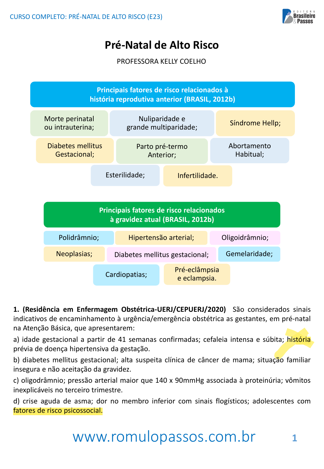 <p>www.romulopassos.com.br</p><p>CURSO COMPLETO: PRÉ-NATAL DE ALTO RISCO (E23)</p><p>1</p><p>Pré-Natal de Alto Risco</p><p>PROFESSORA KELLY COELHO</p><p>Morte perinatal</p><p>ou intrauterina;</p><p>Nuliparidade e</p><p>grande multiparidade;</p><p>Síndrome Hellp;</p><p>Diabetes mellitus</p><p>Gestacional;</p><p>Parto pré-termo</p><p>Anterior;</p><p>Abortamento</p><p>Habitual;</p><p>Esterilidade; Infertilidade.</p><p>Principais fatores de risco relacionados à</p><p>história reprodutiva anterior (BRASIL, 2012b)</p><p>Hipertensão arterial;Polidrâmnio; Oligoidrâmnio;</p><p>Neoplasias; Diabetes mellitus gestacional; Gemelaridade;</p><p>Cardiopatias;</p><p>Pré-eclâmpsia</p><p>e eclampsia.</p><p>Principais fatores de risco relacionados</p><p>à gravidez atual (BRASIL, 2012b)</p><p>1. (Residência em Enfermagem Obstétrica-UERJ/CEPUERJ/2020) São considerados sinais</p><p>indicativos de encaminhamento à urgência/emergência obstétrica as gestantes, em pré-natal</p><p>na Atenção Básica, que apresentarem:</p><p>a) idade gestacional a partir de 41 semanas confirmadas; cefaleia intensa e súbita; história</p><p>prévia de doença hipertensiva da gestação.</p><p>b) diabetes mellitus gestacional; alta suspeita clínica de câncer de mama; situação familiar</p><p>insegura e não aceitação da gravidez.</p><p>c) oligodrâmnio; pressão arterial maior que 140 x 90mmHg associada à proteinúria; vômitos</p><p>inexplicáveis no terceiro trimestre.</p><p>d) crise aguda de asma; dor no membro inferior com sinais flogísticos; adolescentes com</p><p>fatores de risco psicossocial.</p><p>Eliene dos santos da silva - 07193359304</p><p>Polidrâmnio</p><p>corresponde ao</p><p>aumento do volume de</p><p>líquido amniótico,</p><p>baixa do líquido</p><p>amniótico na gravidez</p><p>alto isco</p><p>www.romulopassos.com.br</p><p>CURSO COMPLETO: PRÉ-NATAL DE ALTO RISCO (E23)</p><p>2</p><p>2. (HC-UFU/EBSERH/VUNESP/2019) Constitui fator de risco que pode indicar</p><p>encaminhamento ao pré-natal de alto risco:</p><p>a) Idade menor do que 15 e maior do que 35 anos.</p><p>b) Evidência laboratorial de proteinúria.</p><p>c) Microssomia fetal.</p><p>d) Idade gestacional a partir de 41 semanas confirmadas.</p><p>e) Oligoidrâmnio.</p><p>Vejamos as principais características das síndromes hipertensivas da gestação (BRASIL, 2012):</p><p>• HAS registrada ANTES da gestação, no período que precede a 20ª</p><p>SEMANA de GRAVIDEZ ou além de 12 semanas depois do parto.</p><p>• HAS detectada DEPOIS DA 20ª SEMANA, SEM PROTEINÚRIA,→</p><p>chamada de “transitória” (quando ocorre normalização depois do</p><p>parto) ou “crônica” (quando persistir a hipertensão).</p><p>Hipertensão</p><p>gestacional</p><p>HAS crônica</p><p>• Aparecimento de HAS e PROTEINÚRIA (> 300 mg/24h) depois da 20ª</p><p>SEMANA de gestação em mulheres previamente normotensas.</p><p>Pré-</p><p>eclâmpsia</p><p>Síndromes hipertensivas da gestação</p><p>• Elevação aguda da PA → se agregam proteinúria, trombocitopenia ou</p><p>anormalidades da função hepática, em gestantes portadoras de HAS</p><p>crônica com idade gestacional superior a 20 semanas.</p><p>• Pré-eclâmpsia complicada por CONVULSÕES que não podem ser</p><p>atribuídas a outras causas.</p><p>Eclâmpsia</p><p>Pré-eclâmpsia</p><p>superposta à</p><p>HAS crônica</p><p>É importante ficarmos atentos à definição de pré-eclâmpsia, pois a presença da proteinúria</p><p>é dispensável no diagnóstico da pré-eclâmpsia se a paciente já apresentar níveis</p><p>pressóricos que caracterizem comprometimento de órgãos-alvo (FEBRASGO, 2018;</p><p>AMERICAN COLLEGE OF OBSTETRICIANS AND GYNECOLOGISTS, 2013).</p><p>Eliene dos santos da silva - 07193359304</p><p>www.romulopassos.com.br</p><p>CURSO COMPLETO: PRÉ-NATAL DE ALTO RISCO (E23)</p><p>3</p><p>3. (Residência Multiprofissional em Saúde da Família-UEFS/UEFS/2020) A enfermeira da</p><p>Unidade de Saúde durante a consulta de pré-natal mostra-se preocupada com uma paciente</p><p>gestante, com 22 semanas de gestação, que apresenta um quadro de edema em mãos e face,</p><p>pressão arterial de 140 x 90 mmHg e com presença de proteinúria. A situação descrita</p><p>caracteriza um quadro de:</p><p>a) Pré-eclâmpsia.</p><p>b) Apenas hipertensão crônica.</p><p>c) Gravidez de baixo risco.</p><p>d) Gravidez ectópica.</p><p>e) Eclâmpsia.</p><p>4. (HC-UFU/EBSERH/VUNESP/2019) G.A.S, primigesta, com idade gestacional de 28 semanas,</p><p>é encontrada por vizinhos em sua casa, em quarto escuro, inconsciente, convulsionando</p><p>intermitentemente. Solicitada a equipe do SAMU, que ao chegar ao local constatou a pressão</p><p>arterial da gestante era de 180 X 120 mmHg e foi informado por familiares que a gestação de</p><p>G.A.S. vinha evoluindo sem intercorrências até começar a apresentar “manifestações</p><p>espirituais” há algumas horas. Os sinais e sintomas apresentados são sugestivos de</p><p>a) eclâmpsia.</p><p>b) hipertensão aguda.</p><p>c) pré-eclâmpsia leve.</p><p>d) pré-eclâmpsia grave.</p><p>e) Hellp Síndrome.</p><p>5. (Residência Multiprofissional-UEPA/UEPA/2020) A pré-eclâmpsia afeta aproximadamente</p><p>4% das gravidezes nos Estados Unidos. É a segunda principal causa de mortalidade materna</p><p>em todo o mundo. No Brasil, é responsável por 15% das mortes maternas, algo entre duas a</p><p>três mulheres por dia. As medições de pressão arterial são rotineiramente utilizadas como</p><p>uma ferramenta de triagem para pré-eclâmpsia, sendo a esfigmomanometria o método</p><p>recomendado para medir a pressão arterial durante o período gravídico. Sobre os cuidados</p><p>para a verificação da pressão arterial durante a consulta de enfermagem da mulher durante a</p><p>gravidez, julgue os itens abaixo em Verdadeiro (V) ou Falso(F).</p><p>( ) A gestante deve estar sentada, com as pernas cruzadas e as costas apoiadas. O braço</p><p>de