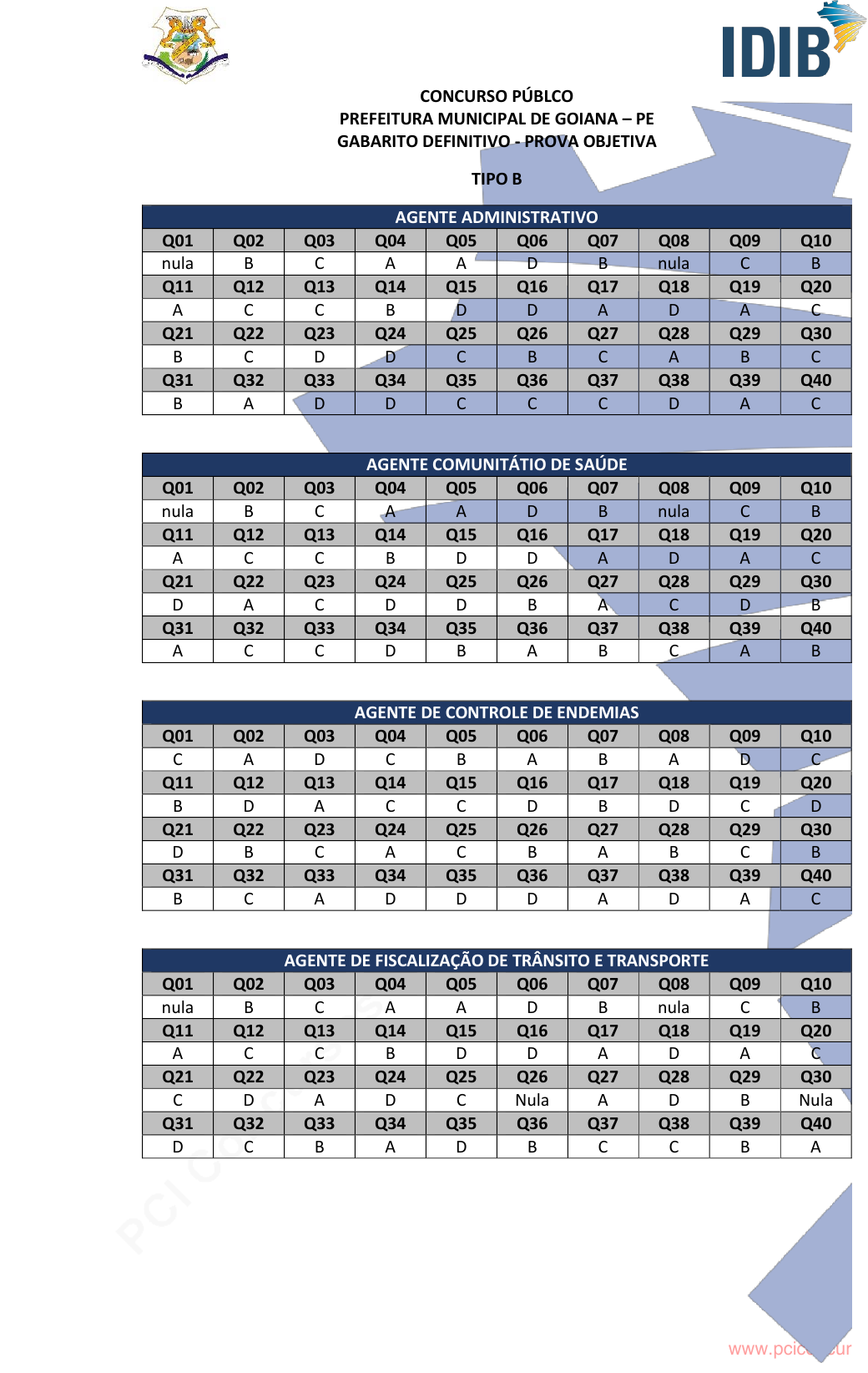 <p>pcimarkpci MjgwNDoxNDVjOjg2Yzc6ZDgwMDoxMDczOjk2ZTg6YzdlNzo0Zjdi:U3VuLCAxNCBKdWwgMjAyNCAxOToyMjo1MSAtMDMwMA==</p><p>www.pciconcursos.com.br</p><p>CONCURSO PÚBLCO</p><p>PREFEITURA MUNICIPAL DE GOIANA – PE</p><p>GABARITO DEFINITIVO - PROVA OBJETIVA</p><p>TIPO B</p><p>AGENTE ADMINISTRATIVO</p><p>Q01 Q02 Q03 Q04 Q05 Q06 Q07 Q08 Q09 Q10</p><p>nula B C A A D B nula C B</p><p>Q11 Q12 Q13 Q14 Q15 Q16 Q17 Q18 Q19 Q20</p><p>A C C B D D A D A C</p><p>Q21 Q22 Q23 Q24 Q25 Q26 Q27 Q28 Q29 Q30</p><p>B C D D C B C A B C</p><p>Q31 Q32 Q33 Q34 Q35 Q36 Q37 Q38 Q39 Q40</p><p>B A D D C C C D A C</p><p>AGENTE COMUNITÁTIO DE SAÚDE</p><p>Q01 Q02 Q03 Q04 Q05 Q06 Q07 Q08 Q09 Q10</p><p>nula B C A A D B nula C B</p><p>Q11 Q12 Q13 Q14 Q15 Q16 Q17 Q18 Q19 Q20</p><p>A C C B D D A D A C</p><p>Q21 Q22 Q23 Q24 Q25 Q26 Q27 Q28 Q29 Q30</p><p>D A C D D B A C D B</p><p>Q31 Q32 Q33 Q34 Q35 Q36 Q37 Q38 Q39 Q40</p><p>A C C D B A B C A B</p><p>AGENTE DE CONTROLE DE ENDEMIAS</p><p>Q01 Q02 Q03 Q04 Q05 Q06 Q07 Q08 Q09 Q10</p><p>C A D C B A B A D C</p><p>Q11 Q12 Q13 Q14 Q15 Q16 Q17 Q18 Q19 Q20</p><p>B D A C C D B D C D</p><p>Q21 Q22 Q23 Q24 Q25 Q26 Q27 Q28 Q29 Q30</p><p>D B C A C B A B C B</p><p>Q31 Q32 Q33 Q34 Q35 Q36 Q37 Q38 Q39 Q40</p><p>B C A D D D A D A C</p><p>AGENTE DE FISCALIZAÇÃO DE TRÂNSITO E TRANSPORTE</p><p>Q01 Q02 Q03 Q04 Q05 Q06 Q07 Q08 Q09 Q10</p><p>nula B C A A D B nula C B</p><p>Q11 Q12 Q13 Q14 Q15 Q16 Q17 Q18 Q19 Q20</p><p>A C C B D D A D A C</p><p>Q21 Q22 Q23 Q24 Q25 Q26 Q27 Q28 Q29 Q30</p><p>C D A D C Nula A D B Nula</p><p>Q31 Q32 Q33 Q34 Q35 Q36 Q37 Q38 Q39 Q40</p><p>D C B A D B C C B A</p><p>pcimarkpci MjgwNDoxNDVjOjg2Yzc6ZDgwMDoxMDczOjk2ZTg6YzdlNzo0Zjdi:U3VuLCAxNCBKdWwgMjAyNCAxOToyMjo1MSAtMDMwMA==</p><p>www.pciconcursos.com.br</p><p>CONCURSO PÚBLCO</p><p>PREFEITURA MUNICIPAL DE GOIANA – PE</p><p>GABARITO DEFINITIVO - PROVA OBJETIVA</p><p>TIPO B</p><p>AGENTE DE TRIBUTOS</p><p>Q01 Q02 Q03 Q04 Q05 Q06 Q07 Q08 Q09 Q10</p><p>nula B C A A D B nula C B</p><p>Q11 Q12 Q13 Q14 Q15 Q16 Q17 Q18 Q19 Q20</p><p>A C C B D D A D A C</p><p>Q21 Q22 Q23 Q24 Q25 Q26 Q27 Q28 Q29 Q30</p><p>B D A A A B D C B D</p><p>Q31 Q32 Q33 Q34 Q35 Q36 Q37 Q38 Q39 Q40</p><p>A C A C D B C D B A</p><p>ALMOXARIFE</p><p>Q01 Q02 Q03 Q04 Q05 Q06 Q07 Q08 Q09 Q10</p><p>nula B C A A D B nula C B</p><p>Q11 Q12 Q13 Q14 Q15 Q16 Q17 Q18 Q19 Q20</p><p>A C C B D D A D A C</p><p>Q21 Q22 Q23 Q24 Q25 Q26 Q27 Q28 Q29 Q30</p><p>A B D A C D A D B C</p><p>Q31 Q32 Q33 Q34 Q35 Q36 Q37 Q38 Q39 Q40</p><p>A A B C B D C A B D</p><p>ANALISTA DE CONTROLE INTERNO</p><p>Q01 Q02 Q03 Q04 Q05 Q06 Q07 Q08 Q09 Q10</p><p>A D C B A B C B D D</p><p>Q11 Q12 Q13 Q14 Q15 Q16 Q17 Q18 Q19 Q20</p><p>A A C D B C C B D A</p><p>Q21 Q22 Q23 Q24 Q25 Q26 Q27 Q28 Q29 Q30</p><p>B A D B D A C B D C</p><p>Q31 Q32 Q33 Q34 Q35 Q36 Q37 Q38 Q39 Q40</p><p>A C C A B D D B A C</p><p>ARQUITETO</p><p>Q01 Q02 Q03 Q04 Q05 Q06 Q07 Q08 Q09 Q10</p><p>A D C B A B C B D D</p><p>Q11 Q12 Q13 Q14 Q15 Q16 Q17 Q18 Q19 Q20</p><p>A A C D B C C B D A</p><p>Q21 Q22 Q23 Q24 Q25 Q26 Q27 Q28 Q29 Q30</p><p>C B C C B Nula B D Nula B</p><p>Q31 Q32 Q33 Q34 Q35 Q36 Q37 Q38 Q39 Q40</p><p>Nula D A C B A Nula B A D</p><p>pcimarkpci MjgwNDoxNDVjOjg2Yzc6ZDgwMDoxMDczOjk2ZTg6YzdlNzo0Zjdi:U3VuLCAxNCBKdWwgMjAyNCAxOToyMjo1MSAtMDMwMA==</p><p>www.pciconcursos.com.br</p><p>CONCURSO PÚBLCO</p><p>PREFEITURA MUNICIPAL DE GOIANA – PE</p><p>GABARITO DEFINITIVO - PROVA OBJETIVA</p><p>TIPO B</p><p>ARTIFICE</p><p>Q01 Q02 Q03 Q04 Q05 Q06 Q07 Q08 Q09 Q10</p><p>B C A B D A D B C A</p><p>Q11 Q12 Q13 Q14 Q15 Q16 Q17 Q18 Q19 Q20</p><p>C D D C B A C Nula D B</p><p>Q21 Q22 Q23 Q24 Q25 Q26 Q27 Q28 Q29 Q30</p><p>C A B B D D A C D Nula</p><p>Q31 Q32 Q33 Q34 Q35 Q36 Q37 Q38 Q39 Q40</p><p>ASSISTENTE ADMINISTRATIVO</p><p>Q01 Q02 Q03 Q04 Q05 Q06 Q07 Q08 Q09 Q10</p><p>C B A D D A A B C B</p><p>Q11 Q12 Q13 Q14 Q15 Q16 Q17 Q18 Q19 Q20</p><p>B D C C A D A C B D</p><p>Q21 Q22 Q23 Q24 Q25 Q26 Q27 Q28 Q29 Q30</p><p>B A C B A B C B D B</p><p>Q31 Q32 Q33 Q34 Q35 Q36 Q37 Q38 Q39 Q40</p><p>A C D B A D D C A C</p><p>ASSISTENTE SOCIAL</p><p>Q01 Q02 Q03 Q04 Q05 Q06 Q07 Q08 Q09 Q10</p><p>A D C B A B C B D D</p><p>Q11 Q12 Q13 Q14 Q15 Q16 Q17 Q18 Q19 Q20</p><p>A A C D B C C B D A</p><p>Q21 Q22 Q23 Q24 Q25 Q26 Q27 Q28 Q29 Q30</p><p>D A B B C C A Nula C C</p><p>Q31 Q32 Q33 Q34 Q35 Q36 Q37 Q38 Q39 Q40</p><p>D B A D A A D D B C</p><p>AUDITOR FISCAL</p><p>Q01 Q02 Q03 Q04 Q05 Q06 Q07 Q08 Q09 Q10</p><p>A D C B A B C B D D</p><p>Q11 Q12 Q13 Q14 Q15 Q16 Q17 Q18 Q19 Q20</p><p>A A C D B C C B D A</p><p>Q21 Q22 Q23 Q24 Q25 Q26 Q27 Q28 Q29 Q30</p><p>A B D B A B A D C C</p><p>Q31 Q32 Q33 Q34 Q35 Q36 Q37 Q38 Q39 Q40</p><p>D C D C A C B B A D</p><p>pcimarkpci MjgwNDoxNDVjOjg2Yzc6ZDgwMDoxMDczOjk2ZTg6YzdlNzo0Zjdi:U3VuLCAxNCBKdWwgMjAyNCAxOToyMjo1MSAtMDMwMA==</p><p>www.pciconcursos.com.br</p><p>CONCURSO PÚBLCO</p><p>PREFEITURA MUNICIPAL DE GOIANA – PE</p><p>GABARITO DEFINITIVO - PROVA OBJETIVA</p><p>TIPO B</p><p>AUXILIAR ADMINISTRATIVO</p><p>Q01 Q02 Q03 Q04 Q05 Q06 Q07 Q08 Q09 Q10</p><p>C A D C B A B A D C</p><p>Q11 Q12 Q13 Q14 Q15 Q16 Q17 Q18 Q19 Q20</p><p>B D A C C D B D C D</p><p>Q21 Q22 Q23 Q24 Q25 Q26 Q27 Q28 Q29 Q30</p><p>C A B D A B C B D C</p><p>Q31 Q32 Q33 Q34 Q35 Q36 Q37 Q38 Q39 Q40</p><p>D A D B A C A B C D</p><p>AUXILIAR DE FARMÁCIA</p><p>Q01 Q02 Q03 Q04 Q05 Q06 Q07 Q08 Q09 Q10</p><p>nula B C A A D B nula C B</p><p>Q11 Q12 Q13 Q14 Q15 Q16 Q17 Q18 Q19 Q20</p><p>A C C B D D A D A C</p><p>Q21 Q22 Q23 Q24 Q25 Q26 Q27 Q28 Q29 Q30</p><p>C A B D B C D A A C</p><p>Q31 Q32 Q33 Q34 Q35 Q36 Q37 Q38 Q39 Q40</p><p>B D D C B D A B A C</p><p>AUXILIAR DE SAÚDE BUCAL</p><p>Q01 Q02 Q03 Q04 Q05 Q06 Q07 Q08 Q09 Q10</p><p>nula B C A A D B nula C B</p><p>Q11 Q12 Q13 Q14 Q15 Q16 Q17 Q18 Q19 Q20</p><p>A C C B D D A D A C</p><p>Q21 Q22 Q23 Q24 Q25 Q26 Q27 Q28 Q29 Q30</p><p>C D A B A D C B D C</p><p>Q31 Q32 Q33 Q34 Q35 Q36 Q37 Q38 Q39 Q40</p><p>B D B C D A A B C A</p><p>AUXILIAR DE SERVIÇOS GERAIS</p><p>Q01 Q02 Q03 Q04 Q05 Q06 Q07 Q08 Q09 Q10</p><p>B C A B D A D B C A</p><p>Q11 Q12 Q13 Q14 Q15 Q16