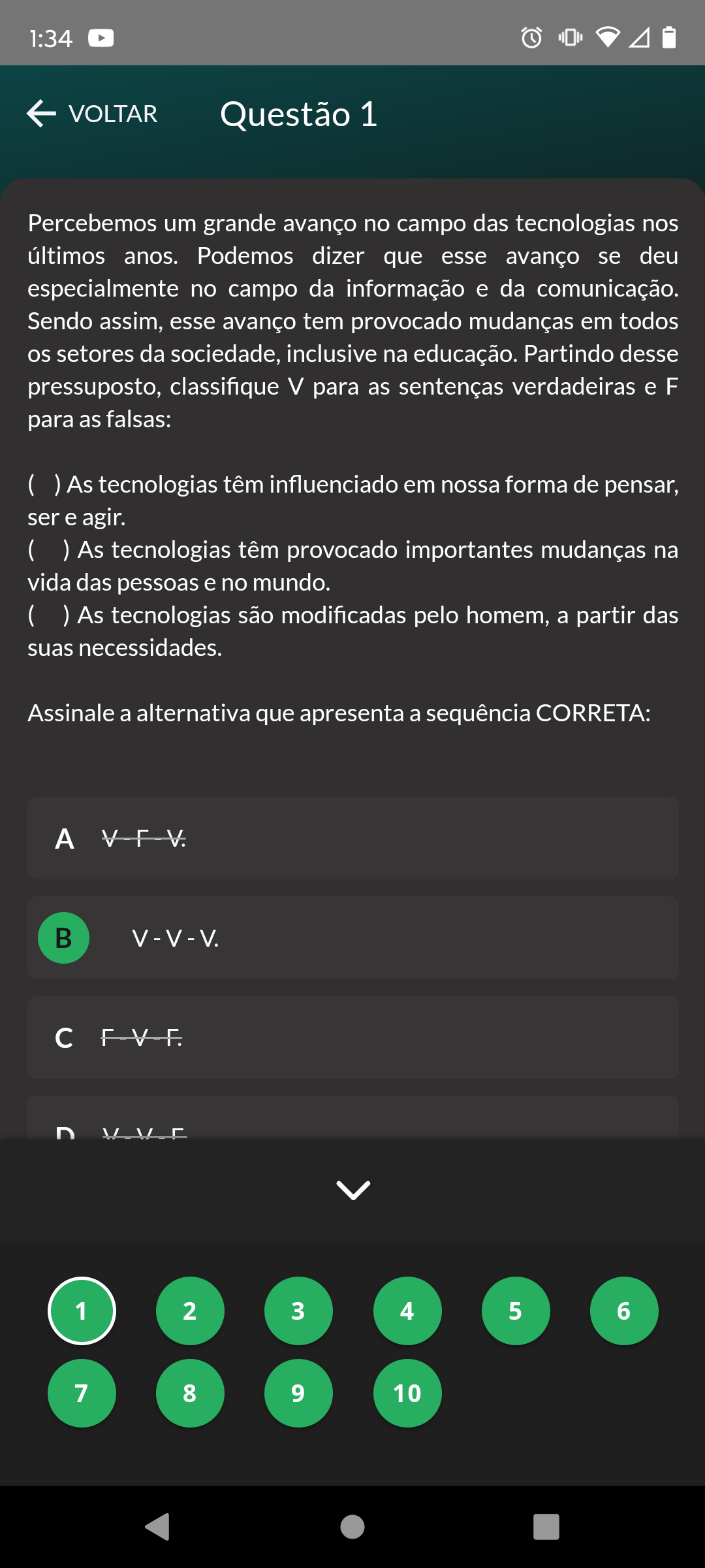 <p>1:34 VOLTAR Questão 1 Percebemos um grande avanço no campo das tecnologias nos últimos anos. Podemos dizer que esse avanço se deu especialmente no campo da informação e da comunicação. Sendo assim, esse avanço tem provocado mudanças em todos os setores da sociedade, inclusive na educação. Partindo desse pressuposto, classifique V para as sentenças verdadeiras e F para as falsas: ( ) As tecnologias têm influenciado em nossa forma de pensar, ser e agir. ( ) As tecnologias têm provocado importantes mudanças na vida das pessoas e no mundo. ( ) As tecnologias são modificadas pelo homem, a partir das suas necessidades. Assinale a alternativa que apresenta a sequência CORRETA: A C D 1 2 3 4 5 6 7 8 9 10</p>