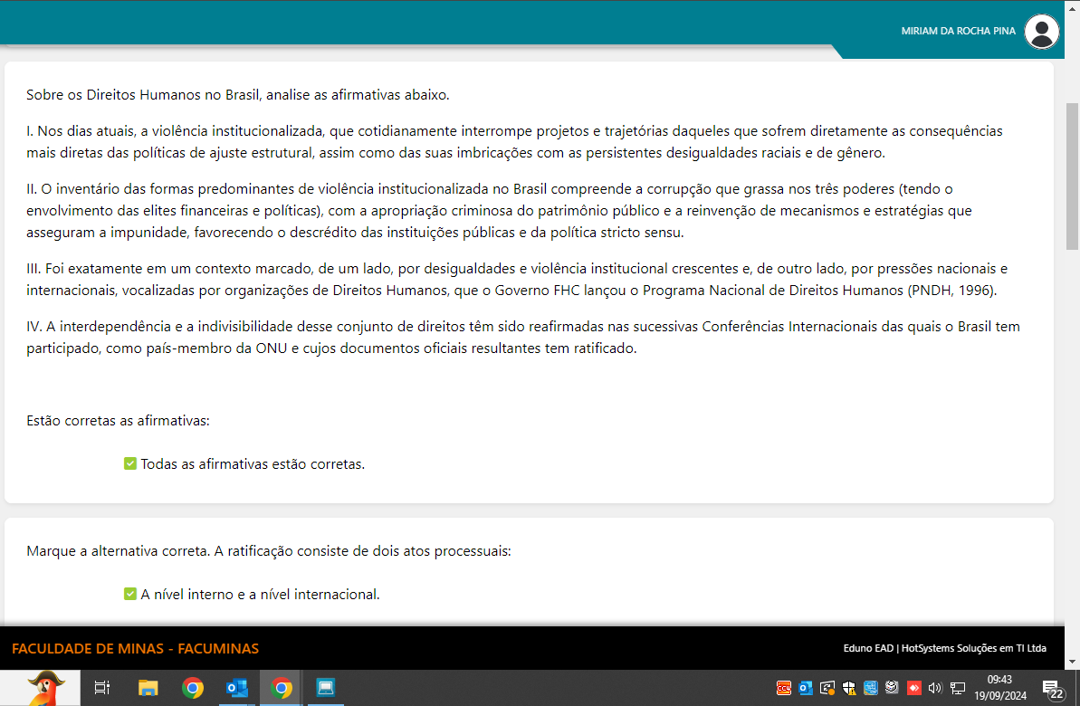 <p>MIRIAM DA ROCHA PINA Sobre os Direitos Humanos no Brasil, analise as afirmativas abaixo. I. Nos dias atuais, a violência institucionalizada, que cotidianamente interrompe projetos e trajetórias daqueles que sofrem diretamente as consequências mais diretas das políticas de ajuste estrutural, assim como das suas imbricações com as persistentes desigualdades raciais e de gênero. II. inventário das formas predominantes de violência institucionalizada no Brasil compreende a corrupção que grassa nos três poderes (tendo envolvimento das elites financeiras e políticas), com a apropriação criminosa do patrimônio público e a reinvenção de mecanismos e estratégias que asseguram a impunidade, favorecendo descrédito das instituições públicas e da política stricto sensu. III. Foi exatamente em um contexto marcado, de um lado, por desigualdades e violência institucional crescentes e, de outro lado, por pressões nacionais e internacionais, vocalizadas por organizações de Direitos Humanos, que Governo FHC lançou Programa Nacional de Direitos Humanos (PNDH, 1996). IV. A interdependência e a indivisibilidade desse conjunto de direitos têm sido reafirmadas nas sucessivas Conferências Internacionais das quais Brasil tem participado, como país-membro da ONU e cujos documentos oficiais resultantes tem ratificado. Estão corretas as afirmativas: Todas as afirmativas estão Marque a alternativa correta. A ratificação consiste de dois atos processuais: A nível interno e a nível FACULDADE DE MINAS - FACUMINAS Eduno EAD I HotSystems Soluções em TI Ltda 09:43 19/09/2024 22</p>