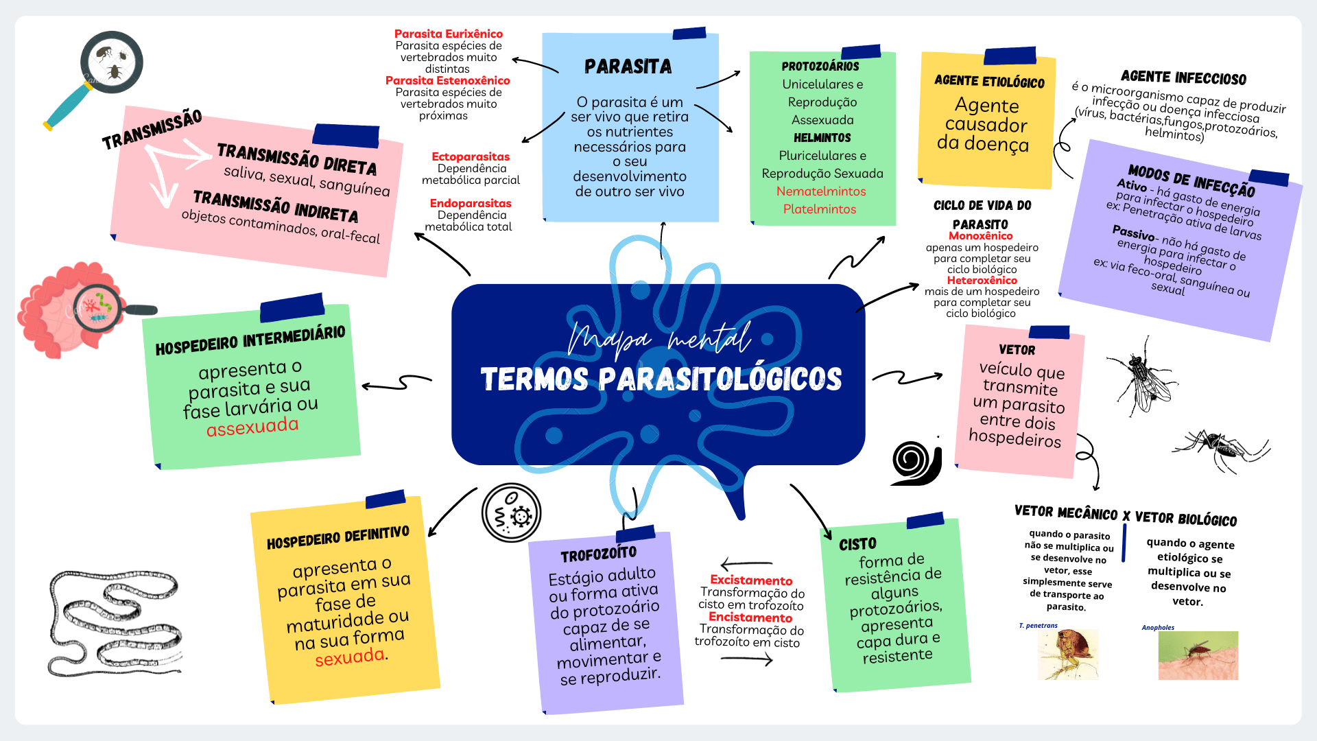 <p>Parasita Eurixênico Parasita espécies de vertebrados muito distintas PARASITA PROTOZOÁRIOS Parasita Estenoxênico AGENTE ETIOLÓGICO AGENTE INFECCIOSO Unicelulares e Parasita espécies de vertebrados muito O parasita é um Reprodução Agente microorganismo infecção capaz de produzir próximas ser vivo que retira Assexuada causador os nutrientes (vírus, ou helmintos) doença HELMINTOS necessários para da doença TRANSMISSÃO DIRETA Ectoparasitas Pluricelulares e o seu Dependência saliva, sexual, sanguínea desenvolvimento Reprodução Sexuada metabólica parcial Ativo MODOS DE INFECÇÃO de outro ser vivo Nematelmintos TRANSMISSÃO INDIRETA Endoparasitas Platelmintos CICLO DE VIDA DO Dependência ex: Penetração energia para infectar há gasto de objetos oral-fecal PARASITO metabólica total Monoxênico apenas um hospedeiro energia não há ativa de larvas de para gasto para completar seu ciclo biológico ex: via Heteroxênico mais de um hospedeiro o ou para completar seu ciclo biológico HOSPEDEIRO INTERMEDIÁRIO mental VETOR apresenta o TERMOS PARASITOLÓGICOS veículo que parasita e sua transmite fase larvária ou um parasito assexuada entre dois hospedeiros VETOR MECÂNICO X VETOR BIOLÓGICO HOSPEDEIRO DEFINITIVO quando parasito CISTO não se multiplica ou quando o agente forma de se desenvolve no etiológico se apresenta o Estágio adulto Excistamento resistência de vetor, esse multiplica ou se simplesmente serve parasita em sua desenvolve no ou forma ativa Transformação do alguns de transporte ao fase de vetor. capaz protozoário de se cisto em do Encistamento protozoários, parasito. maturidade ou Transformação do apresenta T. penetrans Anopholes na sua forma alimentar, em cisto capa dura e sexuada. movimentar e resistente se reproduzir.</p>