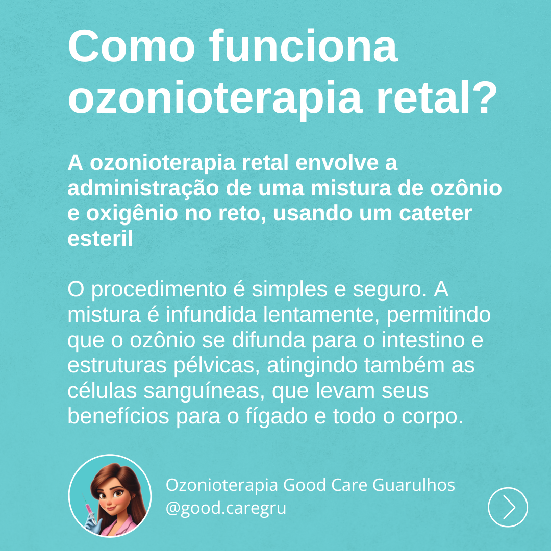 <p>Como funciona ozonioterapia retal? A ozonioterapia retal envolve a administração de uma mistura de ozônio e oxigênio no reto, usando um cateter esteril O procedimento é simples e seguro. A mistura é infundida lentamente, permitindo que ozônio se difunda para intestino e estruturas pélvicas, atingindo também as células sanguíneas, que levam seus benefícios para fígado e todo corpo. Ozonioterapia Good Care Guarulhos @good.caregru ></p>