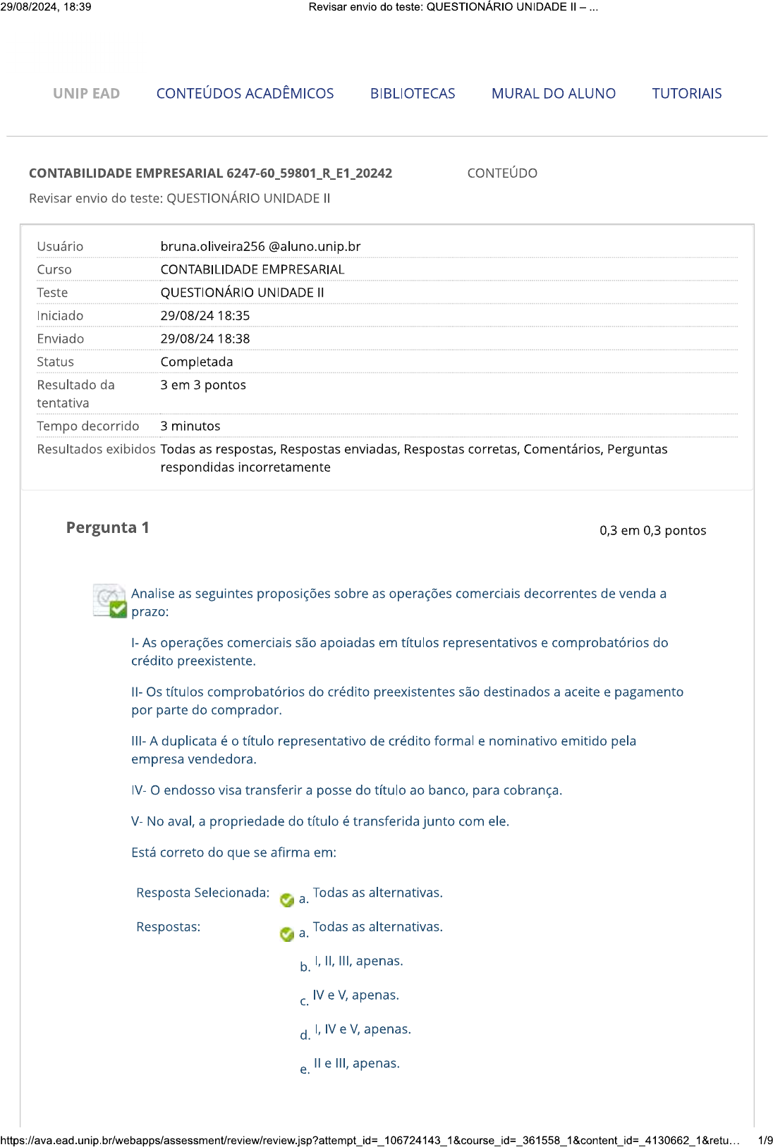 <p>29/08/2024, 18:39 Revisar envio do teste: QUESTIONÁRIO UNIDADE - UNIP EAD CONTEÚDOS ACADÊMICOS BIBLIOTECAS MURAL DO ALUNO TUTORIAIS CONTABILIDADE EMPRESARIAL 6247-60_59801_R_E1_2024 CONTEÚDO Revisar envio do teste: QUESTIONÁRIO UNIDADE Usuário bruna.oliveira256@aluno.unip.br Curso CONTABILIDADE EMPRESARIAL Teste QUESTIONÁRIO UNIDADE Iniciado 29/08/24 18:35 Enviado 29/08/24 18:38 Status Completada Resultado da 3 em 3 pontos tentativa Tempo decorrido 3 minutos Resultados exibidos Todas as respostas, Respostas enviadas, Respostas corretas, Comentários, Perguntas respondidas incorretamente Pergunta 1 0,3 em 0,3 pontos Analise as seguintes proposições sobre as operações comerciais decorrentes de venda a prazo: I- As operações comerciais são apoiadas em títulos representativos e comprobatórios do crédito preexistente. II- Os títulos comprobatórios do crédito preexistentes são destinados a aceite e pagamento por parte do comprador. III- A duplicata é o título representativo de crédito formal e nominativo emitido pela empresa vendedora. IV- O endosso visa transferir a posse do título ao banco, para cobrança. V- No aval, a propriedade do título é transferida junto com ele. Está correto do que se afirma em: Resposta Selecionada: Todas as alternativas. a. Respostas: Todas as alternativas. a. b. I, II, III, apenas. IV e V, apenas. C. d. I, IV e V, apenas. e III, apenas. e. 1/9</p><p>29/08/2024, 18:39 Revisar envio do teste: QUESTIONÁRIO UNIDADE Comentário Resposta: A da resposta: Comentário: Nas operações pós-fixadas tem-se somente a taxa de juros, ficando a representação da inflação exatamente registrada pela sua efetiva variação. Assim nas operações pós-fixadas é aplicada uma taxa de juros, mais um índice de preços, uma moeda estrangeira, ou quaisquer outros indicadores, que venha identificar a variação inflacionária do período contratado, quer ela venha de empréstimos ou aplicações financeiras. Endosso é o ato cambiário pelo qual o credor de título nominativo transmite os seus direitos a terceiros. É lançado no título sob a forma de assinatura do credor originário. Já o aval é uma garantia típica dos títulos de créditos. É uma garantia pessoal (não real), mas isto não quer dizer que se refere a apenas uma pessoa. Avalista é quem presta aval, também chamado de dador de aval. O beneficiado do aval é o avalizado. Quem endossa é chamado de endossante e quem recebe é endossatário. endosso vincula o endossante ao endossatário, tornando o endossante codevedor do título. Pergunta 2 0,3 em 0,3 pontos As aplicações financeiras visam rentabilizar as disponibilidades em dinheiro e os empréstimos que uma empresa contrata têm o objetivo de complementar o capital próprio para financiar as operações comerciais ou viabilizar um investimento. Sobre as empresas e seus recursos financeiros, assinale a alternativa correta: Resposta a. Selecionada: Caso os recursos sejam excedentes as empresas podem investi-los no mercado financeiro. Respostas: a. Caso os recursos sejam excedentes as empresas podem investi-los no mercado financeiro. b. Caso os recursos sejam excedentes a empresa só pode investir em sua atividade principal. C. Os investimentos de recursos, se feitos no mercado financeiro, são conhecidos como operações de captação de recursos. d. Os CDBs, fundos de renda fixa, fundos de renda variável não fazem parte do mercado financeiro face sua própria natureza. Todas as alternativas estão erradas. e. Comentário da Resposta A resposta: Comentário: Caso os recursos da empresa sejam excedentes e a empresa não tenha interesse em investir em sua atividade principal, para protegê-los, pode investi-los no mercado financeiro (bancos, financeiras). Essas operações são conhecidas como aplicações financeiras. 2/9</p><p>29/08/2024, 18:39 Revisar envio do teste: QUESTIONÁRIO UNIDADE Pergunta 3 0,3 em 0,3 pontos As decisões de investimento e financiamento partem de análises de soluções que envolvem estratégia, custos e benefícios e impactam no direcionamento e resultado de negócios e empresas. Assinale para as atividades que são de INVESTIMENTO e F para as atividades de FINANCIAMENTO em uma entidade empresária: Certificado de Depósitos Bancários. Fundos de Renda Fixa. Empréstimos. Ações de Outras Companhias. Assinale a sequência correta, de cima para baixo: Resposta Selecionada: I, I, F, e a. Respostas: I, I, e a. b. I, F, I, e I. F, I, I, e F. C. d. e. Comentário da Resposta: A resposta: Comentário: CDB, renda fixa, ações de outras companhias e debêntures são investimentos, ou seja, direitos da companhia. Já os empréstimos são obrigações exigíveis, ou seja, a empresa precisa pagar. Pergunta 4 0,3 em 0,3 pontos Com relação à taxa de juros e aos rendimentos auferidos ao final da aplicação, temos que: Resposta a. Selecionada: O que difere uma operação prefixada da pós-fixada é a maneira como se aplica a taxa de juros. Respostas: a. que difere uma operação prefixada da pós-fixada é a maneira como se aplica a taxa de juros. b. Nas operações pós-fixadas embute-se na taxa de juros uma expectativa inflacionária enquanto nas operações prefixadas somente a taxa de juros. C. A contabilização da aplicação é: D Bancos movimento; C Aplicações financeiras.</p><p>29/08/2024, 18:39 Revisar envio do teste: QUESTIONÁRIO UNIDADE d. A contabilização da receita auferida ao final da aplicação é: D Rendimentos sobre aplicação financeira; D Ganho com variação monetária; C Aplicações financeiras. e. Nas operações pós-fixadas embute-se na taxa de juros uma expectativa inflacionária enquanto nas operações prefixadas tem-se somente a taxa inflacionária. Comentário Resposta A da resposta: Comentário: Nas operações pós-fixadas tem-se somente a taxa de juros, ficando a representação da inflação exatamente registrada pela sua efetiva variação. Assim, nas operações pós-f
