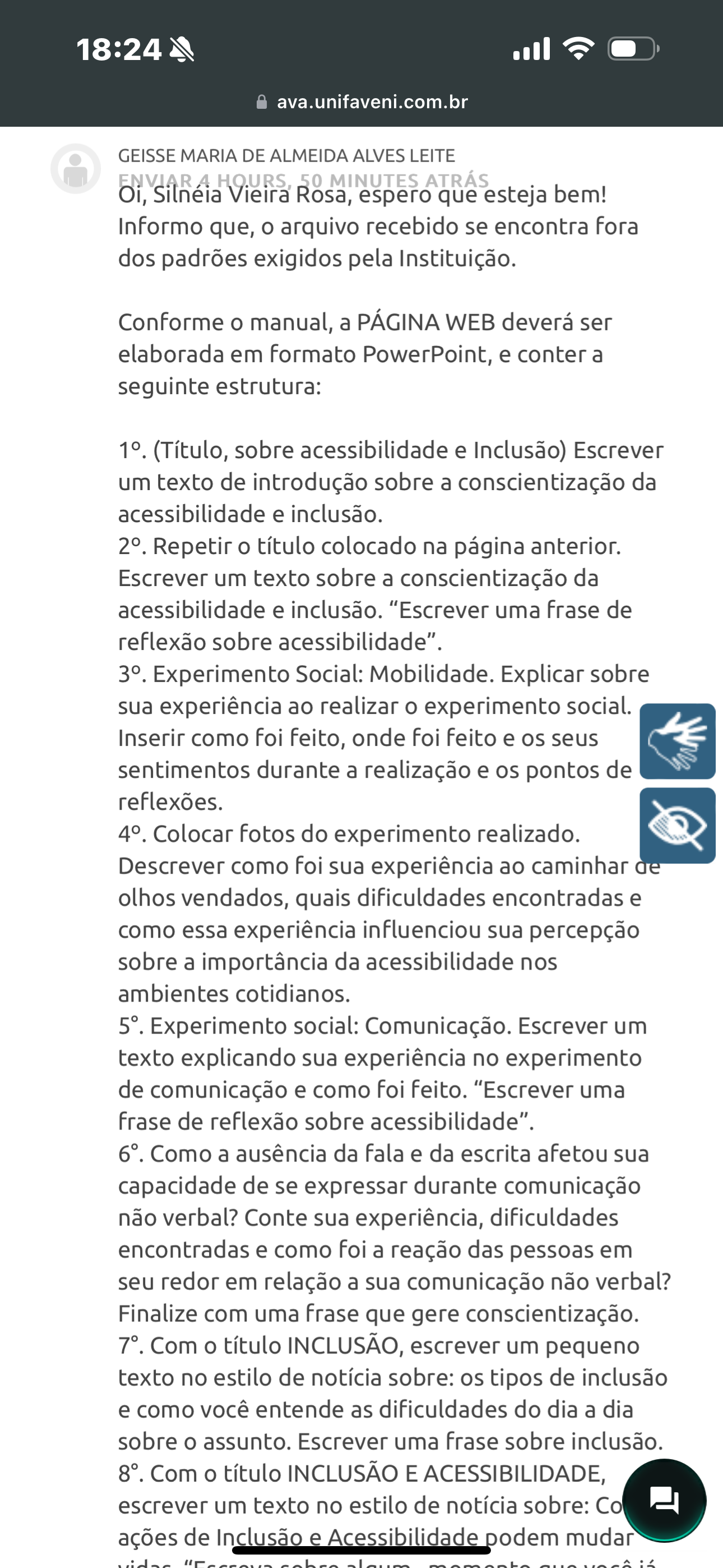 <p>18:24 ava.unifaveni.com.br GEISSE MARIA DE ALMEIDA ALVES LEITE ENVIAR 50 MINUTES ATRÁS Oi, Silnéia Vieira Rosa, espero que esteja bem! Informo que, o arquivo recebido se encontra fora dos padrões exigidos pela Instituição. Conforme o manual, a PÁGINA WEB deverá ser elaborada em formato PowerPoint, e conter a seguinte estrutura: 1°. (Título, sobre acessibilidade e Inclusão) Escrever um texto de introdução sobre a conscientização da acessibilidade e inclusão. 2°. Repetir o título colocado na página anterior. Escrever um texto sobre a conscientização da acessibilidade e inclusão. "Escrever uma frase de reflexão sobre acessibilidade". Experimento Social: Mobilidade. Explicar sobre sua experiência ao realizar o experimento social. Inserir como foi feito, onde foi feito e os seus sentimentos durante a realização e os pontos de reflexões. Colocar fotos do experimento realizado. Descrever como foi sua experiência ao caminhar de olhos vendados, quais dificuldades encontradas e como essa experiência influenciou sua percepção sobre a importância da acessibilidade nos ambientes cotidianos. Experimento social: Comunicação. Escrever um texto explicando sua experiência no experimento de comunicação e como foi feito. "Escrever uma frase de reflexão sobre acessibilidade". Como a ausência da fala e da escrita afetou sua capacidade de se expressar durante comunicação não verbal? Conte sua experiência, dificuldades encontradas e como foi a reação das pessoas em seu redor em relação a sua comunicação não verbal? Finalize com uma frase que gere conscientização. Com o título INCLUSÃO, escrever um pequeno texto no estilo de notícia sobre: os tipos de inclusão e como você entende as dificuldades do dia a dia sobre o assunto. Escrever uma frase sobre inclusão. Com o título INCLUSÃO E ACESSIBILIDADE, escrever um texto no estilo de notícia sobre: Co ações de Inclusão e Acessibilidade podem mudar</p>