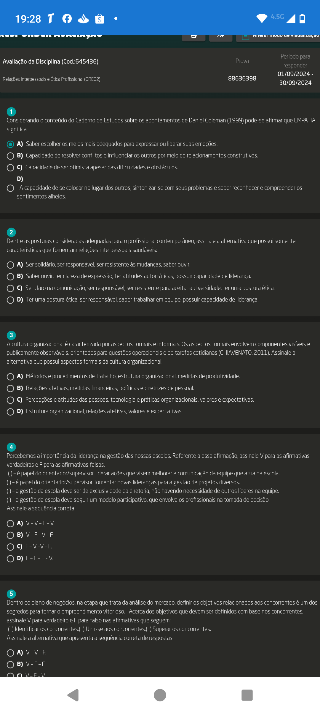<p>4.5G S Período para Avaliação da Disciplina (Cod.:645436) Prova responder 01/09/2024 Relações Interpessoais e Ética Profissional (ORE02) 88636398 30/09/2024 1 Considerando conteúdo do Caderno de Estudos sobre os apontamentos de Daniel Goleman (1999) pode-se afirmar que EMPATIA significa: A) Saber escolher os meios mais para expressar ou liberar suas emoções. B) Capacidade de resolver conflitos e influenciar os outros por meio de relacionamentos construtivos. C) Capacidade de ser otimista apesar das dificuldades e obstáculos D) A capacidade de se colocar no lugar dos sintonizar-se com seus problemas e saber reconhecer e compreender os sentimentos alheios 2 Dentre as posturas consideradas adequadas para profissional contemporâneo, assinale a alternativa que possui somente características que fomentam relações interpessoais saudáveis: A) Ser solidário, ser responsável, ser resistente às mudanças, saber B) Saber ouvir, ter clareza de expressão, ter atitudes autocráticas, possuir capacidade de liderança C) Ser claro na ser responsável, ser resistente para aceitar a diversidade, ter uma postura ética. D) Ter uma postura ética, ser saber trabalhar em equipe, possuir capacidade de liderança. 3 A cultura organizacional é caracterizada por aspectos formais e informais. Os aspectos formais envolvem componentes visíveis e publicamente orientados para questões operacionais e de tarefas cotidianas (CHIAVENATO, Assinale a alternativa que possui aspectos formais da cultura organizacional. A) Métodos e procedimentos de trabalho, estrutura organizacional, medidas de produtividade. B) Relações afetivas. medidas financeiras, políticas e diretrizes de pessoal. C) Percepções e atitudes das pessoas, tecnologia e práticas organizacionais, valores e expectativas. D) Estrutura organizacional, relações afetivas, valores e expectativas. 4 Percebemos a importância da liderança na gestão das nossas escolas Referente a essa afirmação, assinale V para as afirmativas verdadeiras e F para as afirmativas falsas. () é papel do orientador/supervisor liderar ações que visem melhorar a comunicação da equipe que atua na escola. () é papel do orientador/supervisor fomentar novas lideranças para a gestão de projetos () a gestão da escola deve ser de exclusividade da diretoria, não havendo necessidade de outros líderes na equipe. a gestão da escola deve seguir um modelo participativo, que envolva os profissionais na tomada de decisão Assinale a seguência correta: B) V-F-V-F C) D) 5 Dentro do plano de negócios, na etapa que trata da análise do mercado, definir os objetivos relacionados aos concorrentes é um dos segredos para tornar empreendimento vitorioso. Acerca dos objetivos que devem ser definidos com base nos concorrentes. assinale V para verdadeiro e F para falso nas afirmativas que seguem: Identificar os concorrentes. ) Unir-se aos concorrentes Superar os concorrentes. Assinale a alternativa que apresenta a seguência correta de respostas V-V-F B) V-F-V</p>