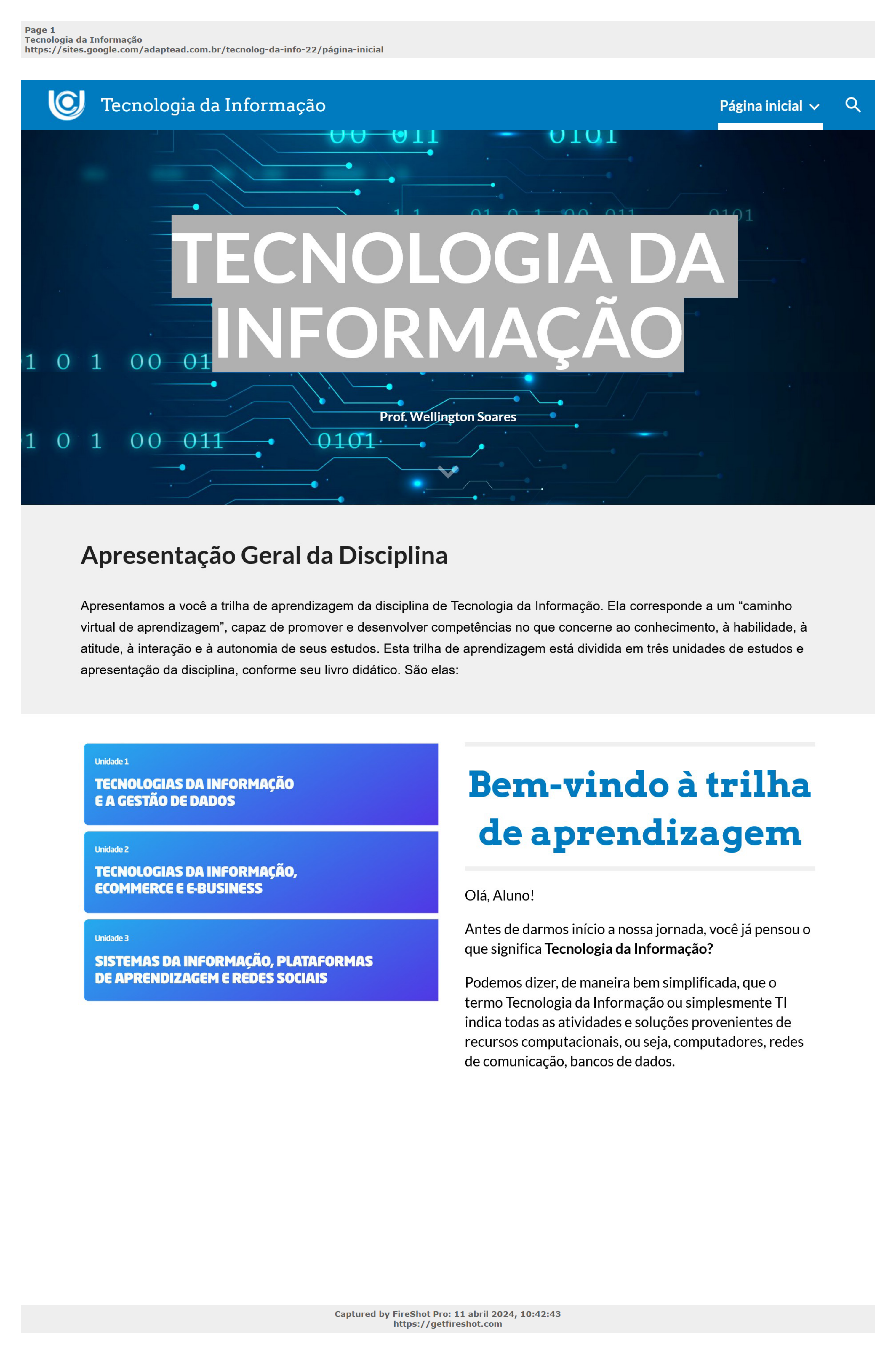<p>Tecnologia da Informação Página inicial</p><p>Pular para o conteúdo principal Pular para a navegação</p><p>TECNOLOGIA DA</p><p>INFORMAÇÃO</p><p>Prof. Wellington Soares</p><p>Apresentação Geral da Disciplina</p><p>Apresentamos a você a trilha de aprendizagem da disciplina de Tecnologia da Informação. Ela corresponde a um “caminho</p><p>virtual de aprendizagem”, capaz de promover e desenvolver competências no que concerne ao conhecimento, à habilidade, à</p><p>atitude, à interação e à autonomia de seus estudos. Esta trilha de aprendizagem está dividida em três unidades de estudos e</p><p>apresentação da disciplina, conforme seu livro didático. São elas:</p><p>Bem-vindo à trilha</p><p>de aprendizagem</p><p>Olá, Aluno!</p><p>Antes de darmos início a nossa jornada, você já pensou o</p><p>que significa Tecnologia da Informação?</p><p>Podemos dizer, de maneira bem simplificada, que o</p><p>termo Tecnologia da Informação ou simplesmente TI</p><p>indica todas as atividades e soluções provenientes de</p><p>recursos computacionais, ou seja, computadores, redes</p><p>de comunicação, bancos de dados.</p><p>E o profissional de tecnologia é quem se utiliza tecnologias para gerar, manipular e gerir informações, e gerar resultados para as</p><p>organizações. Pois a informação é um dos principais patrimônios para empresas e indivíduos. Por isso, é fundamental que saibamos</p><p>tirar o melhor proveito e fazer a correta utilização de ferramentas e métodos para que se alcance bons resultados com o menor</p><p>custo possível.</p><p>O objetivo dessa disciplina está voltado em apresentar para você, Aluno, como os sistemas de informação encontram-se presentes</p><p>nas mais variadas atividades do nosso cotidiano e demonstrar a sua aplicabilidade nas diversas áreas. Também conheceremos</p><p>desde a importância dos dados, até como eles são fundamentais na atualidade para os negócios. Bem como garantir que eles se</p><p>mantenham em segurança.</p><p>Em pauta</p><p>Para saber mais escute o podcast</p><p>Disponível aqui</p><p>Avançar</p><p>UNICESUMAR | UNIVERSO EAD</p><p>Tecnologia da Informação Página inicial</p><p>Pular para o conteúdo principal Pular para a navegação</p><p>TECNOLOGIAS DA INFORMAÇÃO E A</p><p>GESTÃO DE DADOS</p><p>OBJETIVOS DE APRENDIZAGEM</p><p>A partir do estudo desta unidade, você deverá ser capaz de:</p><p>Capacitar o aluno a compreender a estrutura organizacional de um sis tema de informação, suas variantes e influência no dia a</p><p>dia das organi zações;</p><p>Compreender o papel estratégico da Gestão da Informação;</p><p>Compreender a aplicação mercadológica desses princípios em diversas ocasiões e empresas;</p><p>Compreender a força das técnicas, tecnologias de coleta e manipulação de dados, seu papel na sociedade e perspectivas de</p><p>futuro.</p><p>PLANO DE ESTUDOS</p><p>Esta unidade está dividida em cinco tópicos. No decorrer da unidade você encontrará autoatividades com o objetivo de reforçar o</p><p>conteúdo apresentado.</p><p>TÓPICO 1 – Tecnologias da informação e as mudanças globais</p><p>TÓPICO 2 – Tecnologia da Informação: definições, estrutura e papel nas organizações</p><p>TÓPICO 3 – Sistemas de Informação e seu papel estratégico TÓPICO 4 – A quarta Revolução Industrial</p><p>TÓPICO 5 – O papel da Tecnologia da Infomação na transformação digital de negócios</p><p>Chamada</p><p>Preparado para ampliar seus conhecimentos? Respire e vamos em frente! Procure um ambiente</p><p>que facilite a concentração, assim absorverá melhor as informações.</p><p>Em pauta</p><p>Para saber mais escute o podcast</p><p>Disponível aqui</p><p>Unidade 1</p><p>Começamos esta primeira unidade estudando sobre a tecnologia da informação e a gestão de dados. Convidamos você a verificar</p><p>os objetivos desta aprendizagem:</p><p>Capacitar o aluno a compreender a estrutura organizacional de um sistema de informação, suas variantes e influência no dia a</p><p>dia das organizações.</p><p>Compreender o papel estratégico da gestão da Informação.</p><p>Compreender a aplicação mercadológica desses princípios em diversas ocasiões e empresas.</p><p>Compreender a força das técnicas e tecnologias de coleta e manipulação de dados, seu papel na sociedade e perspectivas de</p><p>futuro.</p><p>Para que você possa alcançar esses objetivos dividimos esta unidade em cinco tópicos:</p><p>TÓPICO 1</p><p>Tecnologias da informação e as mudanças globais</p><p>Você já parou para pensar o quanto a tecnologia evolui nos últimos anos, e o quanto isso permitiu a conexão do mundo. Hoje,</p><p>falamos com qualquer parte do mundo, instantaneamente.</p><p>Conecte-se</p><p>E veja como esse processo foi rápido, convidamos você a assistir a duas palestras de Kevin Kelly,</p><p>um dos mais influentes pensadores sobre as transformações provocadas pela tecnologia, sobre</p><p>essa evolução.</p><p>Palestra 1</p><p>Palestra 2</p><p>Continuando com a evolução da tecnologia, vamos avançar para o próximo tópico:</p><p>TÓPICO 2</p><p>Tecnologia da Informação: definições, estrutura e papel nas organizações.</p><p>Você já parou para pensar no valor da informação? Ou o que aconteceria se um banco perdesse todos os dados de seus clientes?</p><p>Por isso, podemos afirmar que a informação é um bem que tem alto valor para as organizações, pois elas são essenciais para a sua</p><p>sobrevivência. Permitindo as organizações tomar mais decisões precisas para os seus negócios.</p><p>Conecte-se</p><p>Clique no link abaixo e leia um art igo que fala especificamente sobre o valor da informação para</p><p>as organizações !</p><p>Delineando o valor do sistema de informação de uma organização</p><p>TÓPICO 3</p><p>Sistemas de Informação e seu papel estratégico</p><p>Até o momento, já vimos como a utilização e informação, transformou o n
