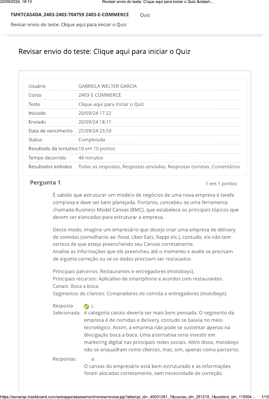 <p>20/09/2024, 18:13 Revisar envio do teste: Clique aqui para iniciar o Quiz &ndash.. TMKTCAS4DA_2403-2403-704759 2403-E-COMMERCE Quiz Revisar envio do teste: Clique aqui para iniciar o Quiz Revisar envio do teste: Clique aqui para iniciar Quiz Usuário GABRIELA WELTER GARCIA Curso 2403-E-COMMERCE Teste Clique aqui para iniciar o Quiz Iniciado 20/09/24 17:22 Enviado 20/09/24 18:11 Data de vencimento 25/09/24 23:59 Status Completada Resultado da tentativa 10 em 10 pontos Tempo decorrido 48 minutos Resultados exibidos Todas as respostas, Respostas enviadas, Respostas corretas, Comentários Pergunta 1 1 em 1 pontos É sabido que estruturar um modelo de negócios de uma nova empresa é tarefa complexa e deve ser bem planejada. Portanto, concebeu-se uma ferramenta chamada Business Model Canvas (BMC), que estabelece os principais tópicos que devem ser elencados para a empresa. Desse modo, imagine um empresário que deseje criar uma empresa de delivery de comidas (semelhante ao Ifood, Uber Eats, Rappi etc.), contudo, ele não tem certeza de que esteja preenchendo seu Canvas corretamente. Analise as informações que ele preencheu até o momento e avalie se precisam de alguma correção ou se os dados precisam ser realocados: Principais parceiros: Restaurantes e entregadores (motoboys). Principais recursos: Aplicativo de smartphone e acordos com restaurantes. Canais: Boca a boca. Segmentos de clientes: Compradores de comida e entregadores (motoboys). Resposta C. Selecionada: A categoria canais deveria ser mais bem pensada. O segmento da empresa é de comidas e delivery, contudo se baseia no meio tecnológico. Assim, a empresa não pode se sustentar apenas na divulgação boca a boca. Uma alternativa seria investir em marketing digital nas principais redes sociais. Além disso, motoboys não se enquadram como clientes, mas, sim, apenas como parceiros. Respostas: a. O canvas do empresário está bem estruturado e as informações foram alocadas corretamente, sem necessidade de correção. 1/10</p><p>20/09/2024, 18:13 Revisar envio do teste: Clique aqui para iniciar o Quiz &ndash... b. Os principais parceiros foram mal estruturados, pois entregadores são apenas clientes (visto que eles usam o app para entregar). Além disso, os compradores de comida deveriam ser posicionados como principais parceiros, já que estarão sempre usando o app estabelecendo uma parceria. C. A categoria canais deveria ser mais bem pensada. O segmento da empresa é de comidas e delivery, contudo se baseia no meio tecnológico. Assim, a empresa não pode se sustentar apenas na divulgação boca a boca. Uma alternativa seria investir em marketing digital nas principais redes sociais. Além disso, motoboys não se enquadram como clientes, mas, sim, apenas como parceiros. d. Os motoboys não se enquadram como clientes, pois não usam o app para obter o produto (comida), mas, sim, apenas para se integrar à plataforma. A melhor colocação para esse tipo de pessoa seria em canais, uma vez que o entregador é um canal de entrega do produto (comida). e. Os principais recursos estão pouco planejados. O empresário poderia adicionar, por exemplo, a taxa que o app irá lucrar sobre a venda de comida. Comentário Resposta: c) A categoria canais deveria ser mais bem pensada. O da resposta: segmento da empresa é de comidas e delivery, contudo, se baseia no meio tecnológico. Assim, a empresa não pode se sustentar apenas na divulgação boca a boca Uma alternativa seria investir em marketing digital nas principais redes sociais. Além disso, motoboys não se enquadram como clientes, mas, sim, apenas como parceiros. Feedback: Os principais parceiros e recursos estão corretos. De fato, a categoria canais poderia ser melhorada. Algumas opções seriam: marketing digital, marketing tradicional, promoções no app ou divulgações em outros apps como anúncio. Por último, os entregadores não se encaixam como clientes, mas sim como parceiros visto que trabalharão objetivando o funcionamento do app (quase como colaboradores). Pergunta 2 1 em 1 pontos Imagine o seguinte exemplo: Um empresário viu recentemente sobre a abordagem omnichannel em lojas, portanto, já quis implementar em seu negócio e introduziu algumas mudanças de logística. Sabendo disso, um estudante de administração ficou empolgado com a novidade e resolveu testar. Comprou um produto na loja online e queria retirar na loja física, contudo não conseguiu realizar essa operação. O empresário se justificou dizendo que sua loja online não possui vínculo com sua loja física, pois são concorrentes de certa forma, já que vendem a preços diferentes. 2/10</p><p>20/09/2024, 18:13 Revisar envio do teste: Clique aqui para iniciar o Quiz &ndash... Por fim, o estudante explicou para o empresário que essa situação não representa a abordagem omnichannel, pois: Resposta a. Selecionada: "A base do omnichannel é a integração. Sua loja física não se comunica com a online. Eu não consigo, por exemplo, abrir uma reclamação pelo app sobre algum problema na loja física, pois não existe conexão entre os estabelecimentos. Portanto, todo esse método está longe de ser uma abordagem omnichannel." Respostas: a. "A base do omnichannel é a integração. Sua loja física não se comunica com a online. Eu não consigo, por exemplo, abrir uma reclamação pelo app sobre algum problema na loja física, pois não existe conexão entre os estabelecimentos. Portanto, todo esse método está longe de ser uma abordagem omnichannel." b. "Eu comprei o produto na loja online, e ele deveria estar disponível na loja física. A base do omnichannel é a integração da loja online com a física. Se não existe isso, não há omnichannel." C. "Para a existência do omnichannel, é necessário que você invista em algum app de celular para integrar a loja online com o app. O pilar do omnichannel é a integração dos mundos online, sem isso, não há omnichannel." d. "Suas lojas podem 