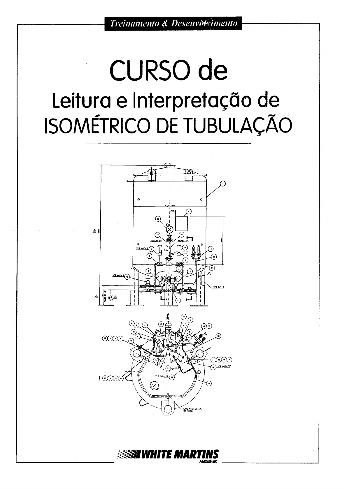 <p>Treinamento & Desenvolvimento CURSO de Leitura e Interpretação de ISOMÉTRICO DE TUBULAÇÃO TOMADA o , . 22 20 WHITE MARTINS PRAXAIR</p><p>Treinamento & Desenvolvimento White Martins Gases Industriais S/A ELABORAÇÃO Treinamento & Desenvolvimento Roberto Luiz de Sacramento COORDENAÇÃO Treinamento & Desenvolvimento Rosangela Magallon APOIO TÉCNICO Engenharia de Cold Box Jeremias Espírito Santo Silva Marco Aurélio Nicolau Jr MATERIAL DE APOIO Apostila de Desenho de Tubulações Industriais SENAI Norma ABNT - NBR 8196 / NBR 10067 Revisão A-JULHO/99 MARTINS 01</p><p>Treinamento & Desenvolvimento CONTEÚDO PROGRAMÁTICO 1 - INTRODUÇÃO 2 - PROJEÇÃO ORTOGONAL 3 - SIMBOLOGIA 4 - CÁLCULO TÉCNICO 5 - REPRESENTAÇÃO GRÁFICA REVISÃO A - JULHO / 1999 WHITE MARTINS PRAXAIR INC 02</p><p>Treinamento & Desenvolvimento 1 - INTRODUÇÃO De acordo com a NBR 10647 - ABNT, Desenho Técnico se define quanto ao aspecto geométrico, quanto ao grau de elaboração, quanto ao grau de pormenorização, quanto ao material empregado, quanto à técnica de execução e quanto ao modo de obtenção. Para efeito deste curso são considerados: 1.1 - Aspecto Geométrico 1.1.1 - Desenho projetivo a) vistas ortogonais ou projeção ortogonal b) perspectivas 1.1.2 - Desenho não projetivo a) diagramas; b) esquemas; c) ábacos ou cronogramas; d) fluxogramas; e) organogramas; f) gráficos. 1.2 - Grau de elaboração a) Esboço b) Desenho preliminar c) Croqui d) Desenho definitivo 1.3 - Grau de pormenorização a) Desenho de componente b) Desenho de conjunto c) Detalhe Quanto ao aspecto geométrico, no caso de estudaremos: a) Projeção ortogonal ou vistas ortogonais Figuras resultantes de projeções ortogonais do objeto, sobre planos convenientemente escolhidos, de modo a representar, com exatidão, a forma do mesmo com seus detalhes. planta, elevação, vista lateral, cortes e detalhes. b) Perspectiva Em tubulação utiliza-se a perspectiva isométrica, com finalidade de permitir uma percepção mais fácil da forma do objeto. c) Fluxogramas Representação de uma sequência de operações. WHITE MARTINS PRAXAIR 03</p><p>Treinamento & Desenvolvimento 2 - PROJEÇÃO ORTOGRÁFICA A projeção ortográfica é definida como a representação geométrica de uma figura ou de sólido de maneira ortogonal, ouseja, que forma angulos retos. A projeção pode ser apresentada em planos variados. No caso de desenho de tubulação, os termos mais usuais de acordo com esses planos são: Plantas - Elevação - Lateral (vista superior) (vista frontal) (vista lateral) ou vista de topo 2.1 - Método de projeção ortográfica Considerando-se os planos de projeção horizontal e vertical prolongadas além de sua interseção, quatro ângulos diedros serão formados, os quais se denominam, pela ordem P, 2°, e diedros, numerados conforme ilustrado na figura abaixo. Teoricamente, objeto pode ser colocado em qualquer um dos quatros diedros e projetado sobre os planos que são então rebatidos em torno de sua interseção. Na prática o e 4 diedros não são utilizados, restando-nos pois 1° e 2.1.1 - Condições específicas Os nomes das vistas indicadas através da projeção ortogonal são os seguintes: a) vista frontal (A) ; b) vista superior (B) ; c) vista lateral esquerda ; d) vista lateral direita (D) ; e) vista inferior (E) ; f) vista posterior (F) B F D C A E WHITE MARTINS 04</p><p>Treinamento & Desenvolvimento 2.1.2 - 1° diedro Símbolo do método: Posição relativa das vistas no 1° diedro E Z C A Y X 2 B 4 Vistas ortogonais : E D A C F B WHITE MARTINS PRAXAIR INC 05</p><p>& Desenvolvimento 2.1.3 - 3° diedro Símbolo do método: Posição relativa das vistas no 3° diedro Z 2 B C A Vistas B F C A D E WHITE MARTINS PRAXAIR 06</p><p>Treinamentoi& Desenvolvimento 2.1.4 - Projeção ortogonal no caso de tubulação S P LD F LE 2.1.4.1 - Em 1° diedro I LD F LE P S f Lateral Elevação Planta WHITE MARTINS 07</p><p>Treinamento & Desenvolvimento 2.1.4.2 - Em 3° diedro S P F LD I f Planta Lateral 2.1.5 - Escolha das vistas a) vista principal (ou frontal) A vista mais importante de uma peça deve ser utilizada como vista frontal ou principal. Geralmente esta vista representa a peça na sua posição de utilização. B) outras vistas Quando outras vistas forem necessárias, inclusive cortes e\ou seções, elas devem ser selecionados conforme os seguintes critérios: - usar menor número de - evitar repetição de detalhes; - evitar linhas tracejadas desnecessárias. 2.1.6 - Determinação do número de vistas Devem ser executadas vistas quantas forem necessárias à caracterização da forma da peça, sendo preferíveis vistas, cortes, detalhes ou seções ao emprego de grande quantidade de linhas tracejadas. WHITE MARTINS PRAXAIR 08</p><p>Tremamento & Desenvolvimento 3 - SIMBOLOGIA Os símbolos são utilizados para desenvolvimento de Desenhos de Tubulações, a fim de oferecer uma representação simplificada de cada objeto. 3.1 - Tipos de linhas convencoinais: a) Principais b) Secundárias c) Linha futura ou existente d) Ramais de aquecimento a vapor I e) Capilar termométrico * f) Fio elétrico p\ instrumento g) Ar de instrumento # # h) Tubulações superpostas Superior Superior i) Tubulação interrompida (facilita detalhamento de um plano inferior) WHITE MARTINS PRAXAIR 09</p><p>Treinamento & Desenvolvimento j) Mudança de elevação TRECHO VERTICAL - TRECHO TRECHO MAIS ELEVADO MENOS ELEVADO TRECHO INCLINADO TRECHO HORIZ. TRECHO HORIZ MAIS ELEVADO MENOS ELEVADO k) Derivações Seta de fluxo PARA BAIXO PARA CIMA 3.2 - Tipos de ligação ou extremidades a) sodada b) roscada e solda de encaixe c) flageada d) ponta e bolsa e) ligação de compressão f) engate rápido Nota: Os meios de ligação podem variar de acordo com diâmetro da tubulação, fluido, a pressão, a temperatura ou até mesmo o ambiente onde está instalado. WHITE MARTINS PRAXAIR 10</p><p>Treinamento & Desenvolvimento 3.3 - Conexões e válvulas em pr