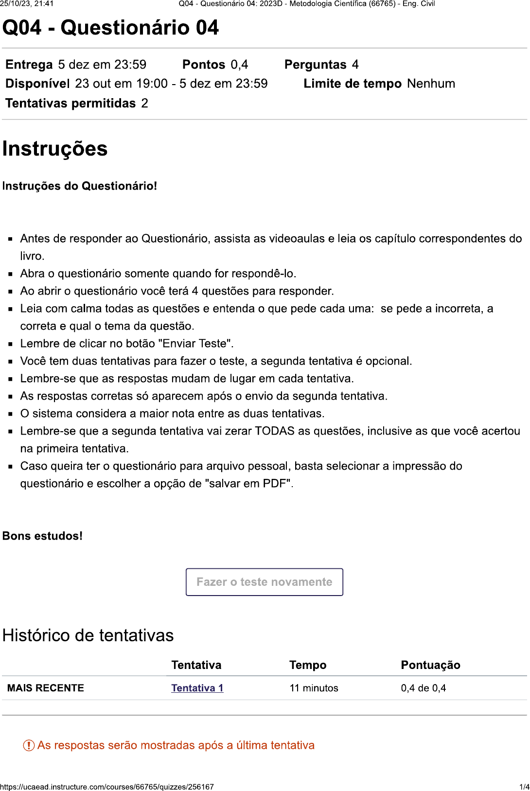 <p>25/10/23, 21:41 Q04 - Questionário 04: 2023D - Metodologia Científica (66765) - Eng. Civil Q04 - Questionário 04 Entrega 5 dez em 23:59 Pontos 0,4 Perguntas 4 Disponível 23 out em 19:00 5 dez em 23:59 Limite de tempo Nenhum Tentativas permitidas 2 Instruções Instruções do Questionário! Antes de responder ao Questionário, assista as videoaulas e leia os capítulo correspondentes do livro. Abra o questionário somente quando for respondê-lo. Ao abrir o questionário você terá 4 questões para responder. Leia com calma todas as questões e entenda o que pede cada uma: se pede a incorreta, a correta e qual o tema da questão. Lembre de clicar no botão "Enviar Você tem duas tentativas para fazer o teste, a segunda tentativa é opcional. Lembre-se que as respostas mudam de lugar em cada tentativa. As respostas corretas só aparecem após o envio da segunda tentativa. sistema considera a maior nota entre as duas tentativas. Lembre-se que a segunda tentativa vai zerar TODAS as questões, inclusive as que você acertou na primeira tentativa. Caso queira ter o questionário para arquivo pessoal, basta selecionar a impressão do questionário e escolher a opção de "salvar em PDF". Bons estudos! Fazer teste novamente Histórico de tentativas Tentativa Tempo Pontuação MAIS RECENTE Tentativa 1 11 minutos 0,4 de 0,4 ! As respostas serão mostradas após a última tentativa https://ucaead.instructure.com/courses/66765/quizzes/256167 1/4</p><p>25/10/23, 21:41 Q04 Questionário 04: 2023D Metodologia Científica (66765) Eng. Civil Pontuação desta tentativa: 0,4 de 0,4 Enviado 25 out em 21:41 Esta tentativa levou 11 minutos. Pergunta 1 0,1/0,1 pts Investigar ou pesquisar significa buscar ou procurar respostas para alguma coisa, o caminho para se fazer avançar, o conhecimento a partir de um trabalho planejado, metódico, sistemático e de análise rigorosa.O conhecimento científico resulta de uma atividade intencional que, partindo de um problema referente a um dado tema, vincula fatos, ideias e conhecimentos anteriormente adquiridos. Algumas de suas características principais são: Procedimento teórico e reflexivo Procedimento de coleta e análise dos dados Procedimento metódico e racional Procedimento teórico e conceitual Procedimento verificável e crítico Pergunta 2 0,1/0,1 pts Lembremos que a pesquisa é um procedimento intelectual para estabelecer, mesmo que momentaneamente, novas verdades sobre um fato (objeto, problema). Com base em métodos adequados e técnicas apropriadas, no resultado de uma pesquisa não se deve atribuir verdade absoluta, pois as descobertas são sempre renovadas, e toda análise sobre um fato apresenta várias implicações. Dessa maneira. podemos afirmar que a pesquisa é: O conjunto de teorias https://ucaead.instructure.com/courses/66765/quizzes/256167 2/4</p><p>25/10/23, 21:41 Q04 Questionário 04: 2023D Metodologia Científica (66765) Eng. Civil A reprodução do conhecimento científico Conjunto de procedimentos de análise desenvolvimento do senso comum Resultado das dúvidas e reflexões Pergunta 3 0,1/0,1 pts Os objetivos de um projeto são parte essencial Ao traçarmos os propósitos de um estudo, traçamos e definimos seus objetivos. É claro que para traçarmos os objetivos de forma bem definida, precisamos também levar em consideração a questão do tempo, ou seja, os prazos, pois o projeto precisa ser exequível. Sabemos que existem os objetivos gerais e os objetivos: Reflexivos Analíticos Apenas os gerais Averiguados Específicos Pergunta 4 0,1/0,1 pts A justificativa é o momento de realizar uma introdução explicativa a respeito da escolha do tema, bem como a importância ou relevância do tema escolhido, explicitando os motivos que o levaram a pesquisar tal temática, definindo também a problemática encontrada e circunscrevendo seus limites. Neste momento, expõe-se as hipóteses propostas, ou seja, uma solução provisória que se propõe para o https://ucaead.instructure.com/courses/66765/quizzes/256167 3/4</p><p>25/10/23, 21:41 Q04 - Questionário 04: 2023D - Metodologia Científica (66765) - Eng. Civil problema formulado, podendo ser ela positiva ou negativa. O objetivo da justificativa é: Demonstrar a função social da pesquisa científica Demonstrar o conjunto de teorias Demonstrar a reprodução do conhecimento científico Demonstrar como é desenvolvimento do senso comum Demonstrar o resultado das dúvidas e reflexões Pontuação do teste: 0,4 de 0,4 4/4</p>