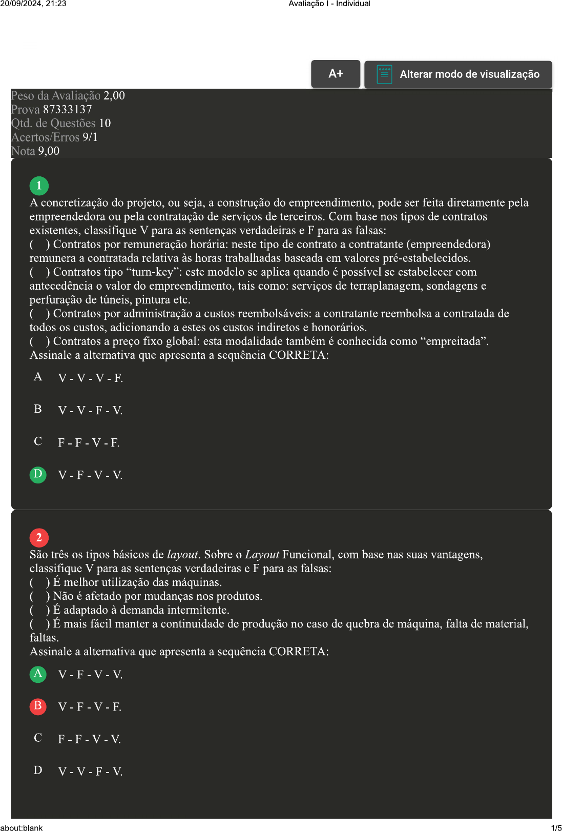 <p>20/09/2024. 21:23 Avaliação Individual A+ Alterar modo de visualização Peso da Avaliação 2,00 Prova 87333137 Qtd. de Questões 10 Acertos/Erros 9/1 Nota 9,00 1 A concretização do projeto, ou seja, a construção do empreendimento, pode ser feita diretamente pela empreendedora ou pela contratação de serviços de terceiros. Com base nos tipos de contratos existentes, classifique V para as sentenças verdadeiras e F para as falsas: ( ) Contratos por remuneração horária: neste tipo de contrato a contratante (empreendedora) remunera a contratada relativa às horas trabalhadas baseada em valores pré-estabelecidos. ( ) Contratos tipo este modelo se aplica quando é possível se estabelecer com antecedência valor do empreendimento, tais como: serviços de terraplanagem, sondagens e perfuração de túneis, pintura etc. ( ) Contratos por administração a custos reembolsáveis: a contratante reembolsa a contratada de todos os custos, adicionando a estes os custos indiretos e honorários. ( ) Contratos a preço fixo global: esta modalidade também é conhecida como "empreitada". Assinale a alternativa que apresenta a sequência CORRETA: A B V-V-F-V C D V-F-V-V 2 São três os tipos básicos de layout. Sobre Layout Funcional, com base nas suas vantagens, classifique V para as sentenças verdadeiras e F para as falsas: ( ) É melhor utilização das máquinas. ( ) Não é afetado por mudanças nos produtos. ( ) É adaptado à demanda intermitente. ( ) É mais fácil manter a continuidade de produção no caso de quebra de máquina, falta de material, Assinale a alternativa que apresenta a sequência CORRETA: A B C F-F-V-V D V-V-F-V about:blank 1/5</p><p>20/09/2024, 21:23 Avaliação Individual Revisar Conteúdo do Livro 3 A construção de um empreendimento é determinante quando se fala sobre instalações industriais. Uma construção pode ser conduzida de forma terceirizada, e que para tanto, diferentes modalidades de contrato regulam esse tipo de operação. Destaca-se aqui contrato a preço fixo global. Considerando as características dessa modalidade de contrato, classifique V para as sentenças verdadeiras e F para as falsas: ( ) Esse tipo de contrato permite controle sobre planejamento e desembolso de pagamentos, pois pagamento pode estar atrelado ao cumprimento de prazos e vinculado a este por parcelas fixas. ( ) Essa modalidade de contrato promove aumento dos riscos e responsabilidades para a contratada no que diz respeito ao acerto de um custo mais elevado do que previsto para a execução da obra. ( ) Trata-se de um tipo de contrato onde a contratante remunera a contratada considerando as horas trabalhadas, baseando-se em valores previamente estabelecidos. ( ) Nessa modalidade de contrato, a contratante reembolsa a contratada de todos os custos, adicionando ainda os custos adicionais que correspondem a um valor fixo ou percentual dos custos diretos. Assinale a alternativa que apresenta a sequência CORRETA: A V-F-F-V B C V-V-F-F D 4 Há elementos que devemos levar em consideração para Planejamento e Projeto de Layout de Fábricas. Com base neles, classifique V para as sentenças verdadeiras e F para as falsas: ( ) Fluxo de materiais e de pessoas. ( ) Estocagem de materiais, peças em processamentos e produtos finalizados. ( ) Acesso, movimentação entre fornecedores, consumidores e transportadores. ( ) Abastecimento de insumos. Assinale a alternativa que apresenta a sequência CORRETA: A B C F-V-V-F D about:blank 2/5</p><p>20/09/2024, 21:23 Avaliação Individual 5 A concretização do projeto, isto é, a construção do empreendimento, pode ser feita diretamente pela empreendedora ou pela contratação de serviços de terceiros. A escolha da empresa construtora (terceira) deve relevar questões de qualificação técnica e de idoneidade comercial. A parceria estabelecida deve ser regida por um contrato de serviços e responsabilidades. Com base nos contratos, assinale a alternativa CORRETA: Contratos por administração a custos reembolsáveis: neste tipo de contrato a contratante A (empreendedora) remunera a contratada relativa às horas trabalhadas baseada em valores pré- estabelecidos. Aplicam-se neste tipo de contrato as consultorias, fiscalizações etc., em que tempo a ser despendido pode ser controlado e combinado com antecedência. Contratos a preço unitário: são formas que possibilitam um arranjo entre os contratos a preços B fixos e a preço variável. São formas que estabelecem um preço máximo fixo e a preço médio com participação da contratada nos desvios observados do valor estipulado inicialmente. Contratos por remuneração horária: a contratante reembolsa a contratada de todos os custos, C adicionando a estes os custos indiretos e honorários. Os custos adicionais podem corresponder a um valor fixo ou a um percentual dos custos diretos. Contratos tipo "turn-key": esta modalidade contratual é também conhecida como "empreitada É um tipo de contratação em que a empreendedora contrata e delega toda a responsabilidade da obra, isto é: a elaboração do projeto, processo de compras, a construção e montagem das instalações e a pré-operação da indústria. É possível, ainda, que a inclusão do financiamento de toda a obra pela contratada. 6 O layout de produção, que também pode ser chamado de arranjo físico, é a representação gráfica do chão de fábrica. Com base na importância de planejar layout de uma fábrica, assinale a alternativa CORRETA: A Conectar a cadeia produtiva. B Integralizar processo. C Agilizar processo produtivo. D Melhorar processo produtivo para colaborador... 7 A escolha do processo de produção a ser utilizado depende de um grande número de diferentes fatores. A especificação final do processo de produção passa pela criação de alguns documentos. Com base no exposto, classifique V para as sentenças verdadeiras e F para as falsas: ( ) Gráficos de Operações de Processo que listam todas as op