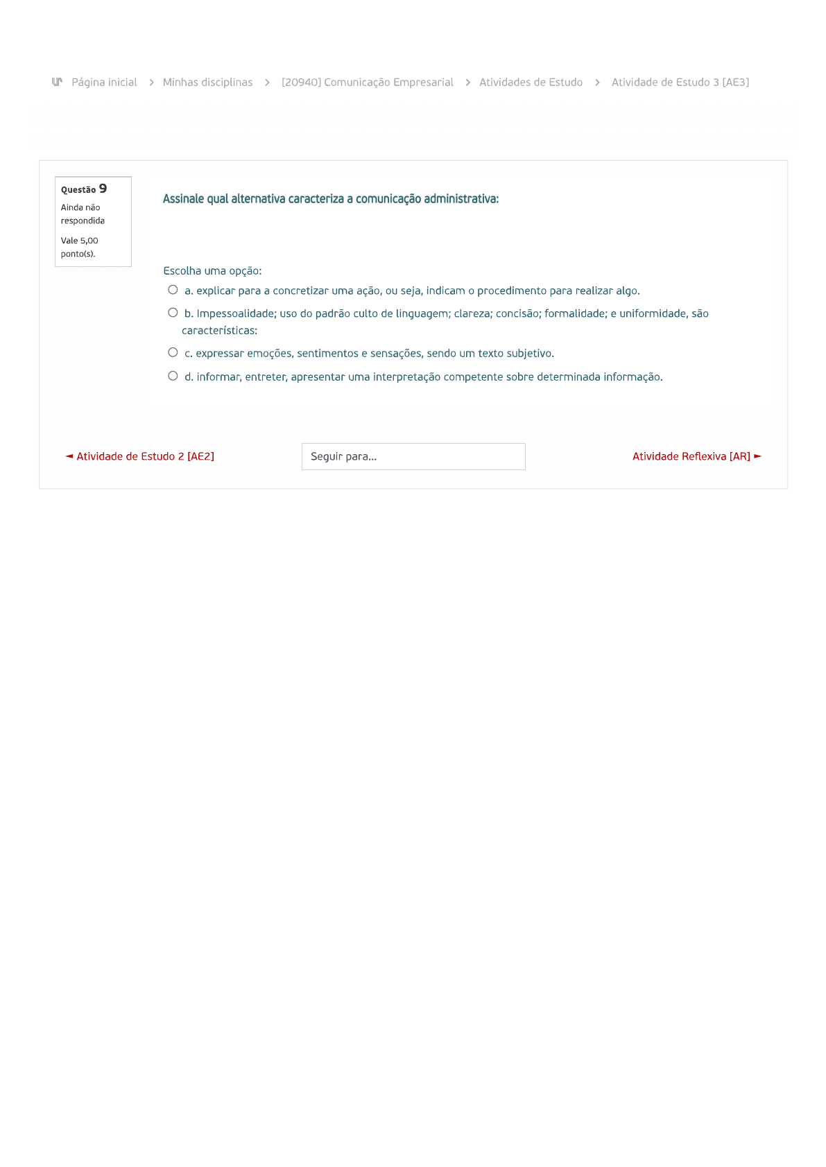 <p>Página inicial > Minhas disciplinas > [20940] Comunicação Empresarial > Atividades de Estudo > Atividade de Estudo 3 [AE3] Questão 9 Assinale qual alternativa caracteriza a comunicação administrativa: Ainda não respondida Vale 5,00 ponto(s). Escolha uma opção: a. explicar para a concretizar uma ação, ou seja, indicam o procedimento para realizar algo. b. Impessoalidade; uso do padrão culto de linguagem; clareza; concisão; formalidade; e uniformidade, são características: C. expressar emoções, sentimentos e sensações, sendo um texto subjetivo. d. informar, entreter, apresentar uma interpretação competente sobre determinada informação. Atividade de Estudo 2 [AE2] Seguir para... Atividade Reflexiva [AR]</p>