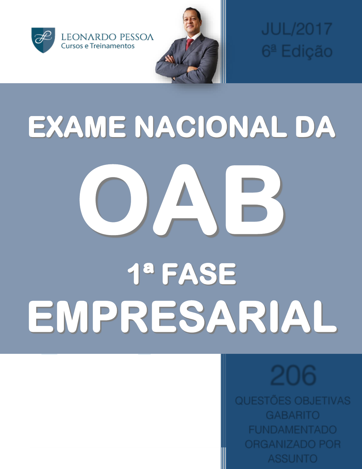 <p>JUL/2017</p><p>6ª Edição</p><p>206</p><p>QUESTÕES OBJETIVAS</p><p>GABARITO</p><p>FUNDAMENTADO</p><p>ORGANIZADO POR</p><p>ASSUNTO</p><p>http://www.leonardopessoa.pro.br</p><p>Elaborado por Leonardo Pessoa</p><p>www.leonardopessoa.pro.br</p><p>lpessoa@leonardopessoa.pro.br</p><p>1</p><p>Leonardo Pessoa1</p><p>QUESTÔES OBJETIVAS DE DIREITO EMPRESARIAL (EXAME DA OAB)</p><p>Nota de Direitos Autorais</p><p>Este livro pode ser copiado e compartilhado por meios eletrônicos; pode ser citado em outras</p><p>obras, aulas, sites, apresentações, blogues, redes sociais etc, desde que mencionadas a fonte e a</p><p>autoria. Pode ser reproduzido em meio físico, no todo ou em parte, desde que para fins não comerciais.</p><p>Você, portanto, está livre para ler, compartilhar, copiar e principalmente pensar.</p><p>Nota do Autor</p><p>Esta obra destina-se a todos aqueles que buscam entender o Direito Empresarial Brasileiro de</p><p>forma objetiva. Todas as questões apresentadas na obra foram extraídas dos exames da OAB.</p><p>Os gabaritos foram idealizados e organizados pelo autor, com o intuito de possibilitar que o</p><p>leitor tenha opções para estabelecer sua estratégia de estudo.</p><p>Leciono Direito Empresarial desde 2001, em diversas instituições de ensino. Durante todos</p><p>esses anos na docência, observei que o estudante precisa exercitar os conceitos apreendidos para</p><p>potencializar a sua aprendizagem.</p><p>Desse modo, apresento essa obra com o propósito de contribuir com todos aqueles que buscam</p><p>aprender o Direito Empresarial Brasileiro.</p><p>Espero que essa obra seja de grande valia para você.</p><p>Abraços e bons estudos!</p><p>Qualquer dúvida ou sugestão pode ser enviada diretamente para mim:</p><p>Facebook.................................... https://www.facebook.com/profleonardopessoa/</p><p>LinkedIn...................................... https://br.linkedin.com/in/leonardoribeiropessoa</p><p>GooglePlus................................. https://www.google.com/+LeonardoPessoa</p><p>Twitter.......................................... http://www.twitter.com/LeonardoPessoa_</p><p>Instagram..................................... http://instagram.com/pessoa_leonardo</p><p>Canal no Youtube....................... https://www.youtube.com/channel/UC8QMHBn3WQK9OMK_kbPVqvw</p><p>Snapchat...................................... https://www.snapchat.com/add/lpessoa75</p><p>Skype........................................... lrpessoa</p><p>Grupo de Estudo no Facebook. https://www.facebook.com/groups/242552396155181/</p><p>1Advogado e Professor de Direito Empresarial e Tributário</p><p>http://www.leonardopessoa.pro.br/</p><p>mailto:lpessoa@leonardopessoa.pro.br</p><p>http://www.leonardopessoa.adv.br/</p><p>http://lattes.cnpq.br/0265145203278094</p><p>Elaborado por Leonardo Pessoa</p><p>www.leonardopessoa.pro.br</p><p>lpessoa@leonardopessoa.pro.br</p><p>2</p><p>Sumário</p><p>1. TÍTULOS DE CRÉDITO .................................................................................................................................................. 3</p><p>1.1. Em Geral ..................................................................................................................................................................... 3</p><p>Gabarito parte geral de títulos de crédito ................................................................................................................................ 5</p><p>1.2. Letra de Câmbio .......................................................................................................................................................... 6</p><p>Gabarito – Letra de Câmbio .................................................................................................................................................... 8</p><p>1.3. Nota Promissória .............................................................................................................................................................. 8</p><p>Gabarito – Nota Promissória ................................................................................................................................................. 10</p><p>1.4. Duplicata ........................................................................................................................................................................ 10</p><p>Gabarito – Duplicata ............................................................................................................................................................. 12</p><p>1.5. Cheque ........................................................................................................................................................................... 12</p><p>Gabarito – Cheque ................................................................................................................................................................ 14</p><p>1.6. Conhecimento de depósito e Warrant ........................................................................................................................... 14</p><p>Gabarito – Conhecimento de depósito e Warrant................................................................................................................. 14</p><p>2. SOCIETÁRIO GERAL ................................................................................................................................................... 15</p><p>Gabarito Societário Geral ...................................................................................................................................................... 22</p><p>3. EMPRESÁRIO .............................................................................................................................................................. 23</p><p>Gabarito – Empresário .................................................................................