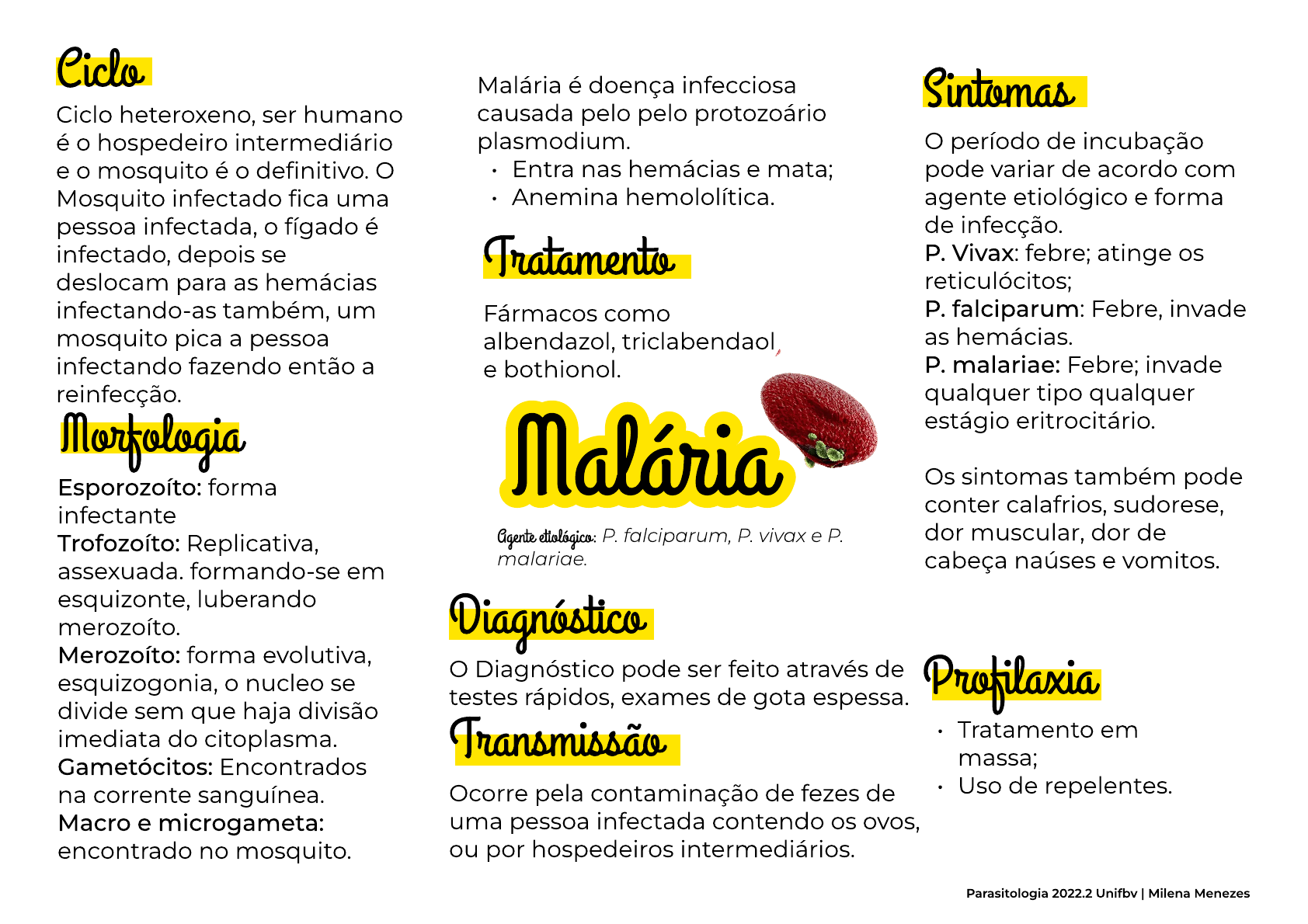 <p>Ciclo Malária é doença infecciosa Sintomas Ciclo heteroxeno, ser humano causada pelo pelo protozoário é hospedeiro intermediário plasmodium. período de incubação e O mosquito é definitivo. O Entra nas hemácias e mata; pode variar de acordo com Mosquito infectado fica uma Anemina hemololítica. agente etiológico e forma pessoa infectada, fígado é de infecção. infectado, depois se Tratamento P. Vivax: febre; atinge os deslocam para as hemácias reticulócitos; infectando-as também, um Fármacos como P. falciparum: Febre, invade mosquito pica a pessoa albendazol, triclabendaol, as hemácias. infectando fazendo então a e bothionol. P. malariae: Febre; invade reinfecção. qualquer tipo qualquer Morfologia Malária estágio eritrocitário. Esporozoíto: forma Os sintomas também pode infectante conter calafrios, sudorese, Trofozoíto: Replicativa, Agente P. falciparum, P. vivax e P. dor muscular, dor de malariae. assexuada. formando-se em cabeça naúses e vomitos. esquizonte, luberando merozoíto. Merozoíto: forma evolutiva, Diagnóstico pode ser feito através de esquizogonia, nucleo se testes rápidos, exames de gota espessa. divide sem que haja divisão imediata do citoplasma. Transmissão Tratamento em Gametócitos: Encontrados massa; na corrente sanguínea. Ocorre pela contaminação de fezes de Uso de repelentes. Macro e microgameta: uma pessoa infectada contendo os ovos, encontrado no mosquito. ou por hospedeiros intermediários. Parasitologia 2022.2 Unifby Milena Menezes</p>