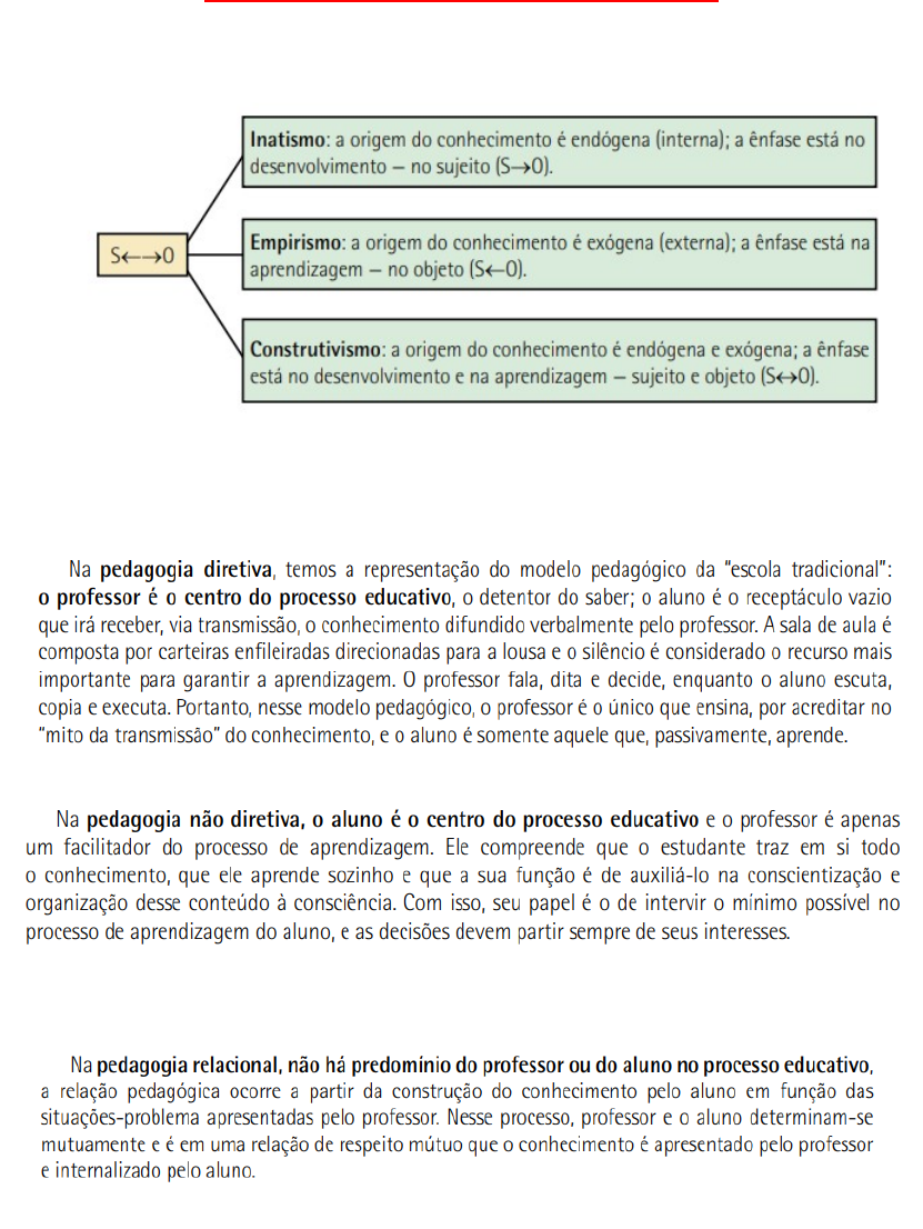 <p>RESUMO PSICOLOGIA CONSTRUTIVISTA</p><p>Modelos pedagógicos</p><p>• Inatismo: pedagogia não diretiva ou pedagogia centrada no aluno: o aluno é o centro de todo o processo pedagógico (P←A).</p><p>• Empirismo: pedagogia diretiva ou pedagogia centrada no professor: o professor é o centro de todo o processo pedagógico (P→A).</p><p>• Construtivismo: pedagogia relacional ou pedagogia centrada na relação: não existe uma relação polarizada; tanto o aluno quanto o professor têm importância durante o processo pedagógico, estabelecem uma relação de troca (P↔A).</p><p>O PROCESSO DE EQUILIBRAÇÃO MAJORANTE</p><p>• Epistemologia genética: área de pesquisa elaborada por Piaget que estuda o desenvolvimento do pensamento da criança até a chegada ao raciocínio adulto (lógico-científico). Piaget pretendeu compreender como se desenvolvem não só os conhecimentos, como também a capacidade de conhecer. A perspectiva genética enfatiza sua visão processual, atento às origens e à evolução da inteligência humana, o que difere de uma ênfase no aspecto genético no sentido de biologicamente herdado, hereditário.</p><p>• Esquema: unidade estrutural básica de pensamento ou ação que, enquanto estrutura, pode mudar e adaptar-se. De acordo com Piaget, a criança nasce com um equipamento biológico hereditário e, a partir da interação com o meio, irá construir estruturas mentais – esquemas – expressos como ações motoras e estratégias mentais utilizadas para solucionar problemas durante o funcionamento cognitivo.</p><p>• Assimilação: tentativa do sujeito de solucionar uma determinada situação, utilizando uma estrutura mental já formada, ou seja, a nova situação é assimilada a um sistema já pronto.</p><p>Exemplo: no momento em que a criança construiu o conhecimento de “subir escadas” irá utilizar esse conhecimento em todas as situações (escada de sua casa, escada da escola, escada da casa da tia etc.).</p><p>• Acomodação: tentativa do sujeito de solucionar uma determinada situação, modificando as estruturas antigas e construindo novas maneiras de agir para dominar uma situação nova em que os conhecimentos antigos são insuficientes para compreendê-las</p><p>• Adaptação: o principal papel da inteligência humana é favorecer a adaptação do organismo (no caso, dos seres humanos) ao meio (seja físico, seja social). Essa adaptação está estreitamente ligada à articulação dos dois mecanismos descritos anteriormente – assimilação e acomodação.</p><p>• Conflito cognitivo: na busca vital por conhecimento, o sujeito tem necessidade de trocas constantes de informações com o meio, o qual lhe propõe inevitavelmente novidades. Essas situações, consideradas por Piaget como desafios ou situações-problema, provocam curiosidade e interesse, colocando o sujeito em estado de desequilíbrio e desadaptação, ou, dito de outro modo, gerando um conflito cognitivo: “O que é isso? Deixa-me ver? Explica-me o que é isso?”.</p><p>OS ESTÁDIOS DO DESENVOLVIMENTO COGNITIVO SEGUNDO PIAGET</p><p>Sendo assim, em uma perspectiva piagetiana, a construção do conhecimento ocorre em estádios de desenvolvimento e a sequência desses estádios é sempre a mesma, mas a idade dos sujeitos pode variar de acordo com o meio ou a cultura na qual está inserido. São os seguintes estádios ou fases de transição pelos quais o sujeito irá percorrer durante seu desenvolvimento:</p><p>Estádio sensório-motor (0 a 2 anos):</p><p>O bebê nasce com atos e ações reflexas, inatas e automáticas (sucção, preensão) e é, no início, um sujeito passivo que constrói esquemas simples que funcionam isoladamente de maneira circular e repetitiva (pegar, olhar, bater, sugar).</p><p>Estádio pré-operatório (2 a 6 anos):</p><p>No estádio pré-operacional, a criança evolui de um funcionamento basicamente sensório-motor, expresso por meio de ações, para um modo conceitual e representacional. Assim, esse período é marcado pela passagem da inteligência sensório-motora ou prática para a inteligência representativa, a criança se torna apta para representar objetos e eventos</p><p>Estádio operatório concreto (7 a 11 anos):</p><p>A característica principal desse estádio é que o pensamento deixa de ser pré-lógico e passa a ser operatório, ou seja, a criança tem a capacidade cognitiva de coordenar diferentes pontos de vista de maneira lógica, expressando ações cognitivas mais elaboradas. No entanto, embora tenha essa possibilidade de maior expressão do pensamento, para poder utilizá-lo de maneira lógica, é necessário o manuseio e a observação de objetos concretos. Isso porque lidar com ideias puramente abstratas e hipotéticas será uma aquisição do estádio seguinte, das operações formais.</p><p>Estádio operatório formal (12 a 15 anos):</p><p>No estádio anterior, tanto os esquemas conceituais como as operações mentais são dependentes de objetos e situações que existem concretamente na realidade. Na adolescência, essa limitação deixa de existir e o sujeito é capaz de formar esquemas conceituais abstratos (amor, justiça, saudade) e realizar operações mentais de acordo com uma lógica formal mais sofisticada em termos de conteúdo e flexibilidade de raciocínio</p><p>O DESENHO EM UMA PERSPECTIVA PSICOGENÉTICA</p><p>De acordo com Piaget, ao final do estádio Sensório-Motor (por volta dos 2 anos), surge na criança</p><p>uma capacidade cognitiva de representação – um significado por meio de um significante –, e o meio</p><p>que utiliza para isso pode ser a linguagem, o jogo simbólico, a imitação, a imagem mental e o desenho.</p><p>Primeira fase: realismo fortuito:</p><p>Criança limita-se a fazer traços aleatórios no papel sem qualquer objetivo ou significação, manipula e explora os materiais, e no grafismo é o olho que segue a mão e não as marcas impressas no papel</p><p>Segunda fase: realismo