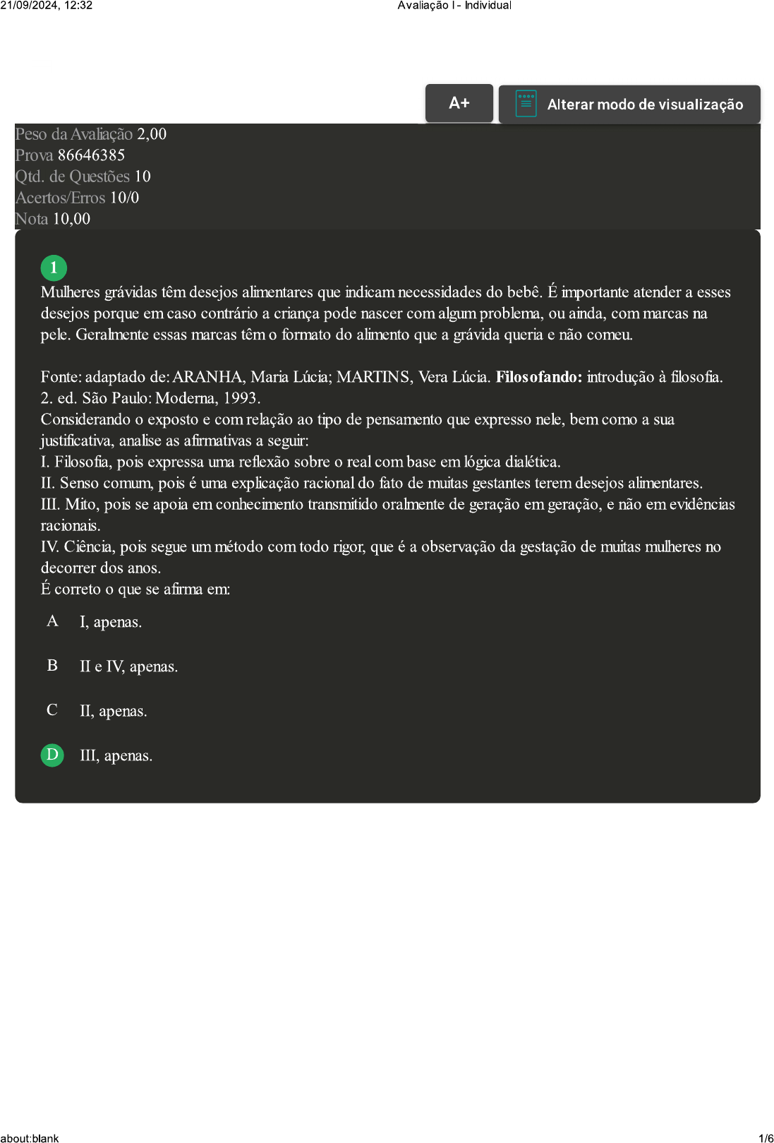 <p>21/09/2024, 12:32 Avaliação Individual A+ Alterar modo de visualização Peso da Avaliação 2,00 Prova 86646385 Qtd. de Questões 10 Acertos/Erros 10/0 Nota 10,00 1 Mulheres grávidas têm desejos alimentares que indicam necessidades do bebê. É importante atender a esses desejos porque em caso contrário a criança pode nascer com algum problema, ou ainda, com marcas na pele. Geralmente essas marcas têm formato do alimento que a grávida queria e não Fonte: adaptado de: ARANHA, Maria Lúcia; MARTINS, Vera Lúcia. Filosofando: introdução à filosofia. 2. ed. São Paulo: Moderna, 1993. Considerando exposto e com relação ao tipo de pensamento que expresso nele, bem como a sua justificativa, analise as afirmativas a seguir: I. Filosofia, pois expressa uma reflexão sobre real com base em lógica dialética. II. Senso comum, pois é uma explicação racional do fato de muitas gestantes terem desejos alimentares. III. Mito, pois se apoia em conhecimento transmitido oralmente de geração em geração, e não em evidências racionais. IV. Ciência, pois segue um método com todo rigor, que é a observação da gestação de muitas mulheres no decorrer dos anos. É correto que se afirma em: A I, apenas. B II e IV, apenas. C II, apenas. D III, apenas. about:blank 1/6</p><p>21/09/2024, 12:32 Avaliação - Individual 2 A alta performance cognitiva é importante porque ajuda a aumentar nível de produtividade em ambientes de trabalho, atingimento de metas e desenvolvimento das potencialidades das pessoas à volta. Além disso, torna-se mais fácil superar obstáculos causados pelo estresse e pressão, pois permite que os profissionais usem seus recursos para solucionar problemas e tomar decisões objetivas. Fonte: adaptado de: https://bit.ly/3Lw8PQk. Acesso em: 20 fev. 2023. Vale destacar que as pessoas não nascem com alta performance cognitiva, mas desenvolvem por meio da prática constante do aprendizado. É aprender a aprender que leva à aprendizagem genuína. Nesse contexto, observe a charge a seguir: Fonte: Acesso em: 20 fev. 2023. Com relação à justificativa da necessidade do desenvolvimento da alta performance cognitiva, analise as afirmativas a seguir: I. O aprender auxilia na capacidade de produzir novos conhecimentos científicos. II. O aprender a aprender é processo que envolve desenvolver e usar estratégias para tornar a aprendizagem mais eficiente. III. O aprender a aprender é essencial para sucesso em qualquer área, e é algo que pode ser desenvolvido gradualmente ao longo do tempo. IV. A pessoa que aprende continuamente construi tantas conexões neurais que a capacidade de compreensão é bem maior do que a de pessoas que ainda não desenvolveram este hábito. É correto que se afirma em: A III e IV, apenas. B IV. C II e IV, apenas. D I, II e III, apenas. about:blank 2/6</p><p>21/09/2024, 12:32 Avaliação Individual 3 A arte é uma das formas de relacionamento do ser humano com mundo, mas ela tem características que a diferem das demais formas de conhecimento. Fonte: adaptado de: ARANHA, M. L.; MARTINS, V. L. Filosofando: introdução à filosofia. 2. ed. São Paulo: Moderna, 1993. Com base nas características da arte, assinale a alternativa correta: É uma forma de relação do homem com a realidade, questionando-a, interpretando-a e desafiando-a, que se situa no campo atingindo os sentidos e não necessariamente a lógica ou intelecto. É uma postura ante mundo, buscando por meio da Ela busca além das B aparências dos assumindo uma atitude de dúvida, de questionamento ao status quo. É uma forma de organização da realidade a partir da experiência racional, ou seja, é a reunião de C experiências, narrativas, sentimentos, emoções, que trazem uma explicação sobre real, mas que não se apoiam em evidências lógicas. É uma forma espontânea de lidar com mundo, aprendida no dia a dia, permeada pelo medo ante D desconhecido e desejo de atrair bem por meio da expressão artística. 4 É na sala de aula que se expande significativamente potencial cerebral humano, uma vez que é em instituições educacionais comprometidas e respeitáveis que conseguimos aproveitar a impressionante plasticidade cerebral para incutir uma vasta gama de conhecimentos e habilidades. Levando em consideração a comunicação neuronal e processo de aprendizagem, assinale a alternativa correta: Aprender significa enfraquecer as correntes cerebrais existentes para abrir espaço para novas A informações. B Aprender algo novo resulta em correntes cerebrais imediatamente fortes e extensas. C As sinapses são processos que ocorrem entre os neurônios, não envolvendo mensageiros químicos. A "faísca" da sinapse é resultado do movimento contínuo de sinais entre neurônios, formando nosso D pensamento. 5 Para impulsionar a aprendizagem, formar entendimento, adquirir conhecimentos e promover a reflexão, é essencial que você possa contemplar as respostas potenciais, integrá-las ao seu conhecimento prévio e formular perguntas cada vez mais refinadas e úteis para processo de aprendizado, apropriando-se de novos conhecimentos. Sobre processo de aprendizagem e neurociência, assinale a alternativa correta que apresenta a maneira que a neurociência ajuda a entender processo de O processo de aprendizagem, conforme entendido pela neurociência, sugere que os neurônios não A possuem qualquer conexão durante a recuperação de informações. about:blank 3/6</p><p>21/09/2024, 12:32 Avaliação Individual A neurociência sugere que processo de aprendizagem é simples e não requer muita interação entre B neurônios. C Segundo a neurociência, ao tentarmos responder a perguntas, os neurônios não precisam se comunicar ou interagir. A neurociência destaca que processo de aprendizagem envolve os neurônios se comunicando e interagindo em uma série de processos cognitivos complexos, incluindo a busca e recuperação de informações relevantes e a formulação de uma resposta pre