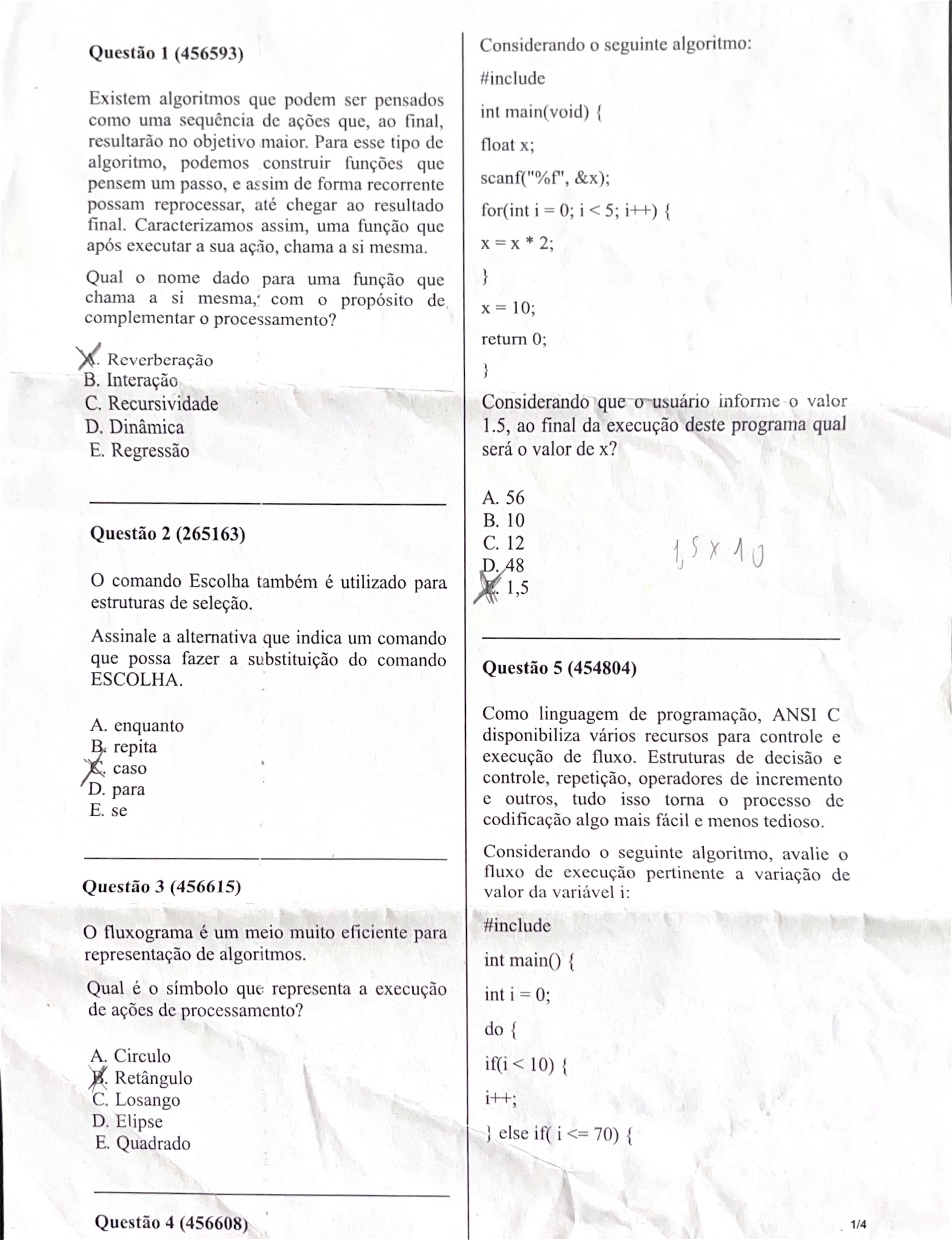 <p>Questão 1 (456593) Considerando o seguinte algoritmo: #include Existem algoritmos que podem ser pensados como uma sequência de ações que, ao final, int main(void) { resultarão no objetivo maior. Para esse tipo de float algoritmo, podemos construir funções que pensem um passo, e assim de forma recorrente scanf("%f", possam reprocessar, até chegar ao resultado for(int { final Caracterizamos assim, uma função que após executar a sua ação, chama a si mesma. Qual o nome dado para uma função que } chama a si mesma, com o propósito de X = 10; complementar o processamento? return Reverberação B. Interação } C. Recursividade Considerando que usuário informe o valor D. Dinâmica 1.5, ao final da execução deste programa qual E. Regressão será o valor de x? A. 56 B. 10 Questão 2 (265163) C. 12 D. 48 15x10 O comando Escolha também é utilizado para 1,5 estruturas de seleção. Assinale a alternativa que indica um comando que possa fazer a substituição do comando Questão 5 (454804) ESCOLHA. Como linguagem de programação, ANSI C A. enquanto repita disponibiliza vários recursos para controle e execução de fluxo. Estruturas de decisão e caso controle, repetição, operadores de incremento D. para E. se e outros, tudo isso torna o processo de codificação algo mais fácil e menos tedioso. Considerando o seguinte algoritmo, avalie o fluxo de execução pertinente a variação de Questão 3 (456615) valor da variável i: fluxograma é um meio muito eficiente para #include representação de algoritmos. int main() { Qual é o símbolo que representa a execução int de ações de processamento? do { A. Circulo B. Retângulo C. Losango D. Elipse E. Quadrado } else if( <= 70) { Questão 4 (456608) 1/4</p><p>nomenclatura. Assinale a alternativa que representa essa outra opção de nome para esse ( tipo de estrutura condicional: = 200; A. escolha optativa B. opção de caso múltipla escolha D. escolha seletiva valor de i é: %d", i); E. escolha de caso Assinale a alternativa que CORRETAMENTE apresenta o resultado da execução do método Questão 8 (454781) main: Quando precisamos definir variáveis A. valor de i é: 200 heterogênea, podendo assim manipular um Não haverá a geração de mensagem, pois a conjunto de variáveis a partir de uma única aplicação será interrompida na linha 10. variável, podendo serem de tipos diferentes, C. o bloco não será executado pois a utilizamos o recurso de registro. instrução da linha 10 não é suportada. Qual a palavra reservada para declarar D. A ficará em um laço infinito, por registros (vetores heterogêneos)? fim não haverá saída do programa. E. valor de i é: 7 A. udt B. struct C. stub Questão 6 (456606) D. alloc E. record Considerando o seguinte algoritmo: int main() Questão 9 (456559) { Ao construirmos aplicações mais complexas, buscamos dividir o código em blocos menores, que são chamados de função em return0; ANSI C, e assim conseguirmos uma maior legibilidade e facilidade de testes. Considerando a função imprime, que não Quantas vezes a mensagem possui retorno, qual protótipo está aparecerá na tela? devidamente declarado? A. 20 A. function imprime(); B. def void imprime(); C. function imprime(): d; D. N (Loop infinito) D. void imprime(); E. 0 E. function imprime(); Questão 7 (265006) Questão 10 (456563) Um dos tipos de estruturas condicionais que Analise o código abaixo: você estudou recebe o nome de seleção de caso, pois a partir de uma série de casos (opções), apenas um deve ser Essa 2/4 estrutura também costuma receber outra</p><p>for (int Qual é o nome dado aos operadores que são utilizados para realizarem comparação entre { valores? total = num * i; A. Aritméticos B. Conjunto } C. Binários D. Relacionais De acordo com o código acima, assinale a E. Lógicos alternativa que aponta quantas vezes o compilador executará o laço, ou seja, quantas vezes o programa executará as linhas de comando que estão dentro do laço. Questão 13 (456597) A. 10 Ainda falando a respeito de reutilização a B. 12 partir de recursos disponíveis na tecnologia C. 8 adotada. Compreender os recursos disponíveis D. 11 é imprescindível, pois pode evitar o E. 9 desenvolvido desnecessário. Em ANSI C, qual é a biblioteca que dispõe de funções relacionadas a operações Questão 11 (119537) matemáticas? Um programador está testando um novo A. string comando para um programa que está B. stdio desenvolvendo. Para continuar seu trabalho, C. stdlib primeiro precisa verificar se a fórmula D. math elaborada por ele é válida. Ele fez a validação E. time construindo uma tabela-verdade. Observe: Questão 14 (265092) p q Em relação à estrutura de repetição com V V variáveis de controle leia as assertivas a seguir V F e depois assinale a alternativa que representa a F V F F correta correlação entre a proposição se verdadeira (V) ou falsa (F). I. essa estrutura deve ser utilizada sempre que se conhece o início e o final das repetições, ou B. VFVF seja, sempre que se sabe quantas vezes o bloco irá se repetir antes de a execução acontecer. D. VVVF VFFV II. nesse tipo de estrutura, os blocos de comandos de repetição podem ficar distribuídos em várias linhas de código. Questão 12 (456614) III. na estrutura de repetição com variáveis de controle não é permitido a utilização de variáveis. Precisamos em muitas situações, controlar o fluxo de um algoritmo, baseado na relação de grandezas de variáveis, ou valores fixos, como A. as alternativas I, II e III estão incorretas ao checar se o saldo de uma conta corrente é B. a alternativa I e estão corretas e a maior ou igual ao valor do saque. alternativa III está incorreta 3/4</p><p>C. as alternativas I, II e III estão corretas D. somente a alternativa I está correta E. as alternativas I e III estão incorretas e a alternativa II está correta Questão 15 (456564) A linguagem proposicional dispõe de elementos que present
