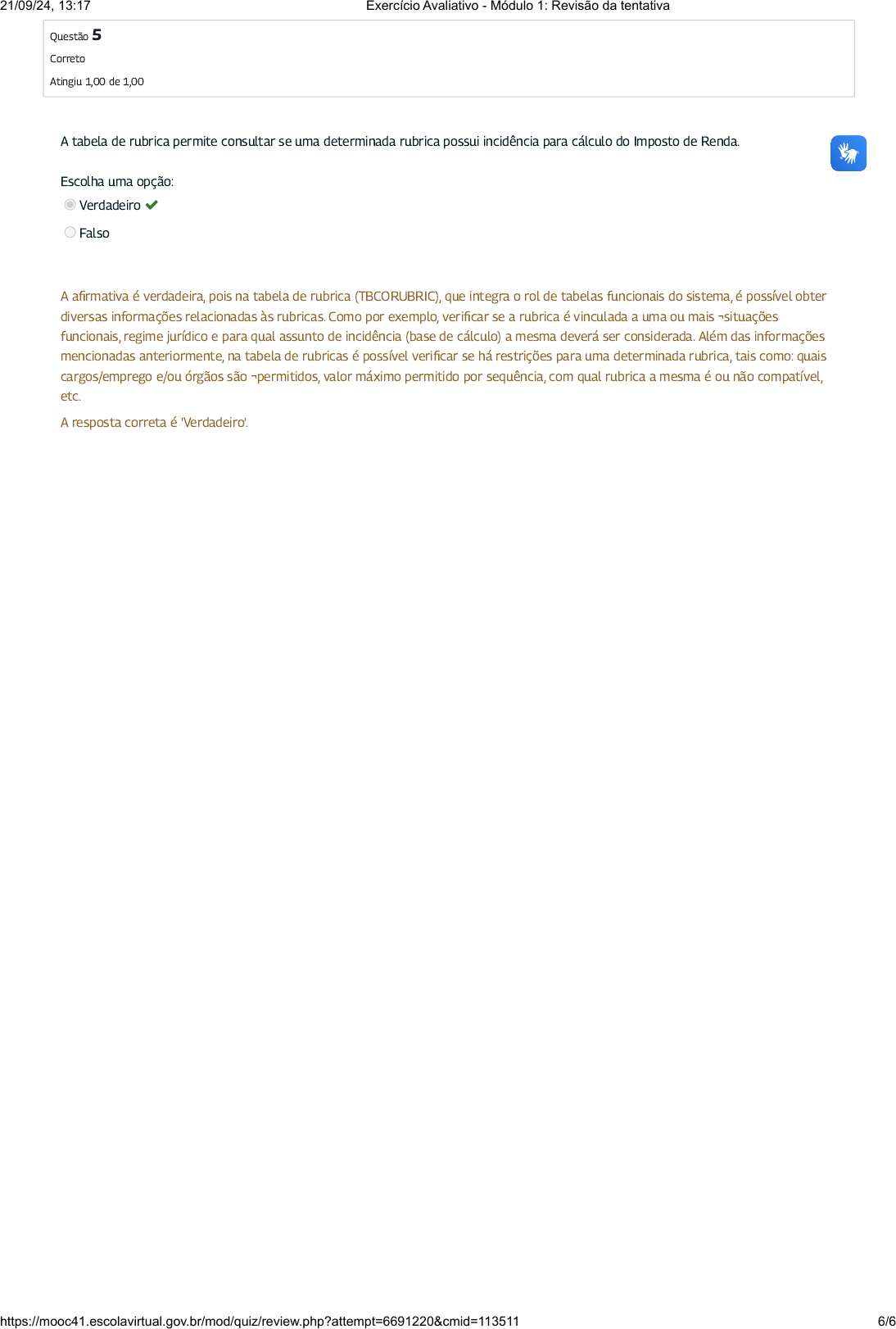 <p>Questão 5</p><p>Correto</p><p>Atingiu 1,00 de 1,00</p><p>A tabela de rubrica permite consultar se uma determinada rubrica possui incidência para cálculo do Imposto de Renda.</p><p>Escolha uma opção:</p><p>Verdadeiro </p><p>Falso</p><p>A a�rmativa é verdadeira, pois na tabela de rubrica (TBCORUBRIC), que integra o rol de tabelas funcionais do sistema, é possível obter</p><p>diversas informações relacionadas às rubricas. Como por exemplo, veri�car se a rubrica é vinculada a uma ou mais ¬situações</p><p>funcionais, regime jurídico e para qual assunto de incidência (base de cálculo) a mesma deverá ser considerada. Além das informações</p><p>mencionadas anteriormente, na tabela de rubricas é possível veri�car se há restrições para uma determinada rubrica, tais como: quais</p><p>cargos/emprego e/ou órgãos são ¬permitidos, valor máximo permitido por sequência, com qual rubrica a mesma é ou não compatível,</p><p>etc.</p><p>A resposta correta é 'Verdadeiro'.</p><p>21/09/24, 13:17 Exercício Avaliativo - Módulo 1: Revisão da tentativa</p><p>https://mooc41.escolavirtual.gov.br/mod/quiz/review.php?attempt=6691220&cmid=113511 6/6</p>