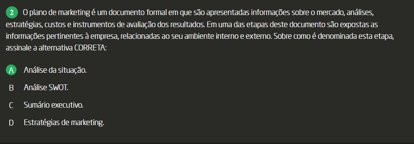 <p>2 0 plano de marketing é um documento formal em que são apresentadas informações sobre mercado, análises, estratégias, custos e instrumentos de avaliação dos resultados. Em uma das etapas deste documento são expostas as informações pertinentes à empresa, relacionadas ao seu ambiente interno e externo. Sobre como é denominada esta etapa, assinale a alternativa CORRETA: A Análise da situação. B Análise SWOT. C Sumário executivo. D Estratégias de</p>