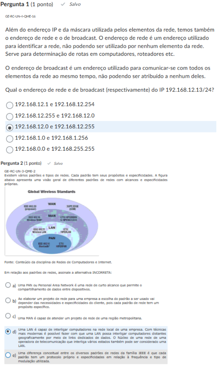 <p>Pergunta 1 (1 ponto) Salvo GE-RC-UN-4-QME-16 Além do endereço IP e da máscara utilizada pelos elementos da rede, temos também o endereço de rede e de broadcast. endereço de rede é um endereço utilizado para identificar a rede, não podendo ser utilizado por nenhum elemento da rede. Serve para determinação de rotas em computadores, roteadores etc. endereço de broadcast é um endereço utilizado para comunicar-se com todos os elementos da rede ao mesmo tempo, não podendo ser atribuído a nenhum deles. Qual o endereço de rede e de broadcast (respectivamente) do IP 192.168.12.13/24? 192.168.12.1 e 192.168.12.254 192.168.12.255 e 192.168.12.0 192.168.12.0 e 192.168.12.255 e 192.168.1.256 e 192.168.255.255 Pergunta 2 (1 ponto) Salvo Existem vários e tipos de redes. Cada tem seus propósitos e especificidades. A figura abaixo apresenta uma visão geral de diferentes padrões de redes com especificidades próprias. Global Wireless Standards WAN MAN LAN PAN PERPAN Fonte: da disciplina de Redes de Computadores e Em relação aos padrões de redes, assinale a alternativa INCORRETA: a) Uma PAN ou Personal Area Network é uma rede de curto alcance que permite o compartilhamento de dados entre dispositivos. Ao elaborar um projeto de rede para uma empresa a escolha do a ser usado b) depender das necessidades e especificidades do cliente, pois cada padrão de rede tem um propósito c) Uma MAN é capaz de atender um projeto de rede de uma região metropolitana. Uma LAN é capaz de computadores na rede local de uma empresa. Com técnicas d) mais modernas é possível fazer com que uma LAN possa computadores distantes geograficamente por de links dedicados de o Núcleo de uma rede de uma operadora de telecomunicação que interliga vários estados também pode ser considerado uma LAN. Uma diferença conceitual entre os diversos de redes da IEEE é que cada e) tem um protocolo próprio e especificidades em relação à frequência e tipo de modulação utilizada.</p><p>Pergunta 3 (1 ponto) Salvo Um ponto de acesso é um dispositivo de camada 2 que funciona como um hub A frequência é um compartilhado, pontos de acesso escutam todo o tráfego de rádio. Assim como no padrão 802.3 Ethernet, dispositivos que operam no padrão IEEE 802.11 WLAN também disputam o meio para transmitir. Apesar disso, diferentemente das placas de rede dispositivos de rádio em vez de detectarem colisões são criados para ROSS, K.W. Redes de Computadores a Internet: Uma abordagem Top-Down. ed. São Paulo: Addison Wesley, 2010 (adaptado) Sobre a operação dos padrões IEEE 802.3 802.11, avalie as afirmações a seguir. o padrão permite detecção de II. o método de acesso para o padrão é o enquanto o 802.11 faz uso de CSMA/CA. III. o padrão IEEE 802.11 usa o CSMA/CD como protocolo de acesso múltiplo ao IV. o quadro assim como o quadro uma verificação de (CRC) A transmissão no padrão IEEE 802.11 assim que a estação percebe que o canal está correto o que se afirma em: a) b) II. c) III, IV d) I, II e IV. e) III.</p><p>Pergunta 4 (1 ponto) GE-RC-UN-4-QME-1 A Camada de Rede trata de duas funções importantes: endereçamento e A primeira diz respeito à dos endereços de origem e destino dos dados a transmitir. A segunda está relacionada a escolhas associadas à determinação do melhor caminho a ser percorrido pela informação. Nesta camada, o fluxo de dados é em unidades denominadas o protocolo IP faz parte da camada de rede e é reconhecido e pelos fabricantes de computadores. Sobre comunicações de redes, avalie as afirmações a I - o protocolo IPV4 trabalha com endereçamentos de 32 bits II - o protocolo IPV6 tem suporte obrigatório de IPSEC III - o protocolo IPV6 trabalha com endereçamentos de 128 bits correto apenas o que se afirma em: a) II e III. b) c) II e III. d) III, apenas. e) II, apenas. Pergunta 5 (1 ponto) Salvo protocolo IPv4 possui mais de 4 bilhões de endereços, divididos em endereços válidos e endereços reservados (uso em redes internas). Em 1996, a American Registry for Internet Numbers (ARIN), órgão dos EUA responsável pelo registro dos endereços IP, informou que 100% dos endereços da classe A já estavam em uso, 62% da classe B e 37% da classe C. Isso deu a largada no desenvolvimento do IPv6. Qual campo do cabeçalho IPv6 que decrementa para evitar datagramas infinitos? Rótulo de fluxo. Limite de saltos. Flag. Classe de tráfego.</p><p>Pergunta 6 (1 ponto) Salvo protocolo IP é o responsável pelo endereço que permitirá o encaminhamento das informações pela rede. É utilizado na Internet para interconectar tipos heterogêneos de redes e é amplamente utilizado atualmente. De acordo com os conceitos apresentados no texto, assinale a alternativa verdadeira sobre o protocolo IP. a) protocolo IP faz parte da camada física. b) Uma das funções do protocolo IP é realizar transporte dos dados c) protocolo IP possui uma camada de criptografia chamada SSL. d) protocolo IP é o principal protocolo da camada de aplicação. e) Existem hoje dois formatos em uso: IPv4 e IPv6. Pergunta 7 (1 ponto) Salvo GE-RC-UN-4-QME-3 Qual é o protocolo utilizado no IPv4 para apenas reportar erros a origem? Esse protocolo roda na camada de rede e é encapsulado nos pacotes IP. a) UDP: User Datagram Protocol b) ICMP: Internet Control Message Protocol c) DHCP: Dynamic Host Confi guration Protocol d) IP: Internet Protocol e) TCP: Transmission Control Protocol</p><p>Pergunta 8 (1 ponto) Salvo GE-RC-UN-3-QME-6 Sobre as gerações de tecnologias celulares, qual a que fornece o serviço informado: "Prove uma solução baseada em IP, com suporte de dados e voz e, inclusive, transmissões multimídia, tais como: bate-papo (chat) com vídeo e TV em alta resolução (permitindo que você possa até mesmo assistir a qualquer um dos canais de sua TV por assinatura pelo celular)." a) 4G b) 5G c) 3G d) 2,5G e) 2G Pergunta 9 (1 ponto) Salvo GE-RC-UN-4-QME-8 "é um protocolo de roteamento por vetor de 