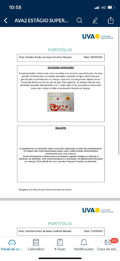 <p>10:58 4G AVA2 ESTÁGIO SUPER.. UVA Universidade Veigo de PORTFÓLIO Aula: Caroline Evelyn de Assis Coutinho Macedo Data: 23/03/2023 ATIVIDADE VIVENCIADA Foi apresentado a mistura das cores vermelho com amarelo, que dá laranja. Em uma garrafa, foi misturado os corantes vermelho e amarelo na água, dentro de uma garrafa pet e mostrado para as crianças. Após isso, foi perguntado objetos da laranja de dentro ou fora da sala de aula. Para registrar, as crianças fizeram uma atividade chamada "descobrindo a onde cada um fez sua própria mistura das cores com a tinta na folha e um desenho livre da laranja. RECORTE o experimento e a atividade foram muito bem elaborados e tudo fluiu Os alunos são muito interessados pelas cores, então ficaram deslumbrados conhecendo uma nova mistura. Achei interessante a forma como a professora regente instigou as crianças a participar da com muito entusiasmo e animação, transparecendo isso para as crianças. Esta atitude fez com que eles ficassem focados na Estagiária: Ana Clara Teixeira Azevedo dos Santos UVA Universidade Veiga de Almeido PORTFÓLIO Aula: Caroline Evelyn de Assis Coutinho Macedo Data: 31/03/2023 69 000 000 Painel de CO... Calendário A Fazer Notificações Caixa de ent...</p><p>10:58 4G AVA2 ESTÁGIO SUPER... as com que Estagiária: Ana Clara Amaral Teixeira Azevedo dos Santos UVA Universidade Veigo de Almeido PORTFÓLIO Aula: Caroline Evelyn de Assis Coutinho Macedo Data: 31/03/2023 ATIVIDADE VIVENCIADA Na atividade do dia, lemos um livro chamado "Tatu-balão" para as crianças. Após isso, elas tiveram que recontar a história que tinham ouvido: "Era uma vez um tatu- bola que vivia triste. Ele sonhava em ser balão. Todos os dias ele subia uma montanha e se jogava e descia rolando e batia com a cara no chão. Um dia ele encontrou o menino Damião que gostava de soltar pipa no azul (céu). E tatu agarrou na rabiola e voou feito um Ele ficou feliz e coração acelerado. Os dois ficaram amigos e ficaram rolando subindo e descendo a E fim!" Para finalizar a atividade, eles fizeram um desenho sobre livro em metade de uma folha de papel. Fizemos um cartaz com a história recontada por eles e os RECORTE É muito importante que as crianças tenham hábito da leitura, por isso, salientar esse hábito desde a Educação Infantil é de extrema Com a atividade de recontar a história lida, pude notar quem realmente prestou atenção na história e quis participar da Ter essa visão individualizada é ótimo para perceber as características de cada aluno no momento das Estagiária: Ana Clara Amaral Teixeira Azevedo dos Santos 69 Painel de CO... Calendário A Fazer Notificações Caixa de ent...</p><p>10:59 4G Portfolio X DOCX - 28 KB RELATÓRIOS PIBID - UVA - EM SÃO TOMAS DE AQUINO PORTFÓLIO Aula: Datas / / ATIVIDADE VIVENCIADA Neste espaço colocamos o nome da atividade, o objetivo, o material utilizado e tempo de duração (se possível) Bolsista RECORTE Como a atividade foi recebida e percebida pela criança. Com riqueza de detalhes. Abrir o Office</p>