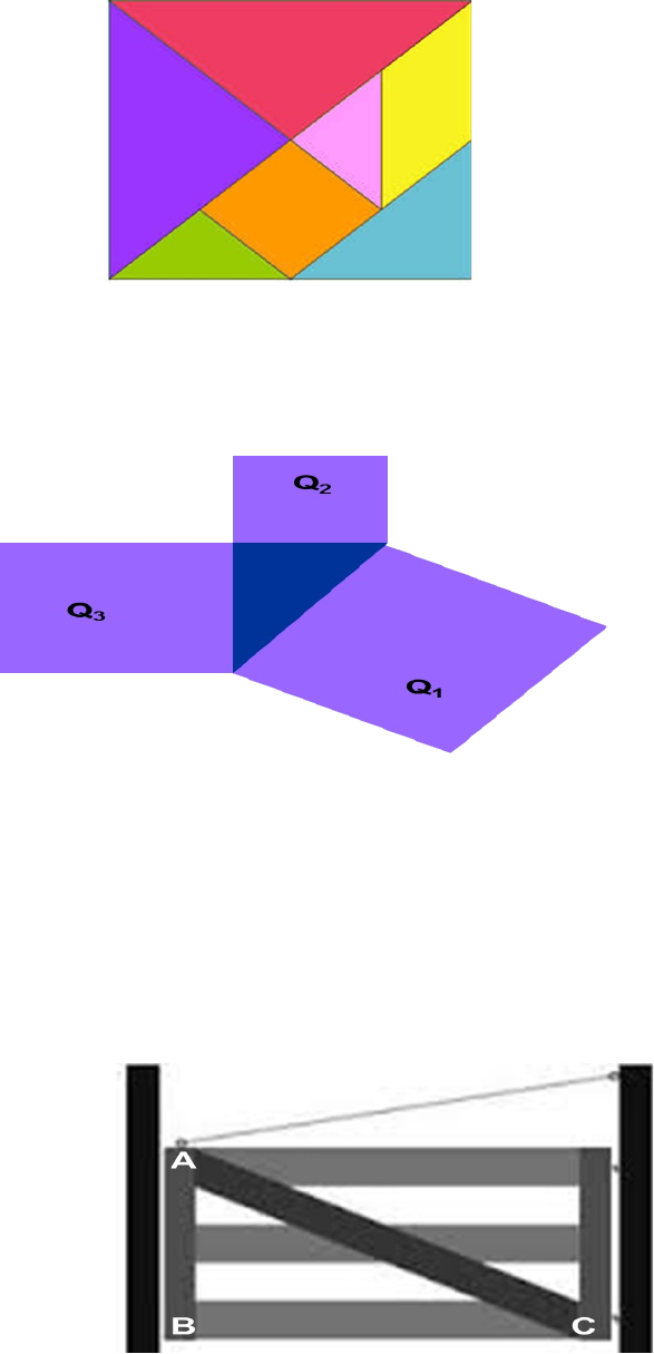 <p>TEOREMA DE PITÁGORAS</p><p>Questão 1</p><p>O Tangram é um quebra-cabeça chinês no qual o objetivo é posicionar as 7 peças, que são</p><p>chamadas de “TANS”, para formar uma determinada figura.</p><p>Observando a imagem do Tangram acima, podemos afirmar que a mesma possui quantos</p><p>triângulos retângulos?</p><p>(A) 2</p><p>(B) 3</p><p>(C) 5</p><p>(D) 7</p><p>Questão 2</p><p>Na figura ao lado, a área do quadrado Q1 é 625 unidades, e a área do quadrado Q3 é 400</p><p>unidades.</p><p>Qual é a área do quadrado Q2?</p><p>(A) 225 unidades</p><p>(B) 800 unidades</p><p>(C) 1 025 unidades</p><p>(D) 1 250 unidades</p><p>Questão 3</p><p>Observe o portão de entrada da casa que tem 3 m de altura (segmento AB) e 4 m de</p><p>comprimento (segmento BC).</p><p>Qual a medida da trave que se estende do ponto A ao ponto C (segmento AC)?</p><p>(A) 2 m</p><p>(B) 5 m</p><p>(C) 8 m</p><p>(D) 12 m</p><p>Questão 4</p><p>Pitágoras foi um filósofo e matemático grego, nasceu em Samos, por volta de 571 e 570 a.C.</p><p>Ele criou uma escola batizada com seu nome – Escola Pitagórica. E, curiosamente, foi ele</p><p>quem elaborou o termo “filósofo”. Desenvolveu vários trabalhos que contribuíram para o</p><p>desenvolvimento científico e tecnológico nos dias atuais, dentre eles, o Teorema de</p><p>Pitágoras. E, curiosamente, foi ele quem elaborou o termo “filósofo”.</p><p>Em qual figura geométrica podemos aplicar o teorema citado?</p><p>(A) Pentágono</p><p>(B) Quadrado</p><p>(C) Retângulo</p><p>(D) Triângulo retângulo</p><p>Questão 5</p><p>Triângulo é uma figura geométrica formada por três retas que se encontram duas a duas e</p><p>não passam pelo mesmo ponto, formando três lados e três ângulos.</p><p>Como são chamados os lados de um triângulo retângulo?</p><p>(A) altura e diagonal.</p><p>(B) altura e hipotenusa.</p><p>(C) catetos e diagonal.</p><p>(D) catetos e hipotenusa.</p><p>Questão 6</p><p>Cúbito: unidade de média de comprimento, usado pelos antigos egípcios, correspondente ao</p><p>comprimento entre a extremidade do cotovelo e a ponta do dedo médio.</p><p>Resolva um dos problemas encontrados nesse papiro: Uma escada de 10 cúbitos está com</p><p>seus pés a 6 cúbitos da parede.</p><p>Que distância a escada alcança?</p><p>(A) 6 cúbitos</p><p>(B) 8 cúbitos</p><p>(C) 10 cúbitos</p><p>(D) 16 cúbitos</p><p>Questão 7</p><p>Um terreno tem a forma do quadrilátero ABCD da figura ao lado. Uma medição feita nesse</p><p>terreno mostra, em metros, as medidas encontradas.</p><p>Qual o perímetro desse terreno?</p><p>(A)</p><p>(B)</p><p>(C)</p><p>(D)</p><p>Questão 8</p><p>Um ciclista acrobático vai atravessar de um prédio a outro com uma bicicleta especial,</p><p>percorrendo a distância sobre um cabo de aço, como demonstra o esquema a seguir:</p><p>Qual é a medida mínima do comprimento do cabo de aço?</p><p>(A) 40m</p><p>(B) 42m</p><p>(C) 55m</p><p>(D) 65m</p><p>Questão 9</p><p>Carlos e Frederico estão brincando no balanço, como indica a figura. A altura máxima a que</p><p>pode subir cada um dos amigos é 60cm.</p><p>Qual o comprimento do balanço?</p><p>(A) 1,9m</p><p>(B) 2,4m</p><p>(C) 3,6m</p><p>(D) 7,8m</p><p>Questão 10</p><p>O acesso a uma garagem situada no subsolo de uma casa é feito por rampa, conforme</p><p>mostra o desenho. Sabe-se que a rampa AC tem 10,25 metros de comprimento e a altura BC</p><p>da garagem é 2,25 metros.</p><p>Qual é a medida da distância AB entre o portão e a entrada da casa?</p><p>(A) 32,75 metros</p><p>(B) 12,5 metros</p><p>(C) 10 metros</p><p>(D) 8 metros</p>