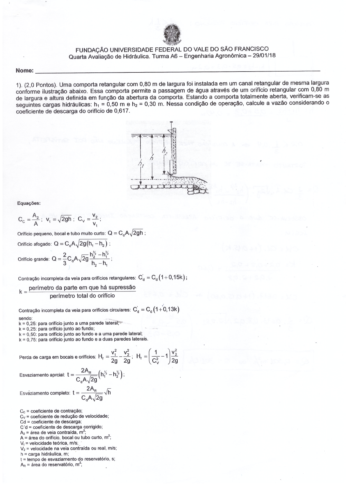 (Melo Porto, 1999). Um reservatório de barragem, com nível d´água na cota 545,00 m está em conexão com uma câmara de subida de peixes, através de um orifício circular com diâmetro D1 = 0,50 m. Essa câmara descarrega na atmosfera, por outro orifício circular de diâmetro D2 = 0,70 m., com centro na cota 530,00 m. Após certo tempo, cria-se um regime permanente (níveis constantes). Sabendo-se que os coeficientes de contração dos dois orifícios são iguais a CC = 0,61 e os coeficientes de velocidade, iguais a CV = 0,98, calcular qual é a vazão de regime e o nível d´água na câmara de subida de peixes. R: Q = 1,80 m 3 s -1 ; X = 533,10 m D1 D2 545,0 m X 530,0 m 16). (AVA_2013-2). Em uma sequência de três depósitos ligados entre si por orifícios afogados e de paredes finas, dos quais os extremos têm níveis constantes, determine o nível de água (x) no reservatório intermediário e a vazão através dos orifícios quando se estabelece um escoamento em regime permanente. Admitir que os depósitos sejam de grandes dimensões e que o coeficiente de descarga dos dois orifícios, o primeiro circular de diâmetro igual a 200 mm e o segundo quadrado de lado igual 200 mm, seja Cd = 0,61, independente da posição em relação ao fundo. 0 m 2 m x = ? 3 m Q0 ,5 m orifício circular orifício quadrado Q R: x = 2,38 m; Q = 66,8 l/s 18). (AVA_2014-1). Na parede vertical do reservatório A de grandes dimensões da figura existe um orifício afogado (1) que deságua em um reservatório B. Este por sua vez possui também um orifício (2) de parede delgada que deságua livremente na atmosfera. Supondo regime permanente e sabendo-se que a altura h indicada na figura vale 5 m, calcular: a). os valores de H1 e H2; b). a vazão de escoamento. Dados: Cv1 = Cv2 = 0,98; Cc1 = Cc2 = 0,61; A1 = 2 cm 2 ; A2 = 4 cm 2 Q (1) (2) Q A B h H 1 H 2 R: a). H1 = 4 m; H2 = 1m; b). Q = 1,06 l/s