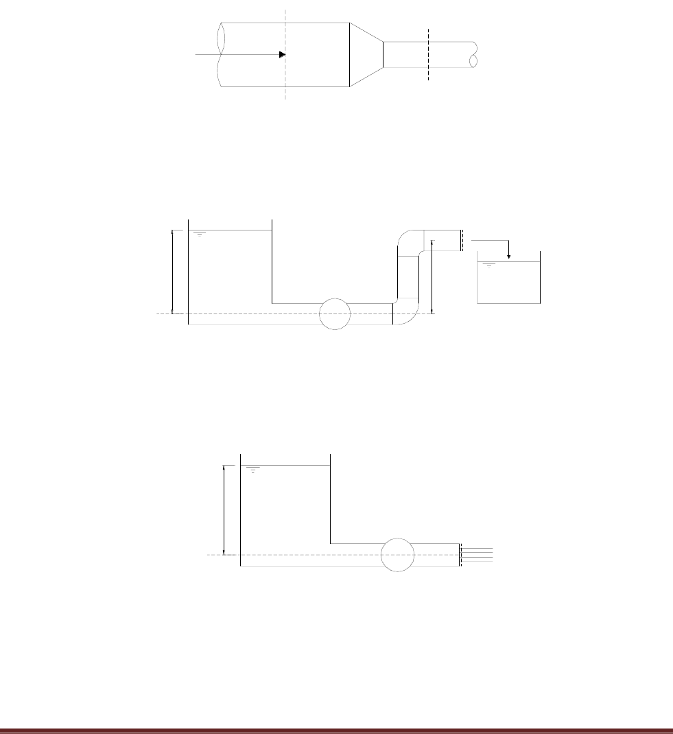 <p>Prof. Dr. Eliezer Santurbano Gervásio – Engenharia de Água na Agricultura - UNIVASF 1</p><p>3</p><p>Hidráulica - Hidrodinâmica</p><p>(Exercícios)</p><p>1). (Brunetti, 2005). Um gás escoa em regime permanente no trecho de tubulação da figura. Na seção (1),</p><p>tem-se A1 = 20 cm2, 1 = 4 kg m-3 e v1 = 30 m s-1. na seção (2), A2 = 10 cm2 e 2 = 12 kg m-3. Qual é a</p><p>velocidade na seção (2)?</p><p>R: v2 = 20m s-1</p><p>(1)</p><p>(2)</p><p>gás</p><p>2). (Adaptado de Brunetti, 2005). O reservatório de grandes dimensões da figura fornece água para o tanque</p><p>indicado com uma vazão de 10 L s-1. Verificar se a máquina instalada é bomba ou turbina. Supor fluido ideal.</p><p>Dados: γágua = 10000 N m-3; Atubo = 10 cm2; g = 10 m s-2.</p><p>R: Turbina (HT = 10 m)</p><p>M</p><p>5</p><p>m2</p><p>0</p><p>m</p><p>(1)</p><p>(2)</p><p>PHR</p><p>Q</p><p>3). (Adaptado de Brunetti, 2005). Na instalação da figura, a máquina é uma bomba e o fluido é água. A água</p><p>é descarregada à atmosfera com uma velocidade de 5 m s-1. Determinar a perda de carga do fluido entre (1)</p><p>e (2).</p><p>Dados: HB = 80 m; γágua = 10000 N m-3; g = 10 m s-2.</p><p>R: Hf = 83,75 m</p><p>B</p><p>5</p><p>m</p><p>(1)</p><p>(2)</p><p>PHR</p><p>Prof. Dr. Eliezer Santurbano Gervásio – Engenharia de Água na Agricultura - UNIVASF 2</p><p>4). (Brunetti, 2005). A água escoa em regime permanente no venturi da figura. No trecho considerado,</p><p>supõem-se as perdas por atrito desprezíveis e as propriedades uniformes nas seções. A área (1) é 20 cm2</p><p>enquanto a da garganta (2) é 10 cm2. Um manômetro cujo fluido manométrico é mercúrio é ligado entre as</p><p>seções (1) e (2) e indica o desnível mostrado na figura. Pede-se a vazão da água pelo venturi.</p><p>Dados: γHg = 136000 N m-3; γágua = 10000 N m-3</p><p>R: Q = 5,8 L s-1</p><p>h</p><p>=</p><p>1</p><p>0</p><p>c</p><p>m</p><p>H2O</p><p>(1)</p><p>(2)</p><p>Hg</p><p>5). (Adaptado de Brunetti, 2005). Na instalação da figura verificar se a máquina é uma bomba ou uma</p><p>turbina. Sabe-se que a pressão indicada por um manômetro instalado na seção (2) é 0,16 MPa, a vazão é 10</p><p>L s-1, a área da seção dos tubos é 10 cm2 e a perda de carga entre as seções (1) e (4) é 2 m. Não é dado o</p><p>sentido do escoamento.</p><p>Dados: γágua = 10000 N m-3; g = 10 m s-2</p><p>R: Bomba (HB = 26 m)</p><p>M</p><p>(1)</p><p>(2)</p><p>(4)</p><p>0,16 MPa</p><p>1</p><p>0</p><p>m</p><p>1</p><p>0</p><p>m</p><p>4</p><p>m</p><p>PHR</p><p>6). (Azevedo neto et al., 1998). Verificou-se que a velocidade econômica para uma extensa linha de recalque</p><p>é 1,05 m s-1. A vazão necessária a ser fornecida pela bomba é de 450 m3 h-1. Determinar o diâmetro da linha.</p><p>R: D = 0,39 m</p><p>7. (Azevedo Neto et al., 1998). Em um edifício de 12 pavimentos, a vazão máxima provável, devida ao uso de</p><p>diversos aparelhos, em uma coluna de distribuição de 60 mm de diâmetro, é de 7,5 L s-1. Determinar a</p><p>velocidade de escoamento.</p><p>R: v = 2,65 m s-1</p><p>8). A água escoa pelo tubo indicado na figura, cuja seção varia do ponto (1) para o ponto (2), de 100 cm2</p><p>para 50 cm2. Em (1), a pressão é de 0,5 kgf cm-2 e a elevação de 100 m em relação ao PHR, ao passo que,</p><p>no ponto (2), a pressão é de 3,38 kgf cm-2 na elevação 70. Calcular a vazão em litros por segundo.</p><p>Dados: γágua = 1000 kgf m-3; g = 9,8 m s-2</p><p>R: Q = 28 L s-1</p><p>(2)</p><p>(1)</p><p>PHR</p><p>Q</p><p>Prof. Dr. Eliezer Santurbano Gervásio – Engenharia de Água na Agricultura - UNIVASF 3</p><p>9). (Baptista e Lara, 2003). Por um canal retangular de 2 m de largura, com seu fundo posicionado a 20 m do</p><p>nível de referência escoam 3 m3 s-1 de água a uma profundidade de 1,8 m. Calcular a energia hidráulica total</p><p>na superfície da água em relação ao nível de referência.</p><p>Dado: g = 10 m s-2</p><p>R: 21,83 m</p><p>10). (Baptista e Lara, 2003). Um canal retangular com 5 m de largura transporta uma vazão de 10 m3 s-1 ao</p><p>longo de 1 km de extensão. O canal tem início na cota 903,0 m onde a lâmina d´água é de 1 m. Supondo que</p><p>na seção final do canal a cota seja 890,0 m e a velocidade média 3 m s-1, pede-se calcular a perda de carga</p><p>total entre o início e o término do canal.</p><p>Dado: g = 10 m s-2</p><p>R: Hf = 13,08 m</p><p>11). (Azevedo Neto et al., 1998). Tome-se o sifão da figura. Retirado o ar da tubulação por algum meio</p><p>mecânico ou estando a tubulação cheia, abrindo-se C pode-se estabelecer condições de escoamento, de A</p><p>para C, por força da pressão atmosférica. Supondo a tubulação com diâmetro de 150 mm, calcular a vazão e</p><p>a pressão no ponto B, admitindo que a perda de carga no trecho AB é 0,75 m e no trecho BC é 1,25 m.</p><p>R: Q = 0,124 m3 s-1; PB/γ = - 5,05 m</p><p>B</p><p>4</p><p>,5</p><p>m</p><p>1</p><p>,8</p><p>m</p><p>Água</p><p>A</p><p>C</p><p>12). (AVA1_2007-2). Um conduto é constituído por dois trechos, com diâmetros de 0,25 e 0,20 m, como</p><p>mostra a figura. Sabendo-se que a pressão no ponto A é de 1,5 kgf cm-2 e que a velocidade no trecho de</p><p>maior diâmetro é de 0,6 m/s, calcule a vazão no conduto e a pressão no ponto B. (supor movimento sem</p><p>atrito). Dado: γágua = 1000 kgf m-3</p><p>1</p><p>0</p><p>m</p><p>água</p><p>A</p><p>B</p><p>R: Q = 29,45 L s-1; PB = 24974 kgf m-2</p><p>Prof. Dr. Eliezer Santurbano Gervásio – Engenharia de Água na Agricultura - UNIVASF 4</p><p>13). (AVA1_2008-1). Calcular a vazão e a pressão nos pontos (A) e (B) do esquema a seguir, sendo dados:</p><p>- diâmetro da tubulação = 5 cm;</p><p>- perda de carga do reservatório (1) ao ponto (A) = 3,5 m;</p><p>- perda de carga do ponto (A) ao ponto (B) = 4,5 m;</p><p>- perda de carga do ponto (B) ao ponto (C) = 6,0 m;</p><p>- g = 9,81 m s-2; γágua = 1000 kgf m-3</p><p>1</p><p>PHR</p><p>A</p><p>B</p><p>C</