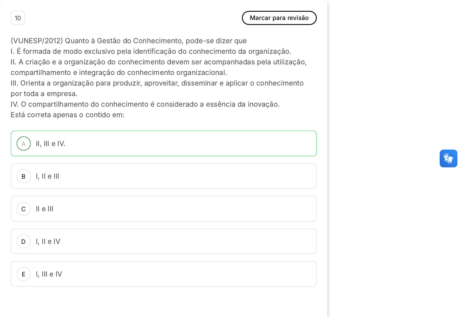 <p>A</p><p>B</p><p>C</p><p>D</p><p>E</p><p>10 Marcar para revisão</p><p>�VUNESP/2012� Quanto à Gestão do Conhecimento, pode-se dizer que</p><p>I. É formada de modo exclusivo pela identificação do conhecimento da organização.</p><p>II. A criação e a organização do conhecimento devem ser acompanhadas pela utilização,</p><p>compartilhamento e integração do conhecimento organizacional.</p><p>III. Orienta a organização para produzir, aproveitar, disseminar e aplicar o conhecimento</p><p>por toda a empresa.</p><p>IV. O compartilhamento do conhecimento é considerado a essência da inovação.</p><p>Está correta apenas o contido em:</p><p>II, III e IV.</p><p>I, II e III</p><p>II e III</p><p>I, II e IV</p><p>I, III e IV</p><p>Resposta correta</p><p>Parabéns, você selecionou a alternativa correta. Confira o gabarito comentado!</p><p>Gabarito Comentado</p><p>A afirmativa I está incorreta porque a gestão do conhecimento não é formada</p><p>exclusivamente pela identificação do conhecimento da organização. O conhecimento</p><p>pode ter origem externa à organização ou pode surgir e evoluir internamente a partir</p><p>de conhecimentos não identificados previamente. As afirmativas II, III e IV estão</p><p>corretas. A II destaca a importância do uso, compartilhamento e integração do</p><p>conhecimento na organização. A III ressalta o papel orientador da gestão do</p><p>conhecimento para a produção, aproveitamento, disseminação e aplicação do</p><p>conhecimento em toda a empresa. A IV enfatiza que o compartilhamento do</p><p>conhecimento é a essência da inovação.</p>