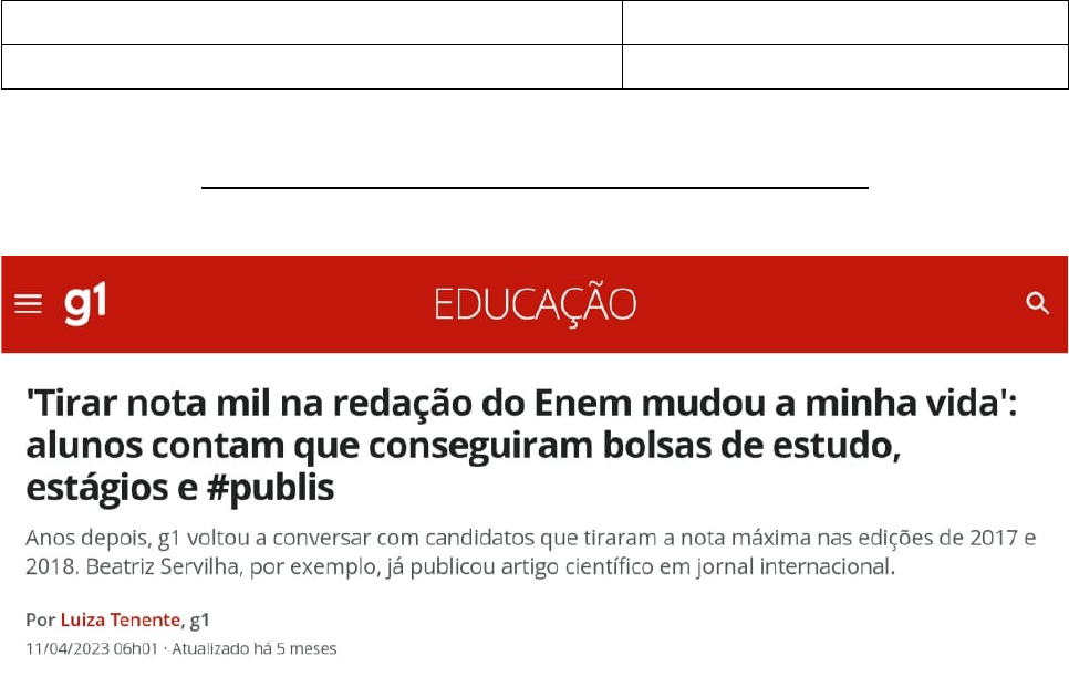 <p>NOME: Jaiane Rodrigues de Freitas Borges MATRÍCULA: 23216080086</p><p>POLO: Volta Redonda E-MAIL: jaiane.tst@gmail.com</p><p>AD1 – SOCIOLOGIA & EDUCAÇÃO</p><p>‘Tirar nota mil na redação do Enem mudou a minha vida’: alunos</p><p>contam que conseguiram bolsas de estudo, estágios e #publis</p><p>Anos depois, g1 voltou a conversar com candidatos que tiraram a nota máxima nas</p><p>edições de 2017 e 2018. Beatriz Servilha, por exemplo, já publicou artigo científico em</p><p>jornal internacional.</p><p>Por Luiza Tenente, g1</p><p>11/04/2023 06h01 Atualizado há 5 meses</p><p>Beatriz Servilha, de 24 anos, conversou com o g1 em 2018, quando ficou entre os 53</p><p>candidatos (de um universo de quase 7 milhões de inscritos) que tiraram nota mil na</p><p>redação do Exame Nacional do Ensino Médio (Enem). À época, ela contou que sempre</p><p>falava ao pai, pedreiro, e à mãe, telefonista, que “filha de pobre também pode ser</p><p>médica”.</p><p>E tinha razão: 5 anos depois, Beatriz conta, orgulhosa, que trabalha como pediatra em um</p><p>estágio supervisionado no serviço público de saúde. Estudante do 8º período de medicina</p><p>da Universidade Federal do Rio de Janeiro (UFRJ), ela já ouve elogios dos familiares de</p><p>seus pacientes, por causa da atenção especial que dá a crianças com deficiência. E não</p><p>para por aí: Bia tem até artigo científico sobre pneumologia publicado em um jornal</p><p>internacional.</p><p>“Quando me lembro do Enem, reconheço que tudo o que tenho hoje veio disso. Acho que,</p><p>se os frutos [da repercussão da nota mil] não fossem tão palpáveis, eu pensaria que</p><p>foram um sonho”, diz.</p><p>Nesta reportagem, o g1 conta a história de Beatriz e de mais dois candidatos que, depois</p><p>de alcançarem o desempenho máximo na redação do exame, tiveram suas vidas</p><p>transformadas:</p><p>• Lucas Felpi estuda na Universidade de Michigan e já fechou parcerias com marcas</p><p>grandes em ações de educação;</p><p>• E Bernardo Piñon, aluno da PUC-Rio com surdez e autismo, foi convidado para um</p><p>programa de iniciação científica do governo (spoiler: vai pesquisar sobre a saga</p><p>“Star Wars”).</p><p>Beatriz, nota mil no Enem 2017, sonha com o doutorado</p><p>Veja, abaixo, os principais marcos na vida de Beatriz desde a nota mil no Enem.</p><p>• Artigo científico publicado em periódico internacional:</p><p>Após acompanhar as notícias sobre a nota mil de Beatriz, uma professora da UFRJ a</p><p>convidou para fazer parte de um projeto de pesquisa do ambulatório de pneumologia</p><p>pediátrica da universidade.</p><p>“Ela precisava de um aluno e sabia que eu escrevia bem. Foi lá que fiz meu primeiro</p><p>artigo, como colaboradora das minhas orientadoras”, conta Bia. O trabalho, publicado no</p><p>“Journal of Asthma and Allergy” neste ano, analisava dados de espirometria (exame de</p><p>pulmão) de crianças com asma.</p><p>• Atendimentos a crianças com autismo e surdez:</p><p>No estágio, Beatriz recebeu comentários elogiosos de mães de pacientes com deficiência,</p><p>pelo atendimento humanizado que ofereceu.</p><p>“O autismo tem mexido muito comigo. Foram episódios em que as crianças queriam gritar,</p><p>bater, mas foram se acalmando conforme eu ia conversando com elas. Eu escolhi</p><p>medicina por isso, é o que realmente me prende: fazer tudo de uma forma afetiva. No</p><p>caso da surdez, eu consegui me dirigir diretamente aos pacientes [em Libras]. Eles me</p><p>agradeceram muito.”</p><p>• Morte da mãe, de 38 anos, por Covid-19:</p><p>Desde que a mãe de Beatriz morreu durante a pandemia, em 2020, a aluna ajuda na</p><p>criação da irmã, de 15 anos.</p><p>"[Perder minha mãe] foi uma experiência horrível, um baque como pessoa e como</p><p>profissional. Aprendi que a medicina não vai sempre trazer os resultados 100% positivos.</p><p>Tem momento em que a gente só para e chora", diz.</p><p>• Superação de dificuldades na universidade:</p><p>Como ex-aluna de escola pública e cotista na UFRJ, Beatriz tinha defasagens em sua</p><p>formação e, por isso, foi reprovada duas vezes em uma mesma disciplina, no início do</p><p>curso.</p><p>“Eu demorei para entender que era uma questão estrutural e social. Nunca tinha visto</p><p>aqueles conteúdos na minha vida”, diz.</p><p>“Foi só no estágio que mudei o olhar sobre mim e deixei de me sentir inferior. Agora,</p><p>sonho em manter meu projeto de pesquisa e entrar no doutorado para pesquisar sobre a</p><p>capacidade pulmonar de crianças, antes e depois do transplante de medula óssea”, diz.</p><p>Lucas, nota mil no Enem 2018, estuda na Universidade de Michigan</p><p>Lucas Felpi, atualmente com 21 anos, destacou-se no Enem 2018 não só por ter tirado a</p><p>nota máxima, mas também por ter citado a série “Black Mirror” na dissertação.</p><p>Depois disso, houve uma sequência de (outros) sucessos:</p><p>• Lançamento de apostilas do Enem e de curso de redação:</p><p>Lucas teve a ideia de entrar em contato com outros alunos “notas mil” para reunir, em</p><p>uma apostila virtual e gratuita, transcrições de suas redações. “A ideia era democratizar o</p><p>acesso aos textos para ajudar quem estivesse estudando”, conta. O projeto, que é</p><p>atualizado todo ano, existe desde 2019.</p><p>O jovem ainda montou um curso on-line de redações, junto com uma de suas professoras</p><p>do ensino médio. Mais de 1.200 alunos já usaram a plataforma no preparo para o Enem.</p><p>• Canal no Youtube e parceria com marcas:</p><p>Logo quando soube da nota mil, Lucas decidiu criar um canal de vídeos para dar dicas de</p><p>estudo e depoimentos sobre sua experiência acadêmica. Até a última atualização desta</p><p>reportagem, eram 565 mil inscritos. Foi desse sucesso que vieram convites para parcerias</p><p>com marcas grandes, como Uber, Americanas e Deezer.</p><p>“Por mais de um 