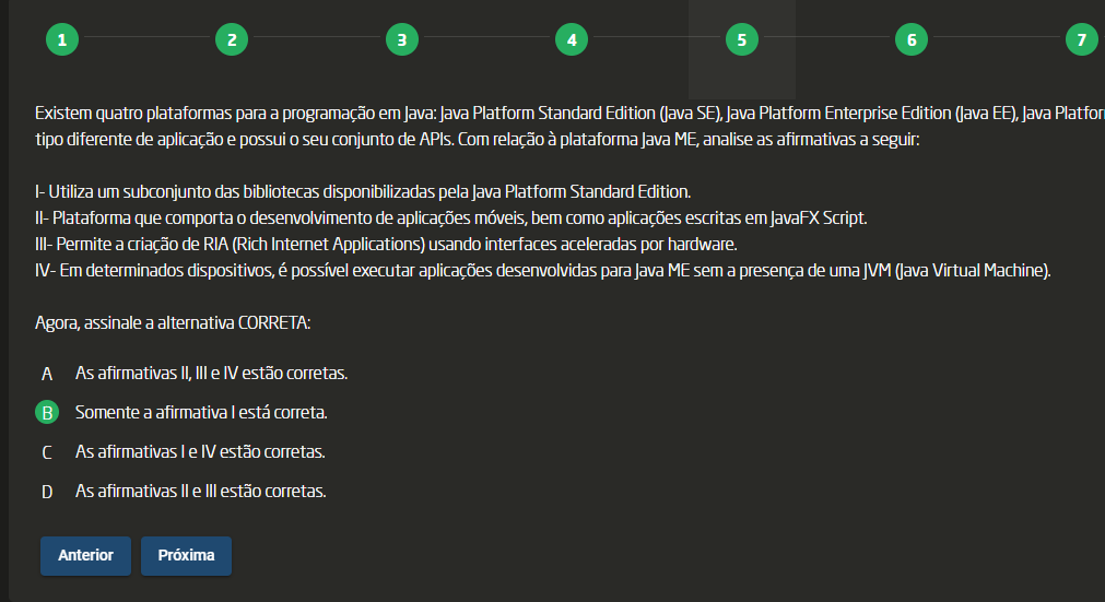 <p>1 2 3 4 5 6 7 Existem quatro plataformas para a programação em Java: Java Platform Standard Edition (Java SE), Java Platform Enterprise Edition (Java EE), Platfor tipo diferente de aplicação e possui seu conjunto de APIs. Com relação à plataforma Java ME, analise as afirmativas a seguir: Utiliza um subconjunto das bibliotecas disponibilizadas pela Java Platform Standard II- Plataforma que comporta desenvolvimento de aplicações móveis, bem como aplicações escritas em JavaFX Script. III- Permite a criação de RIA (Rich Internet Applications) usando interfaces aceleradas por hardware. IV- Em determinados dispositivos, é possível executar aplicações desenvolvidas para Java ME sem a presença de uma IVM (Java Virtual Machine). Agora, assinale a alternativa CORRETA: A As afirmativas II, III e IV estão corretas. Somente a afirmativa I está correta. As afirmativas I e IV estão corretas. D As afirmativas II e III estão corretas. Anterior Próxima</p>